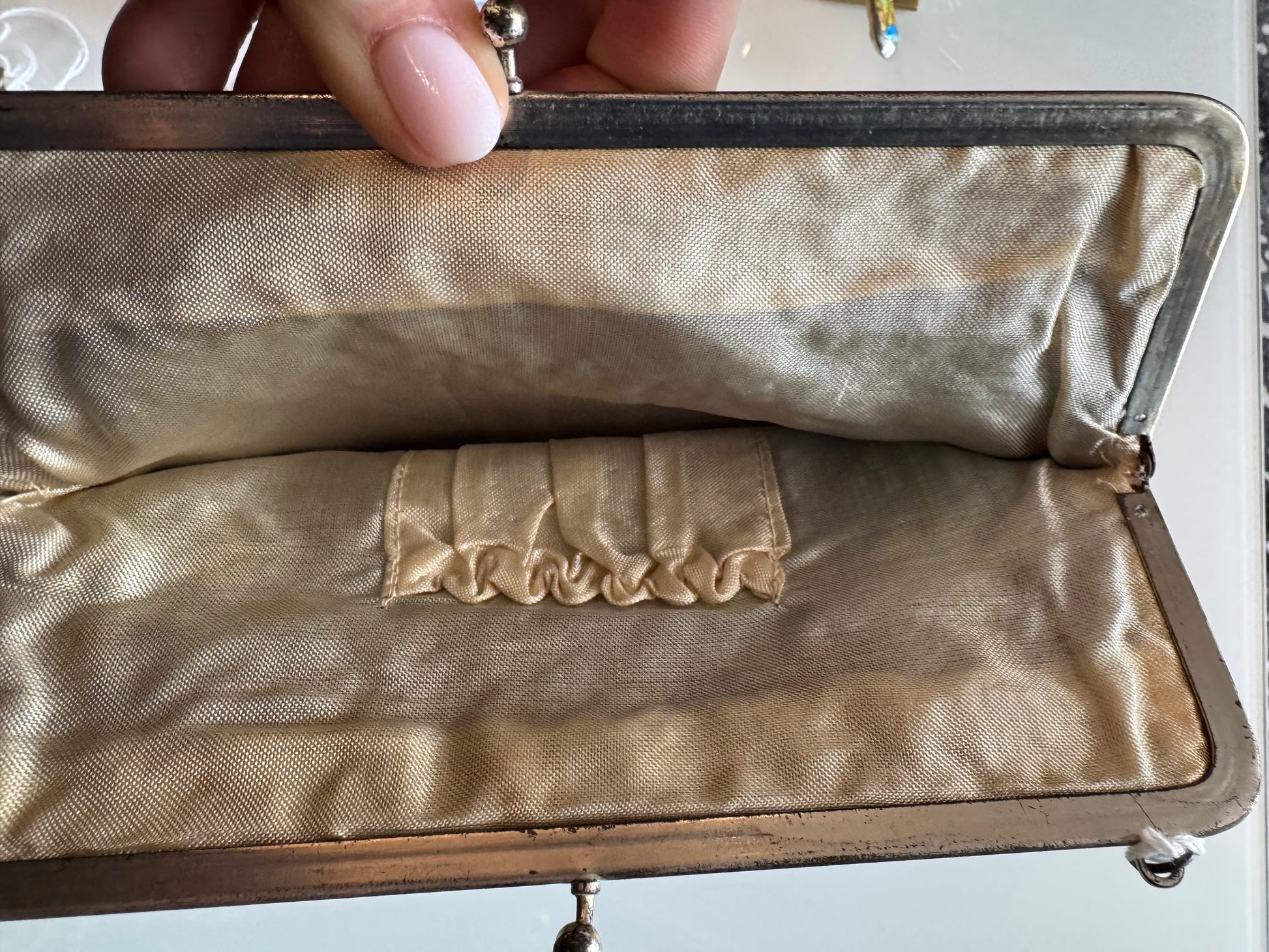 1920s vintage flapper bag with blue green red, yellow and turquoise beads. Metal hardware.