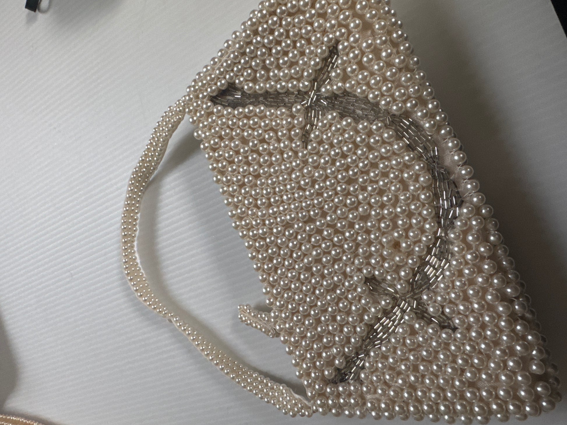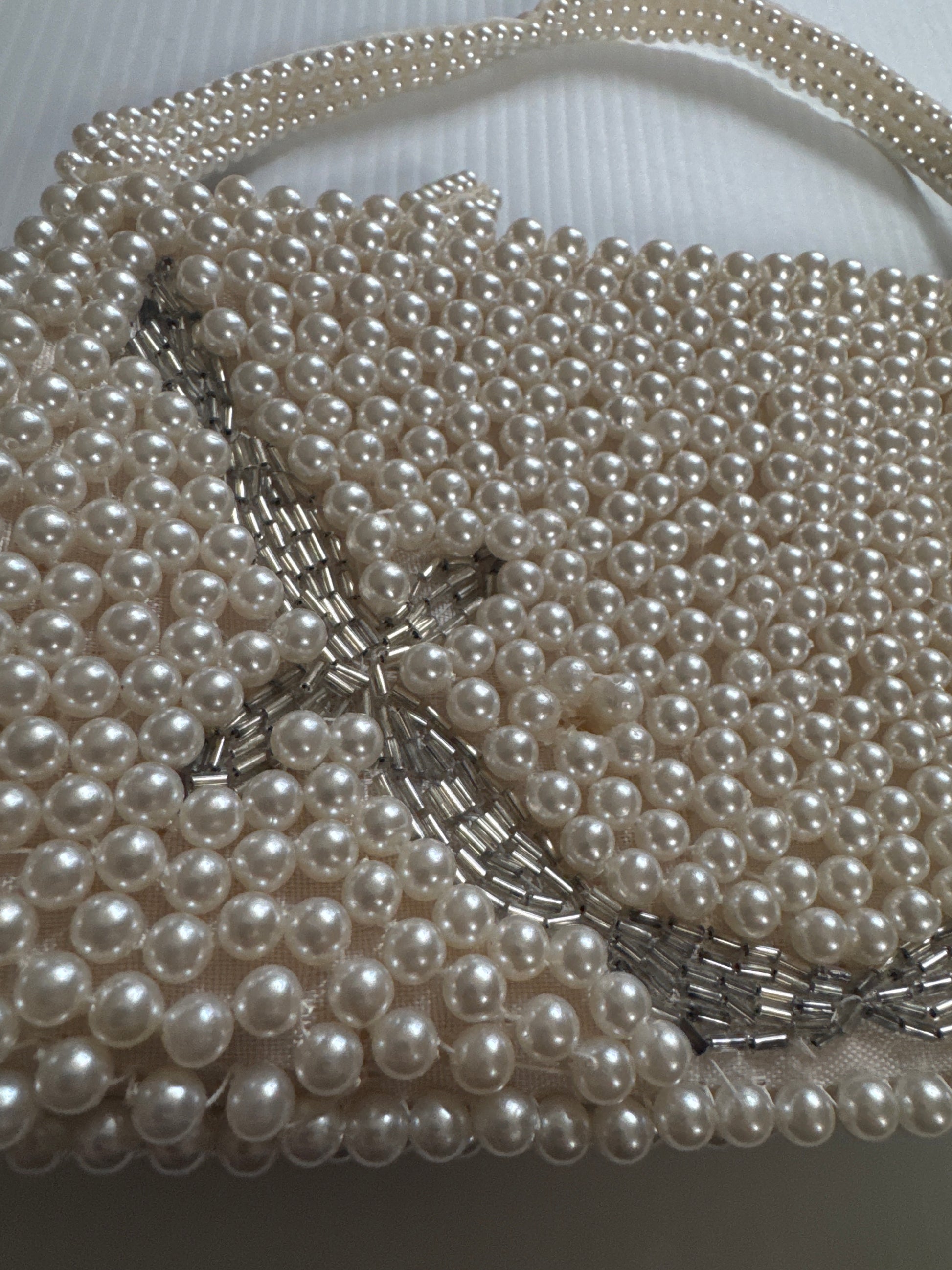 1940s beautiful beaded, pearl and silver bead top handle zipper bag. Never worn.