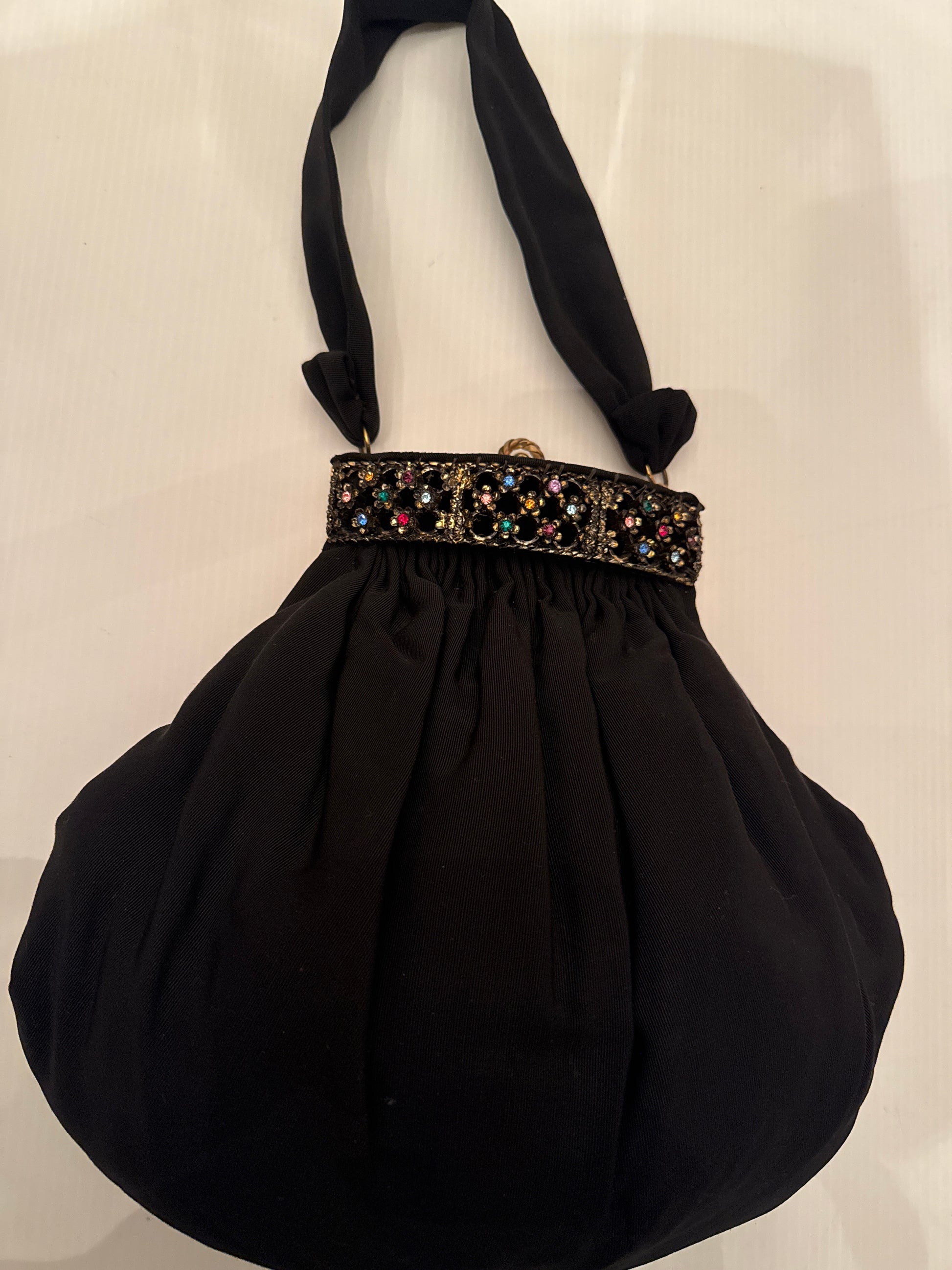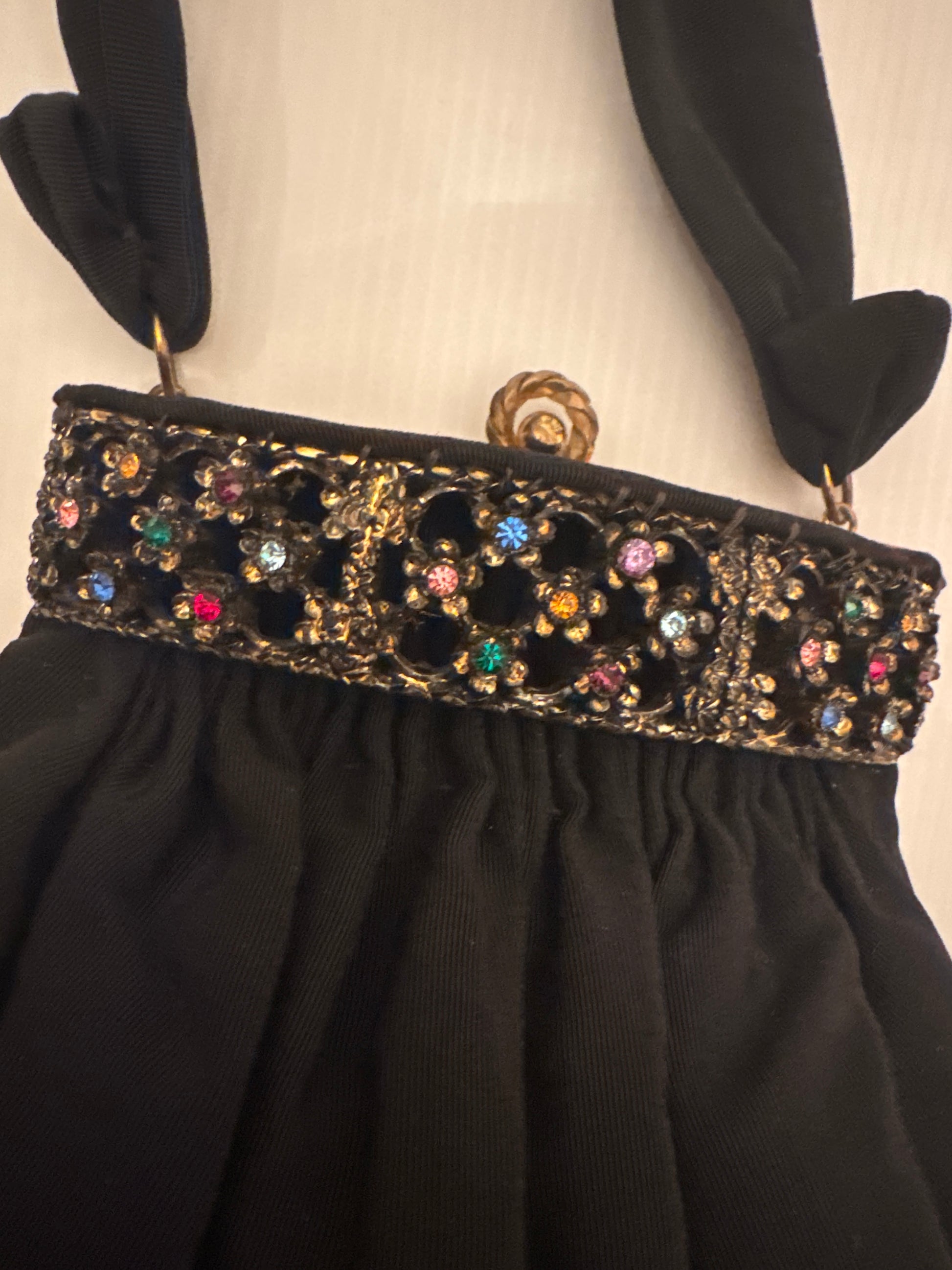 1940s stunning vintage black fabric bag with rhinestone clasp