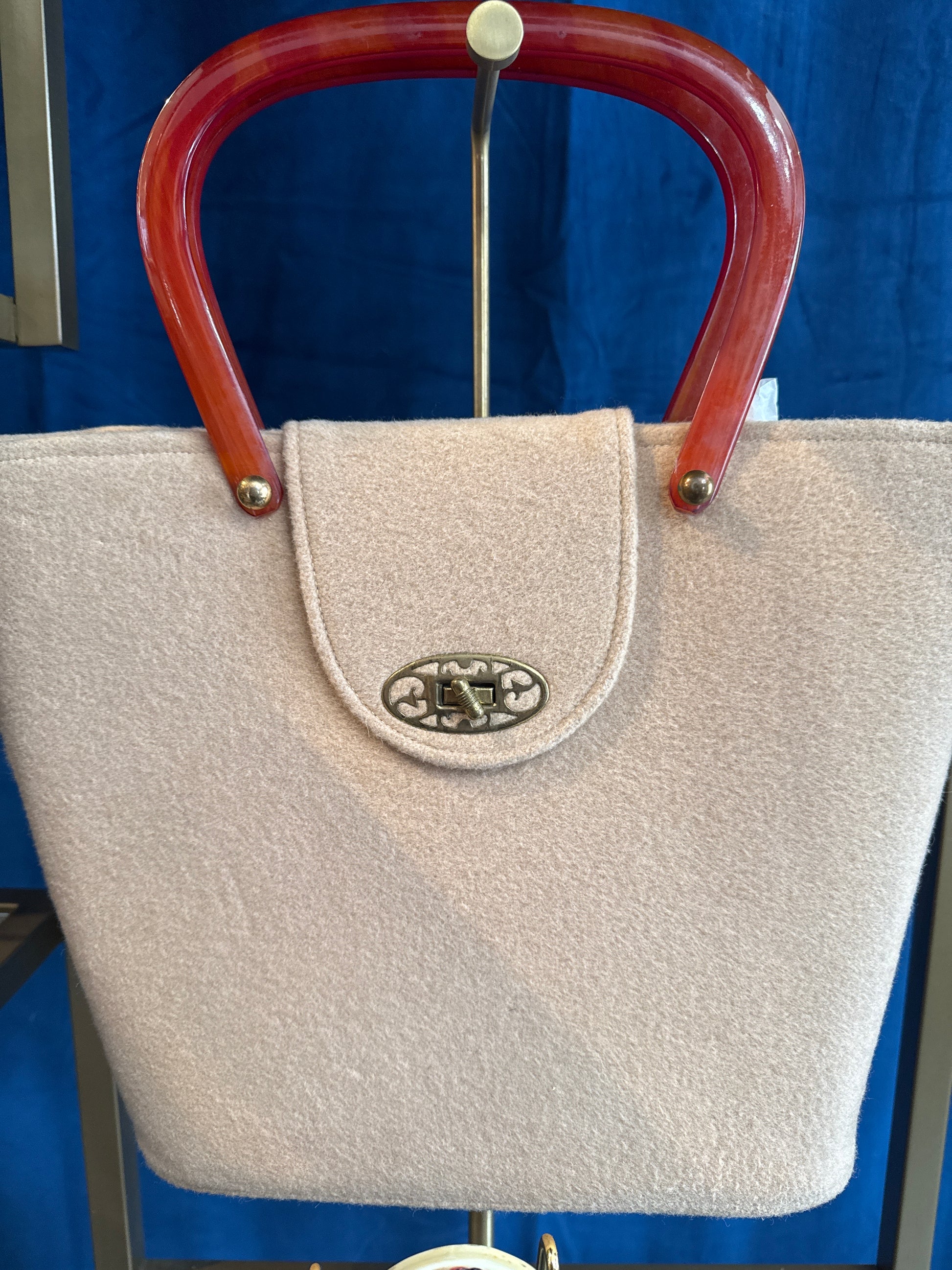 1950s beige felt top handle handbag with lucite handles. see photos.