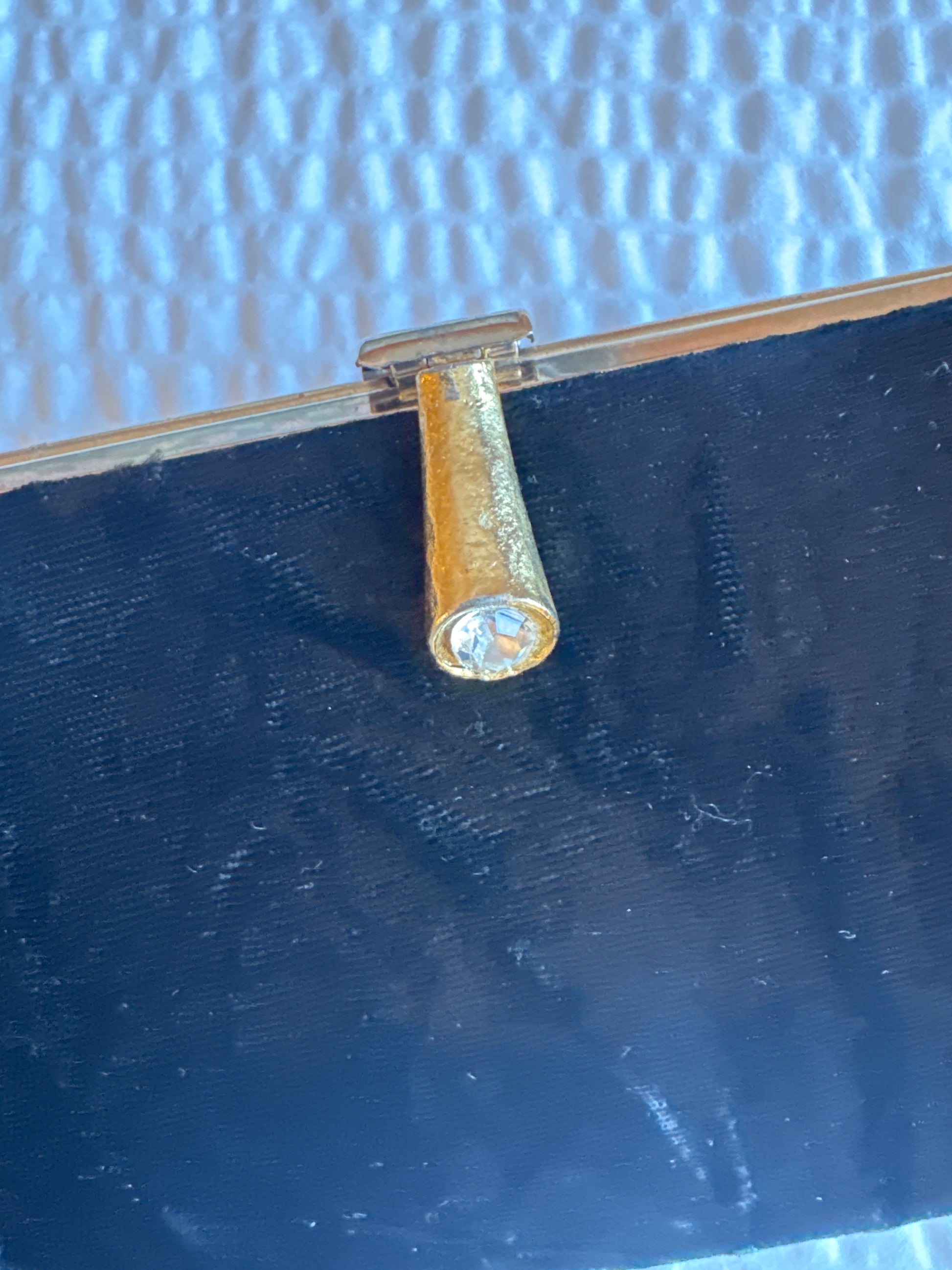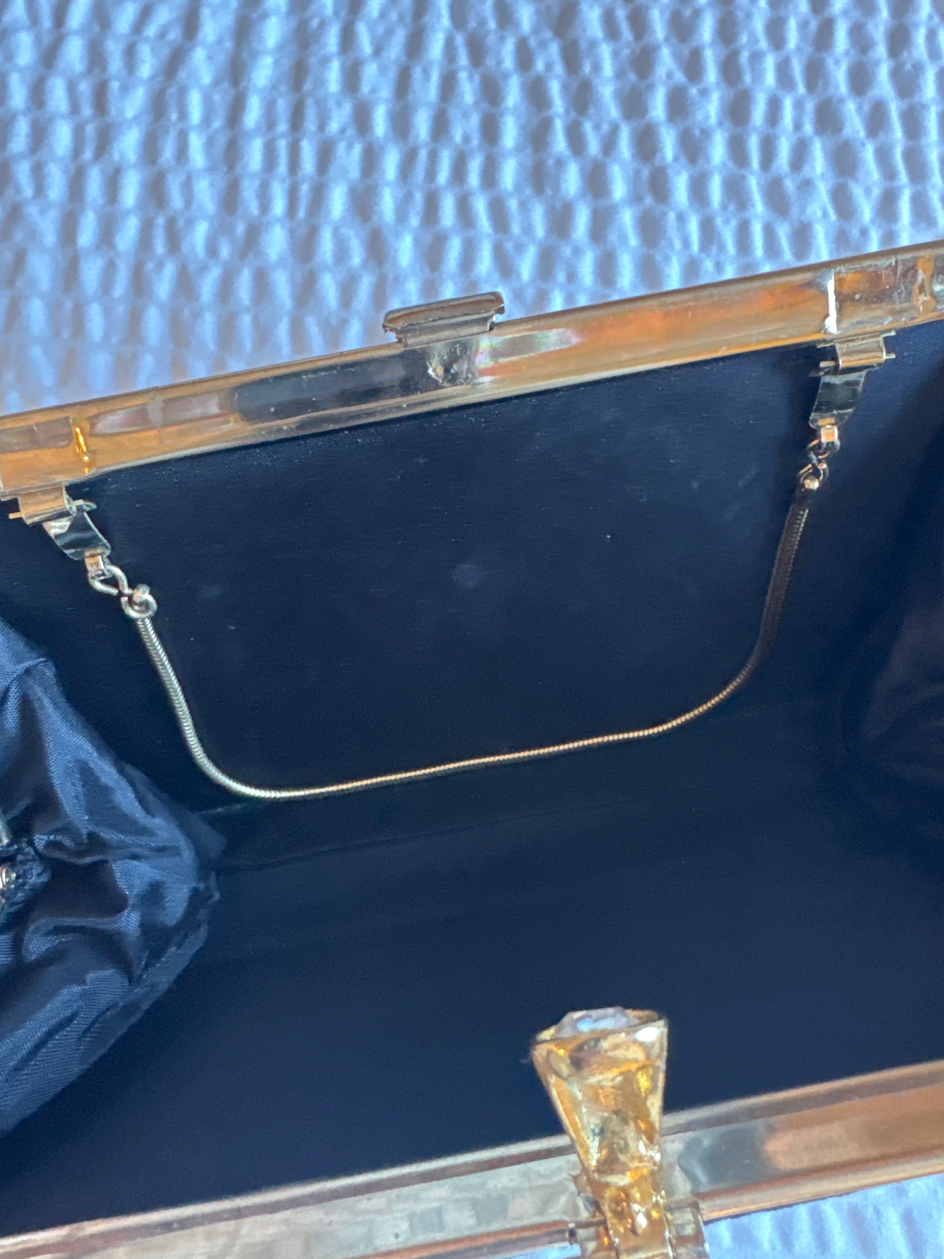 1950s black velvet moire evening bag with jewel class and optional gold chain handle. jackpot