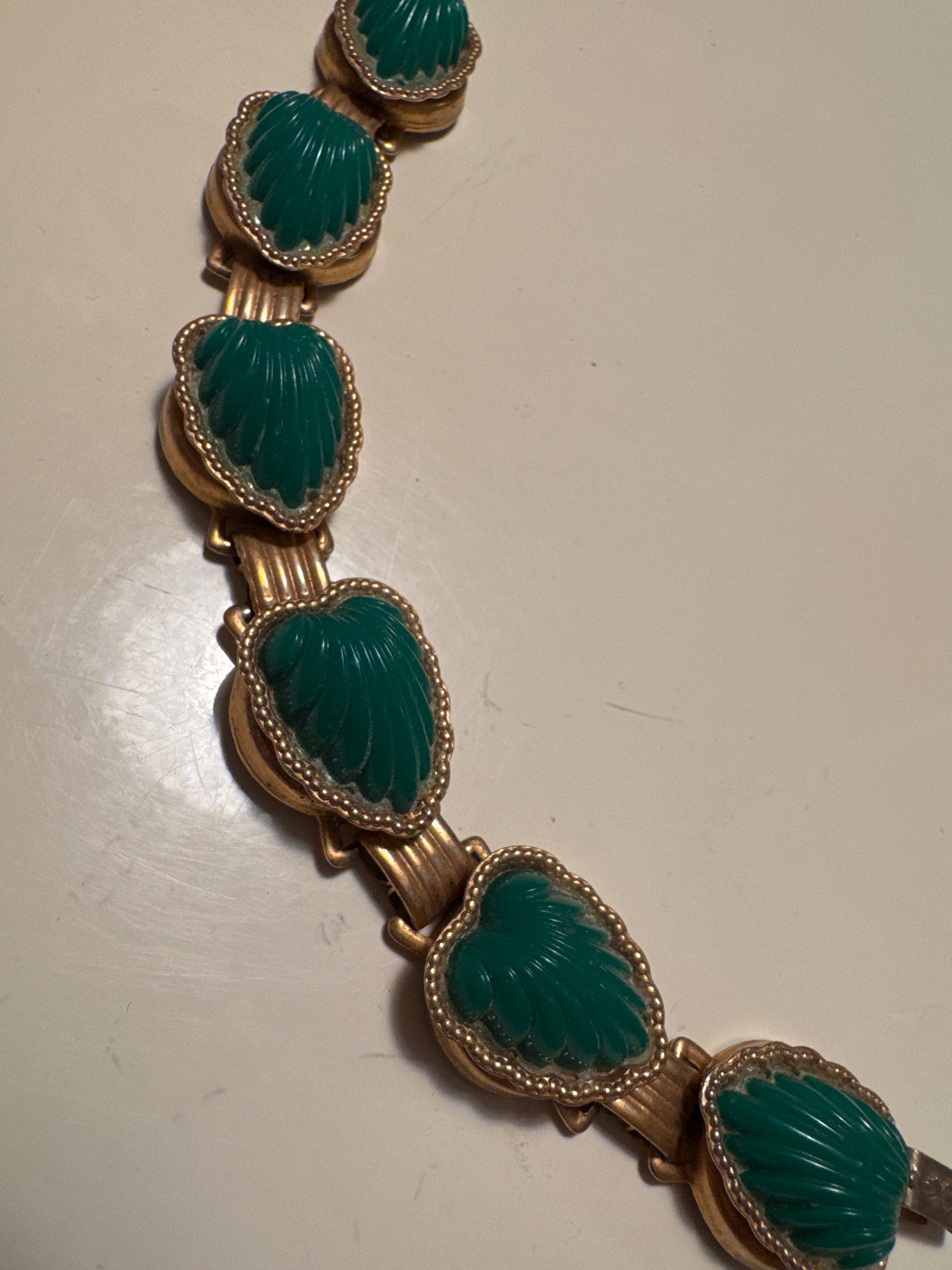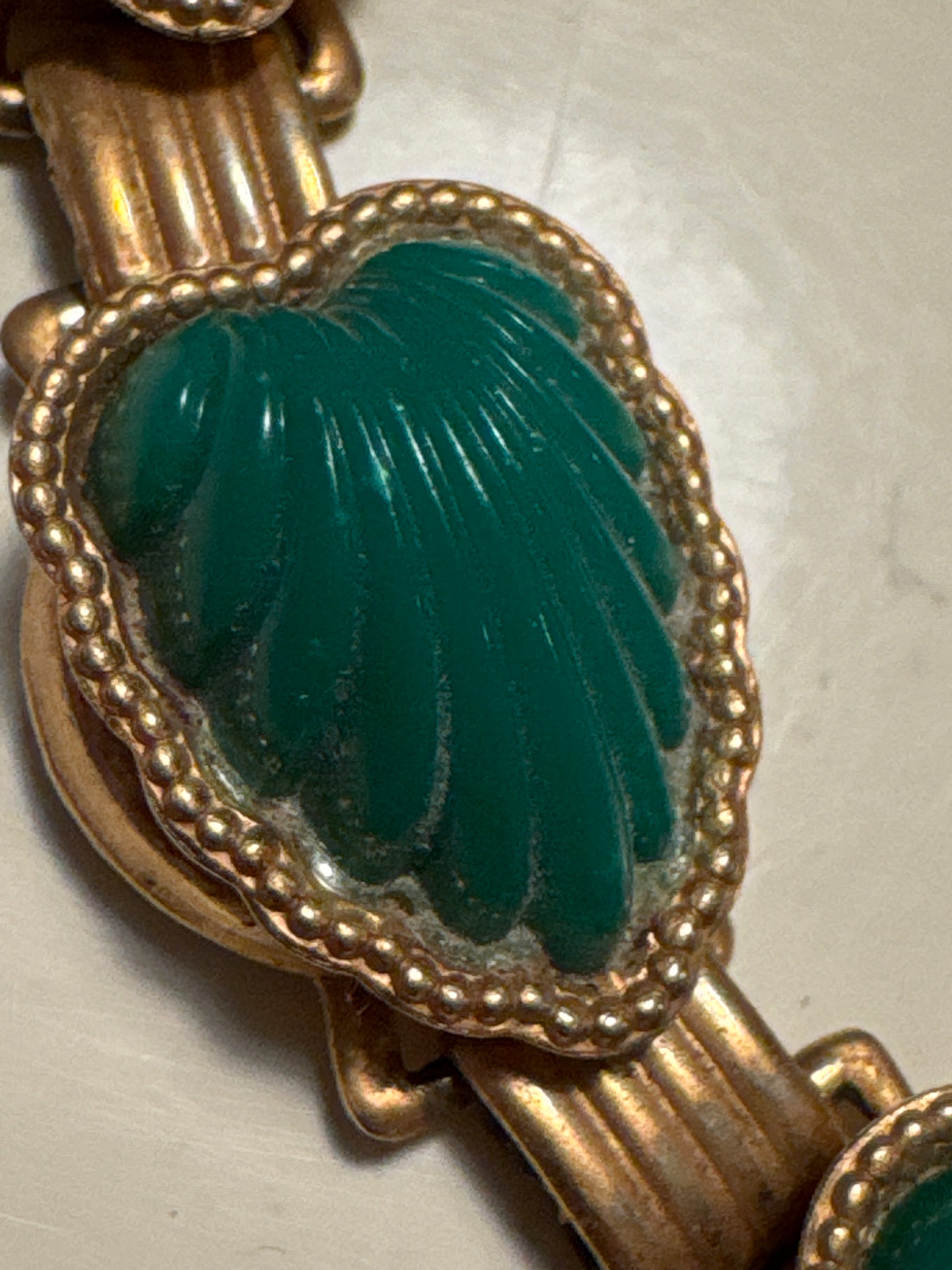 Step into timeless elegance with this exquisite vintage bracelet by Florenza, a celebrated American costume jewelry house known for its ornate, Victorian-inspired designs. Dating to the 1950s, this piece features richly detailed heart-shaped molded green glass cabochons, each set in a scalloped, beaded gold-tone setting. The lush green stones are designed to mimic carved chrysoprase or jade, offering the look of fine jewelry with the artistry of mid-century costume design.