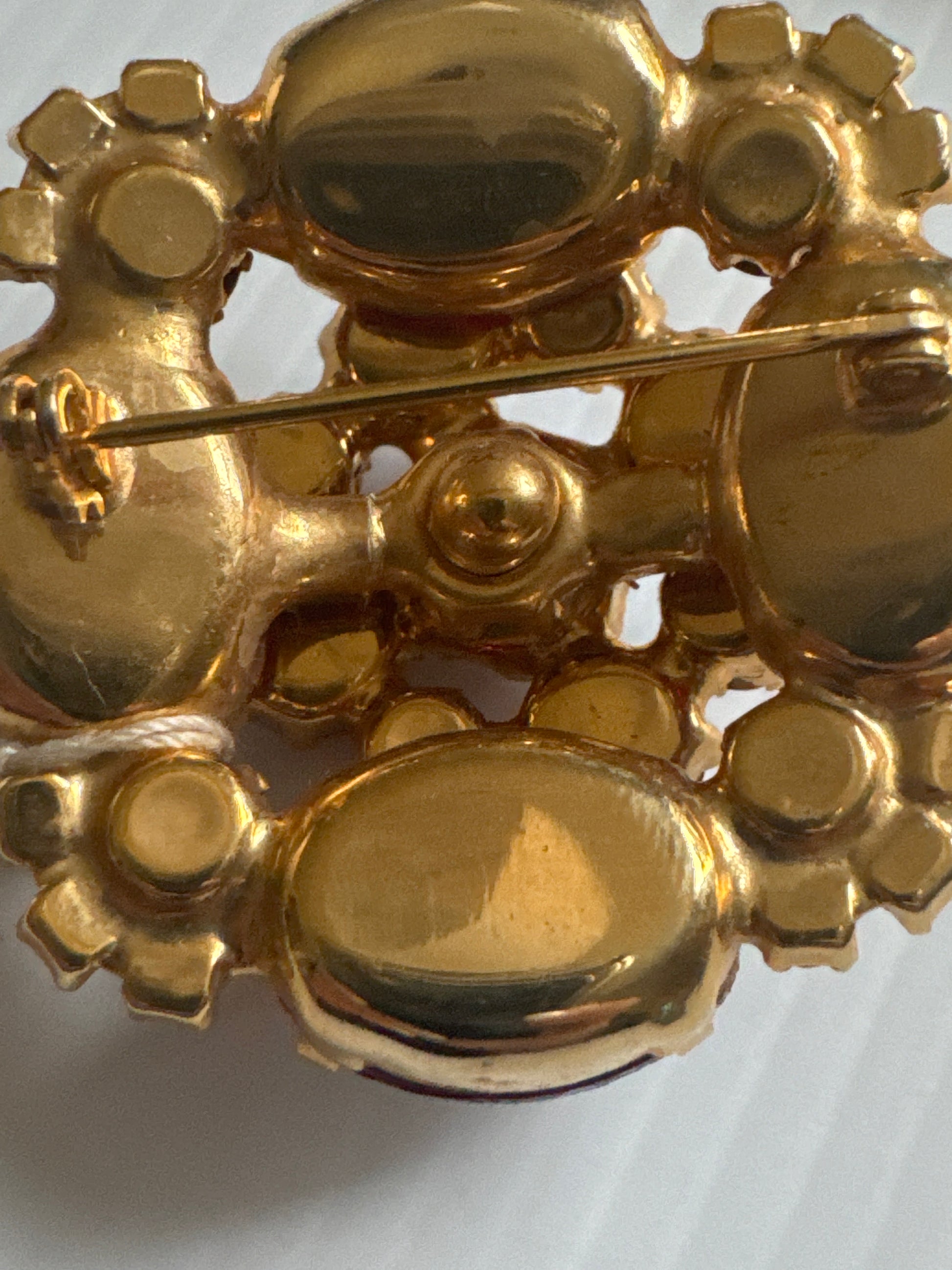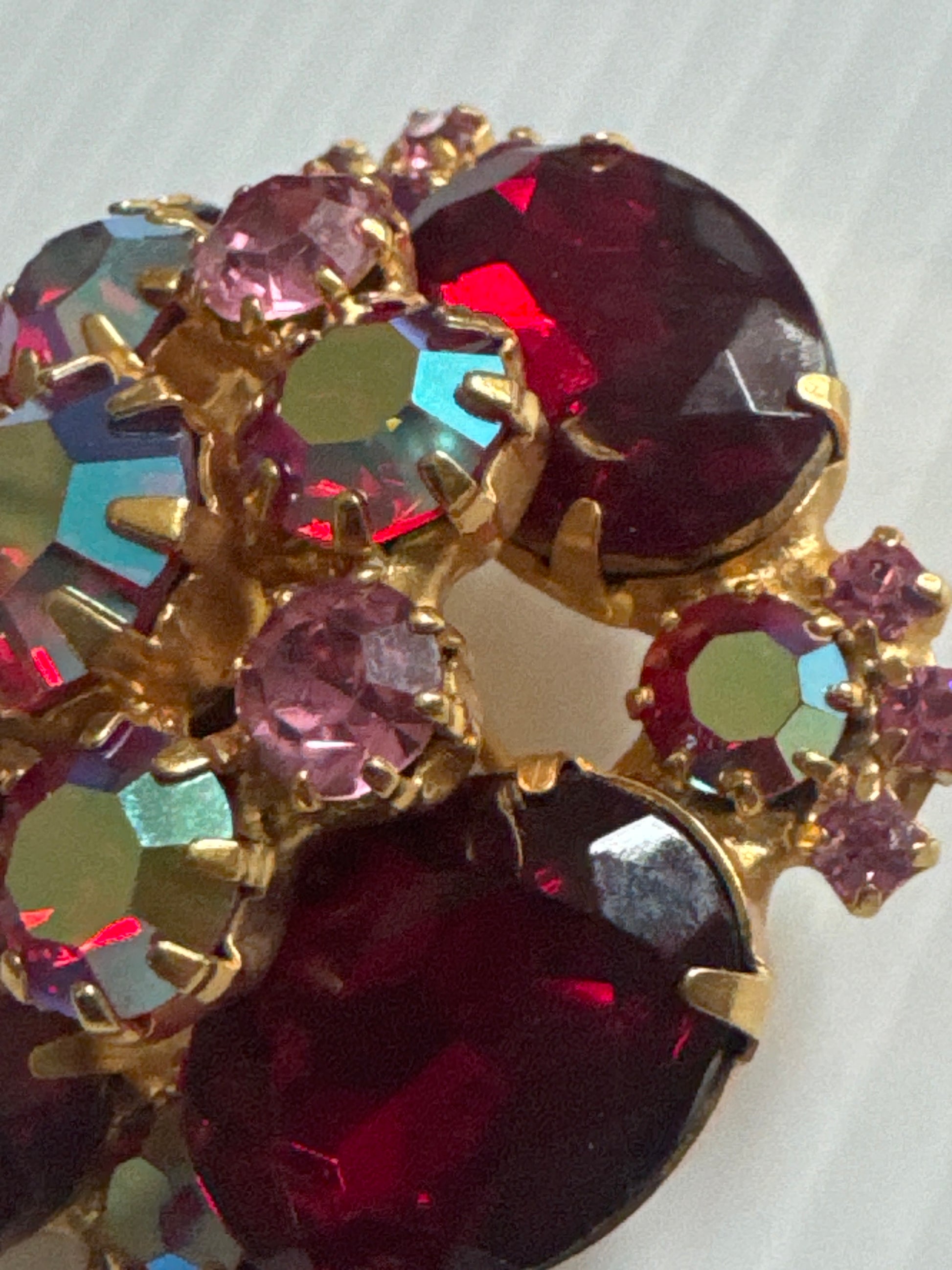 1950s stunning, brooch, and earrings set featuring red rhinestones and Aurora borealis