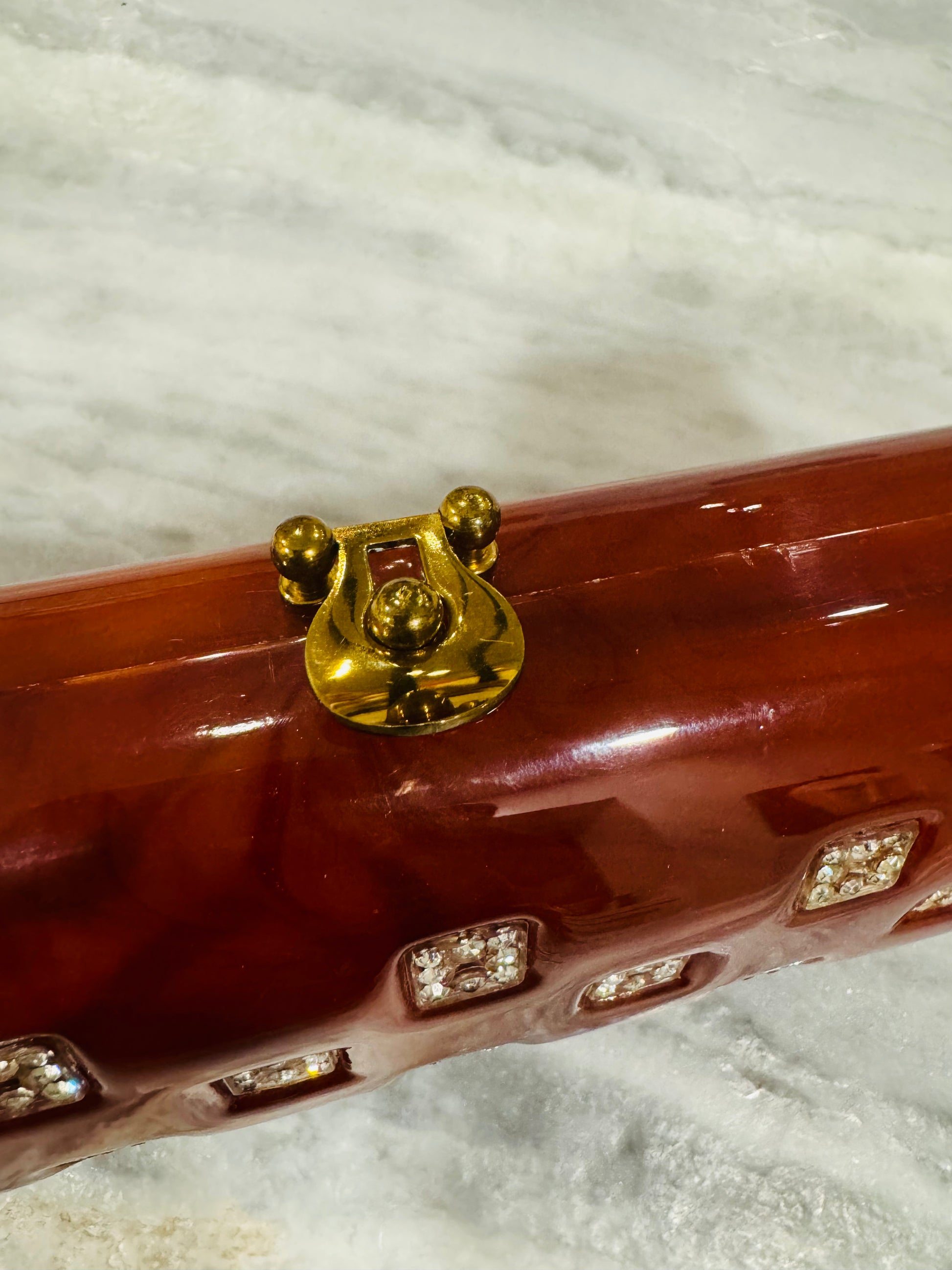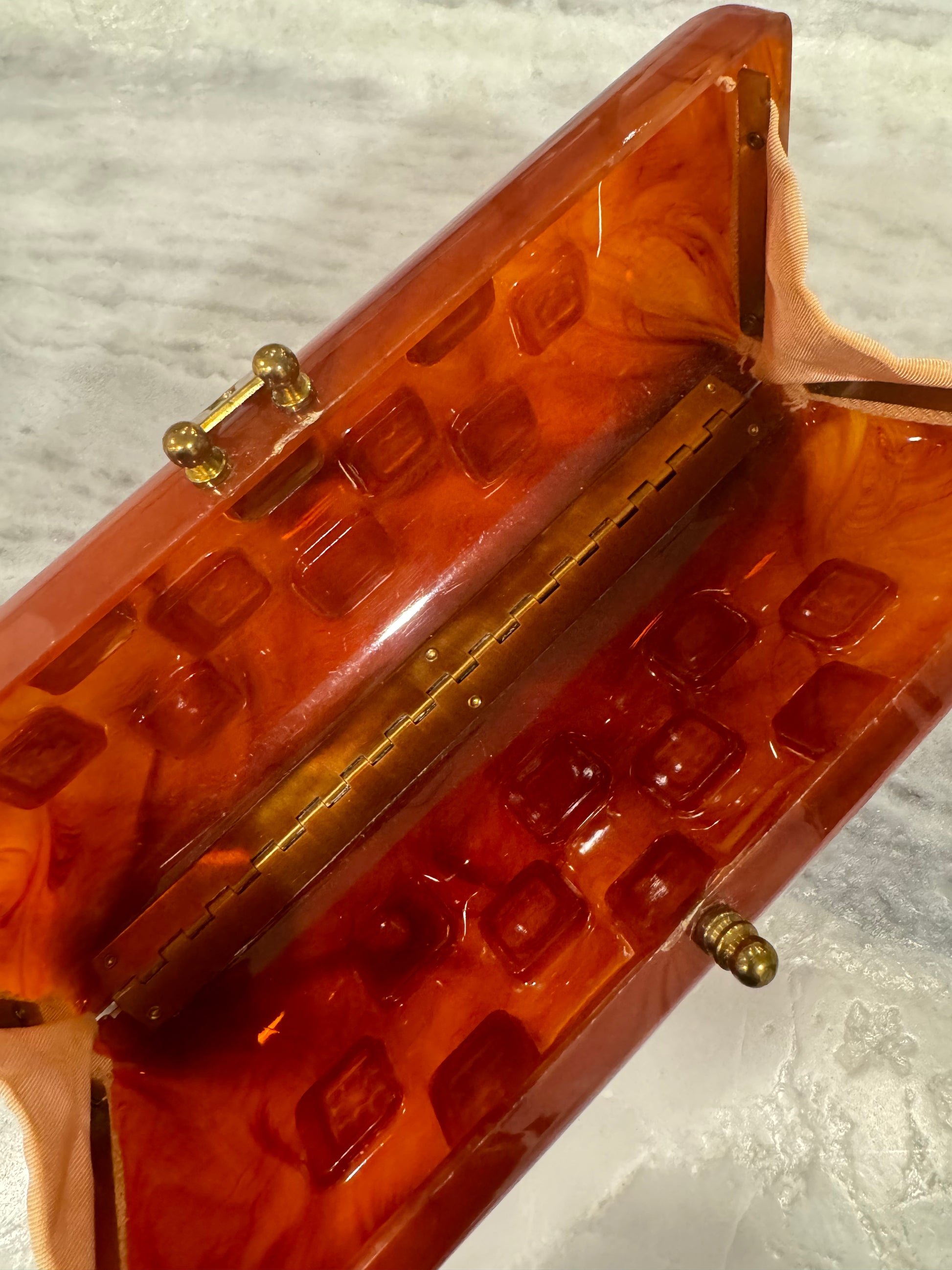 1940s tortoise lucite clutch with rhinestone detail (loose clasp 2 stones missing) Sold as is.