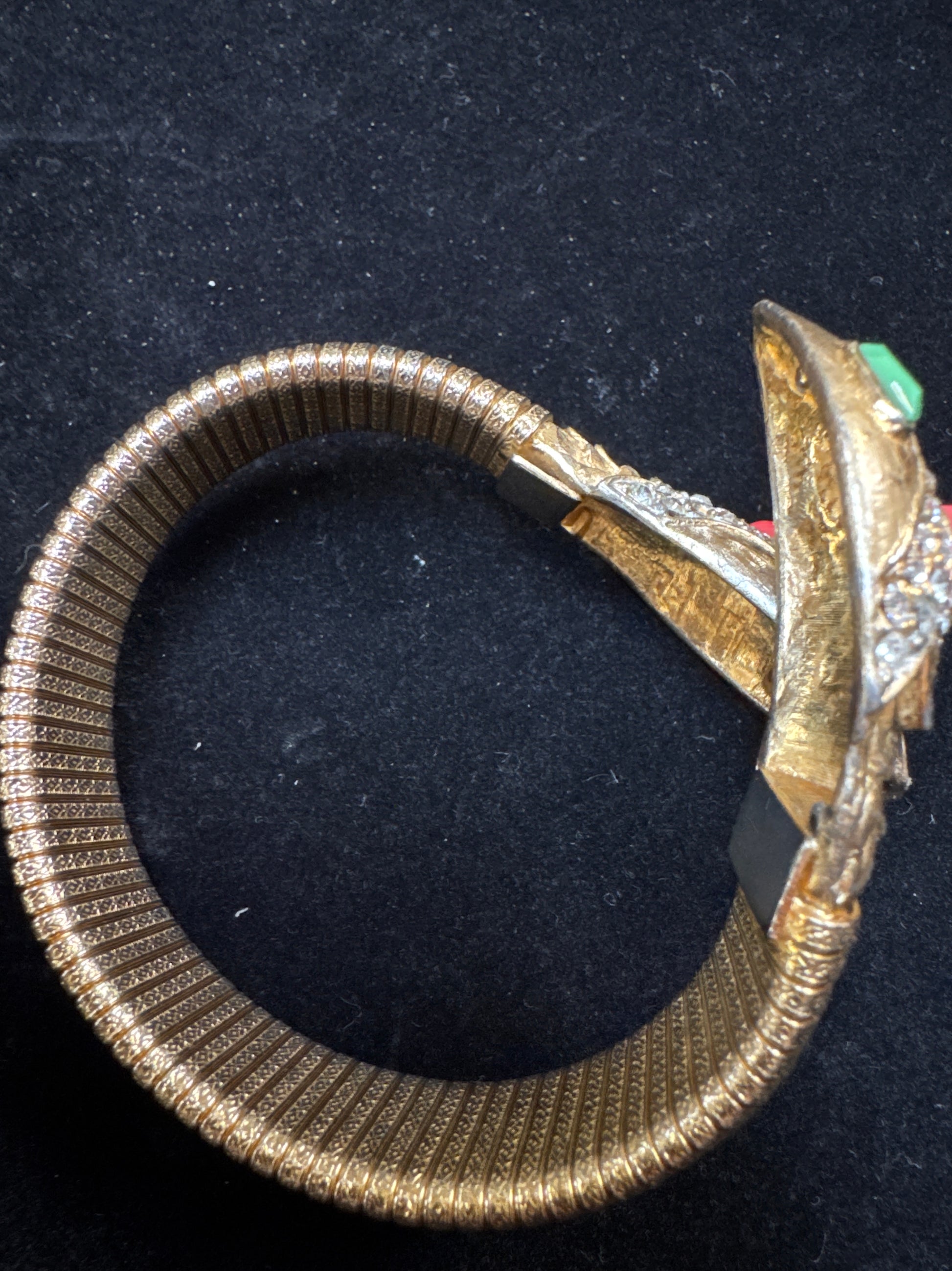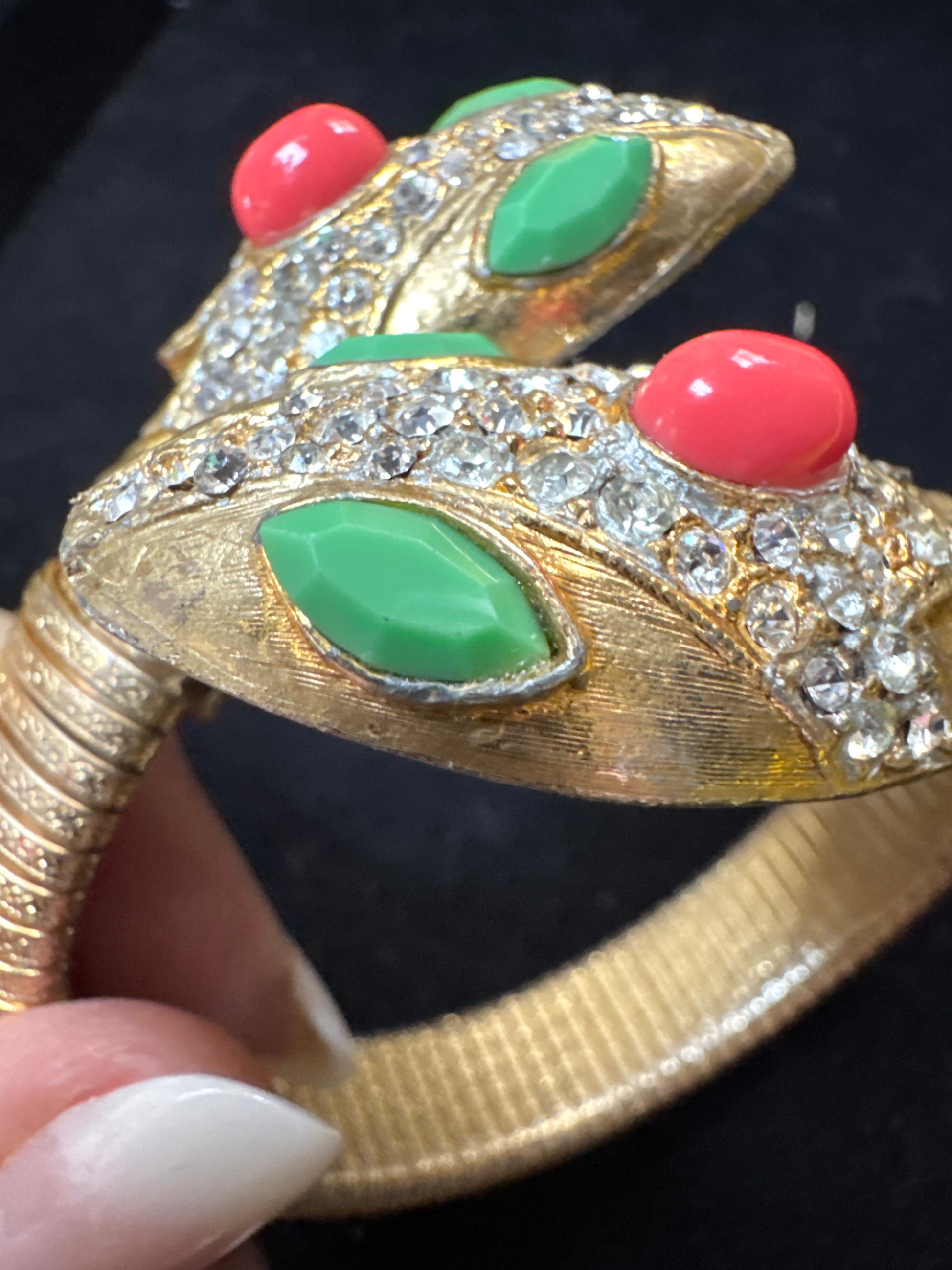 1970s STUNNING two-headed snake bracelet. Gold tone with CABACHON stones and rhinestones marked 1416. NYC