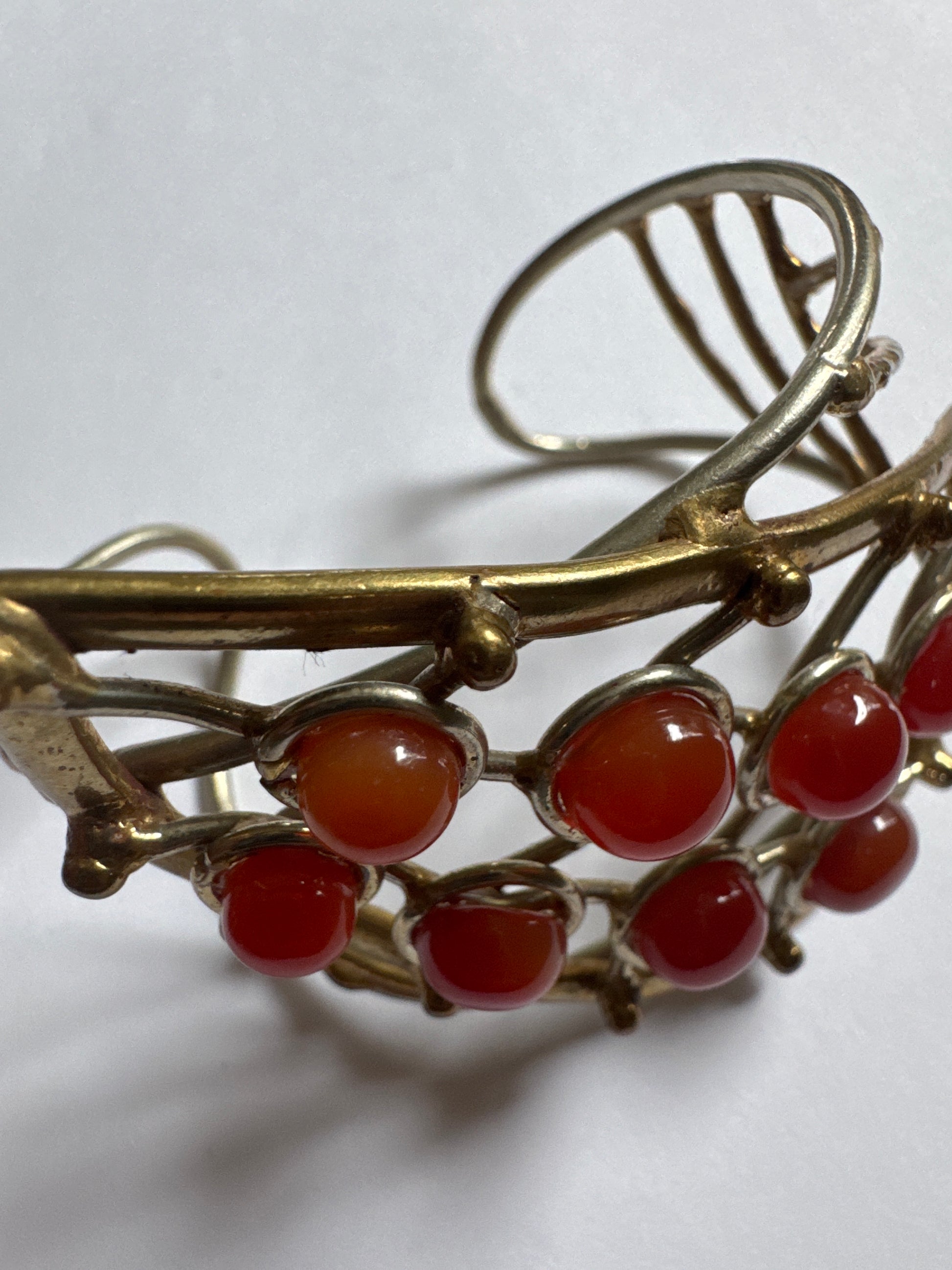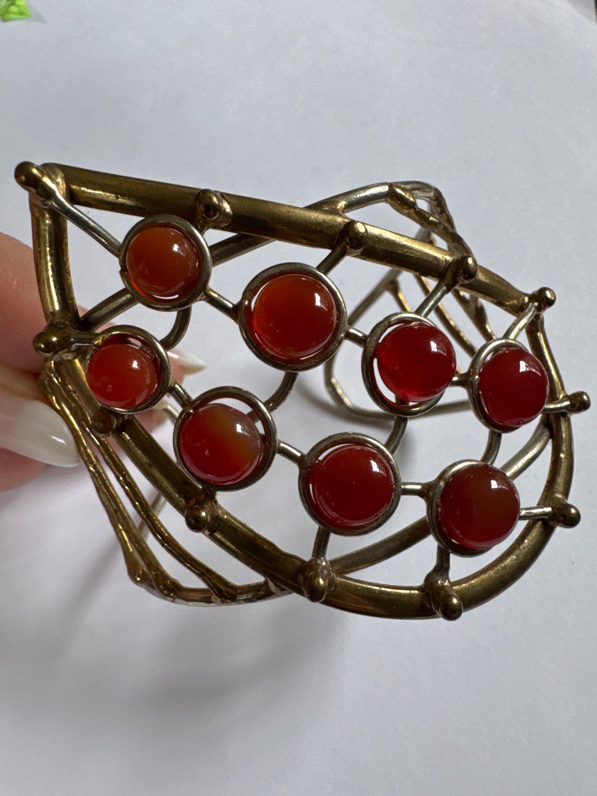 1970s vintage brass with carnelian stone cuff bracelet. 3 inches wide.