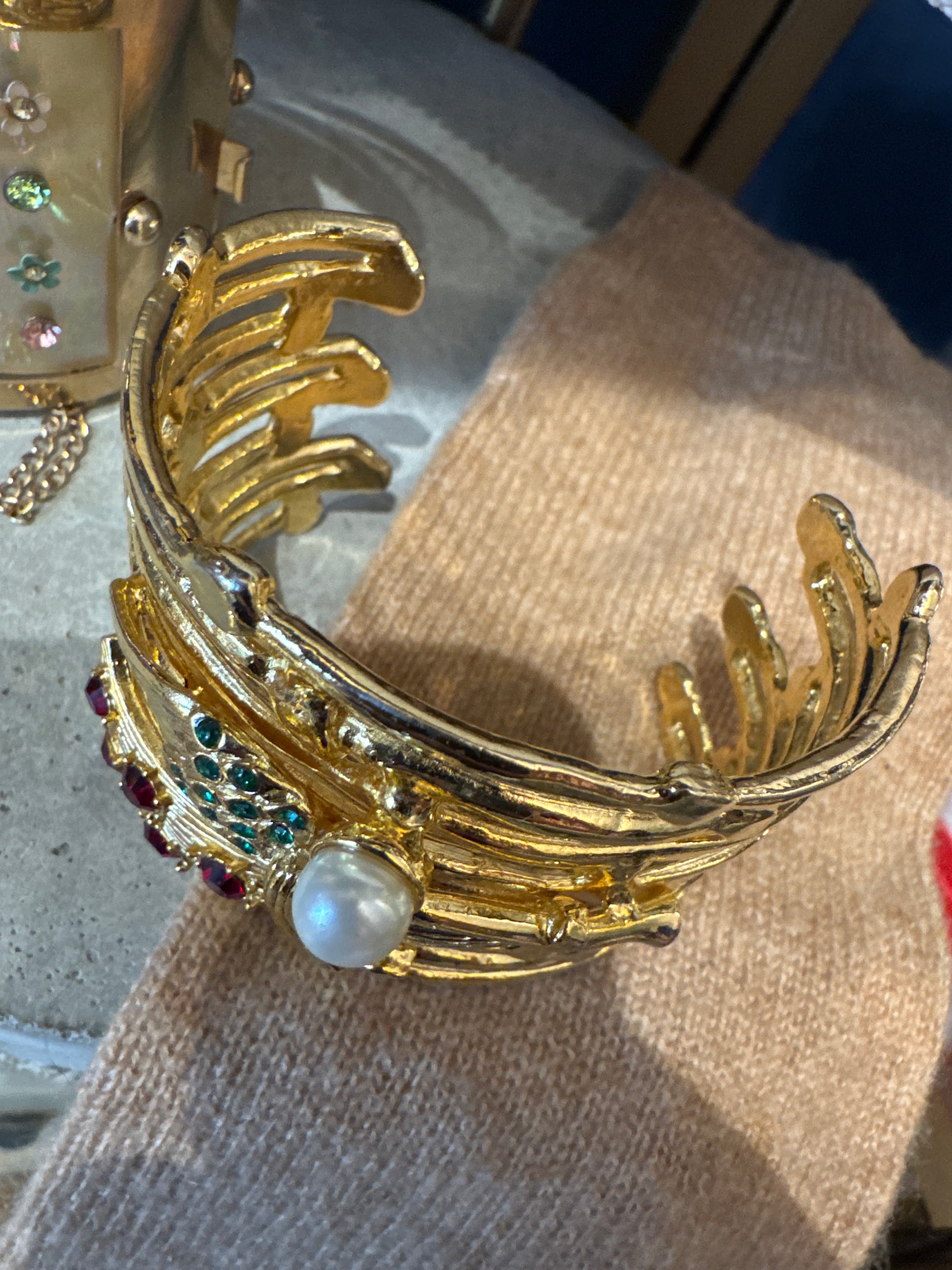 1980s vintage cherub gold tone cuff bracelet with rhinestones and faux pearl