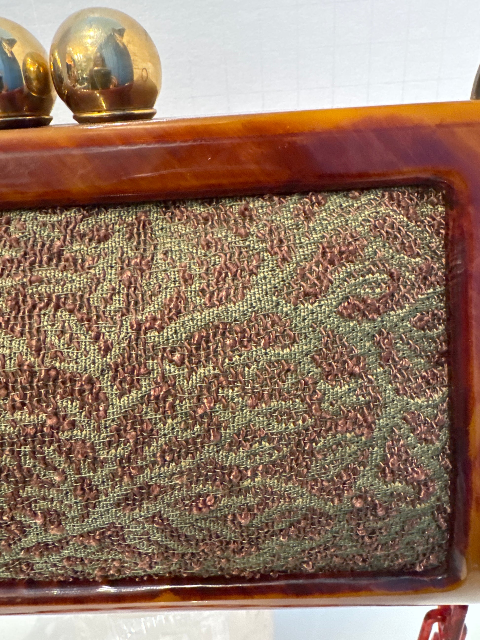 absolutely incredible 1940s vintage handbag with jumbo kiss lock bakelite frame and chain and beautiful interior. Mint condition.