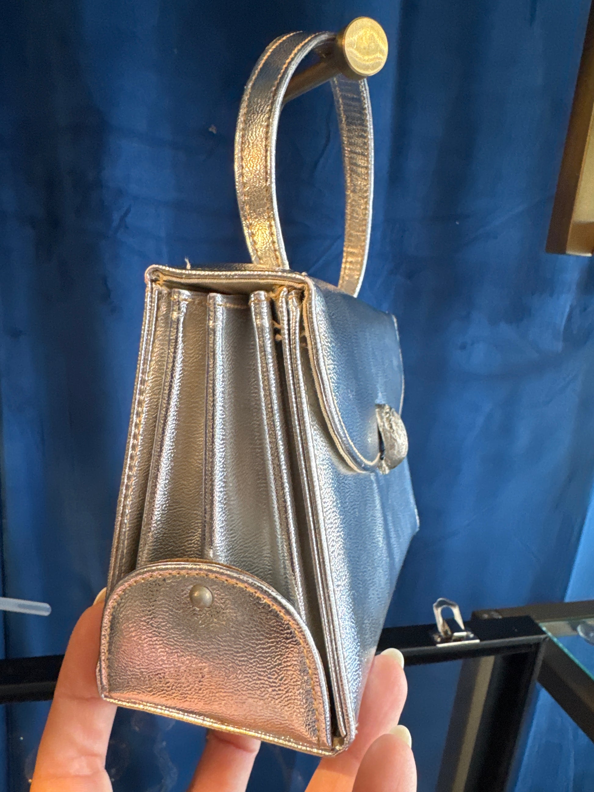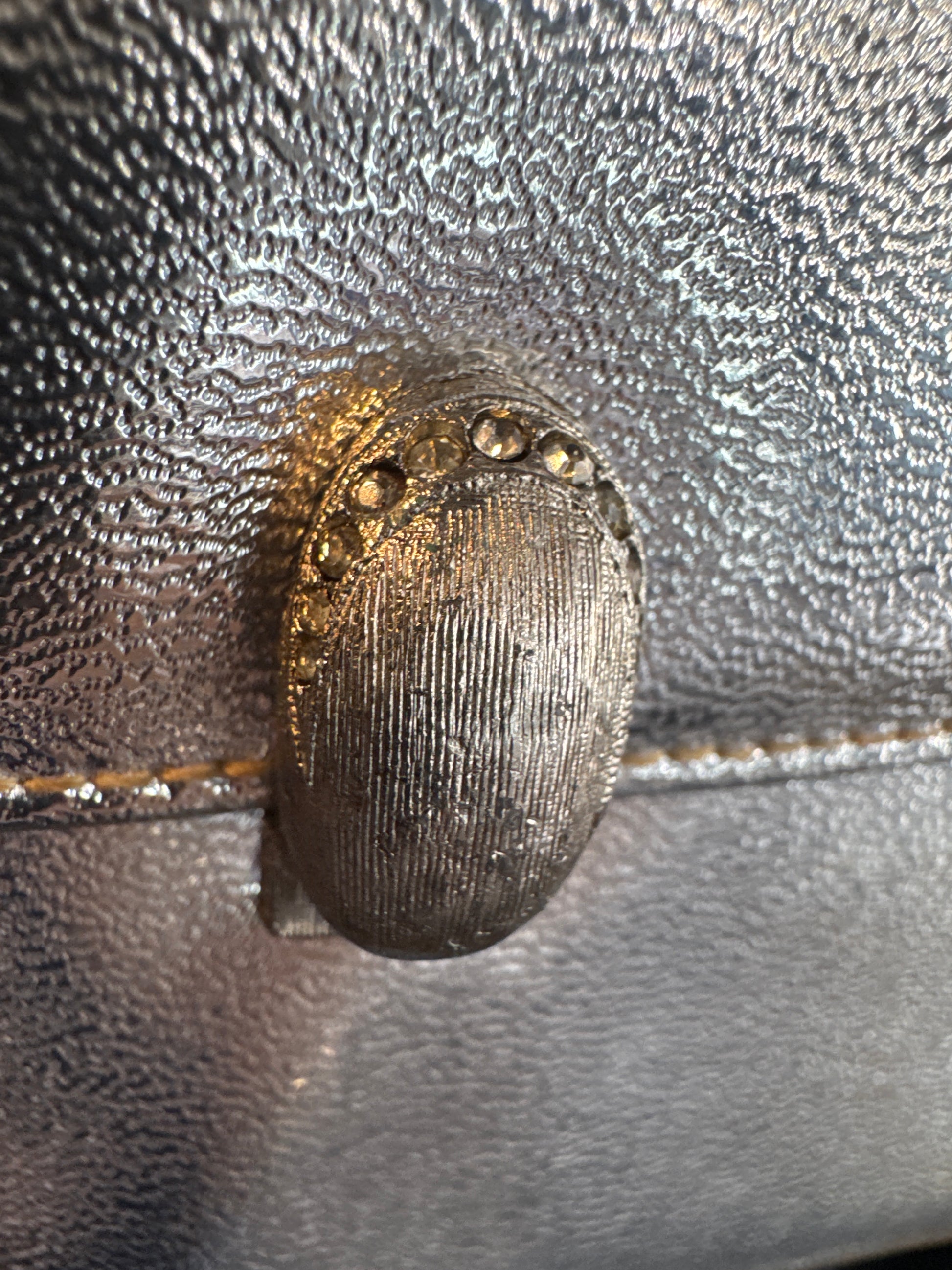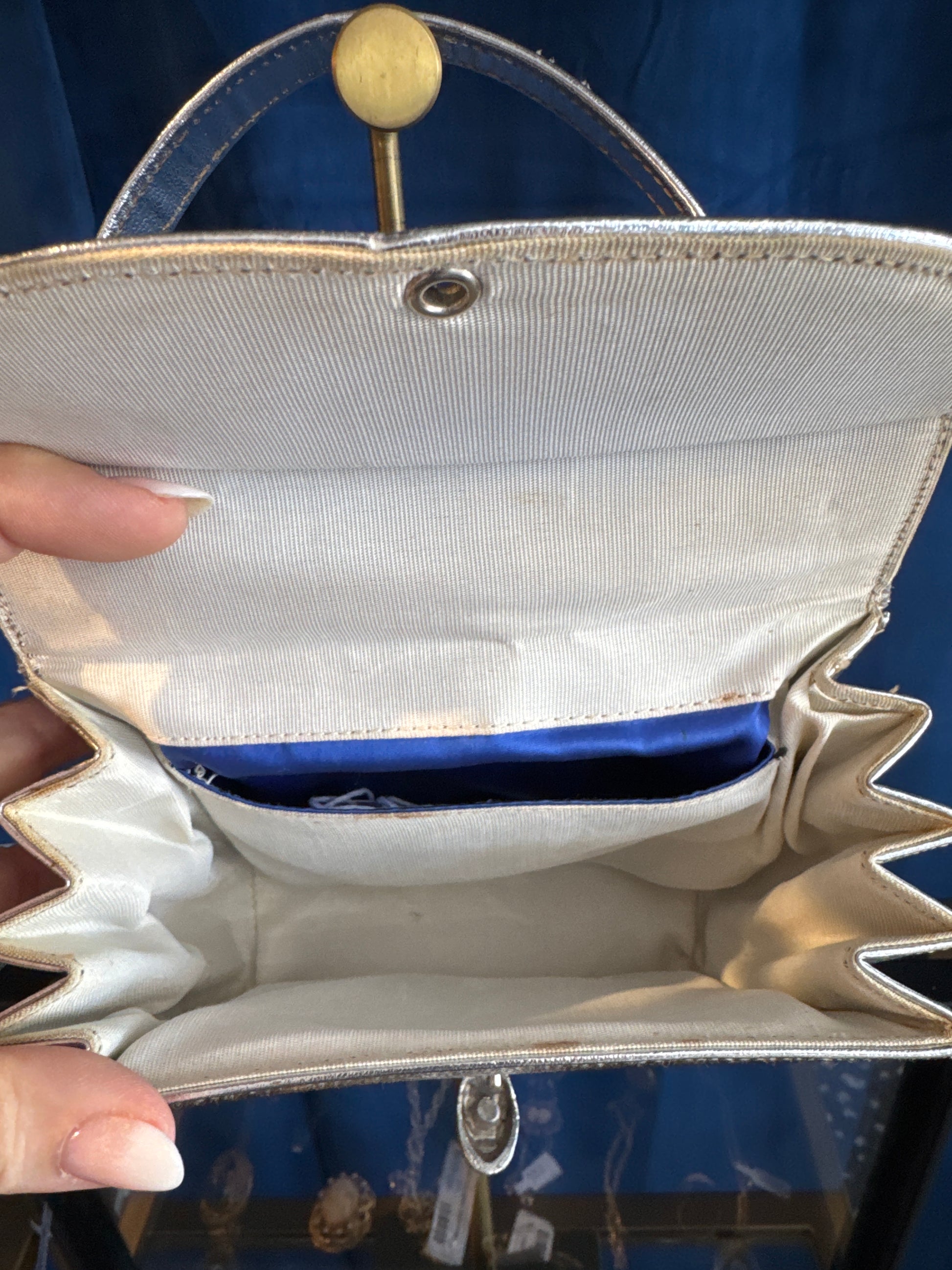 Adorable 1950s silver top handle bag with rhinestone clasp
