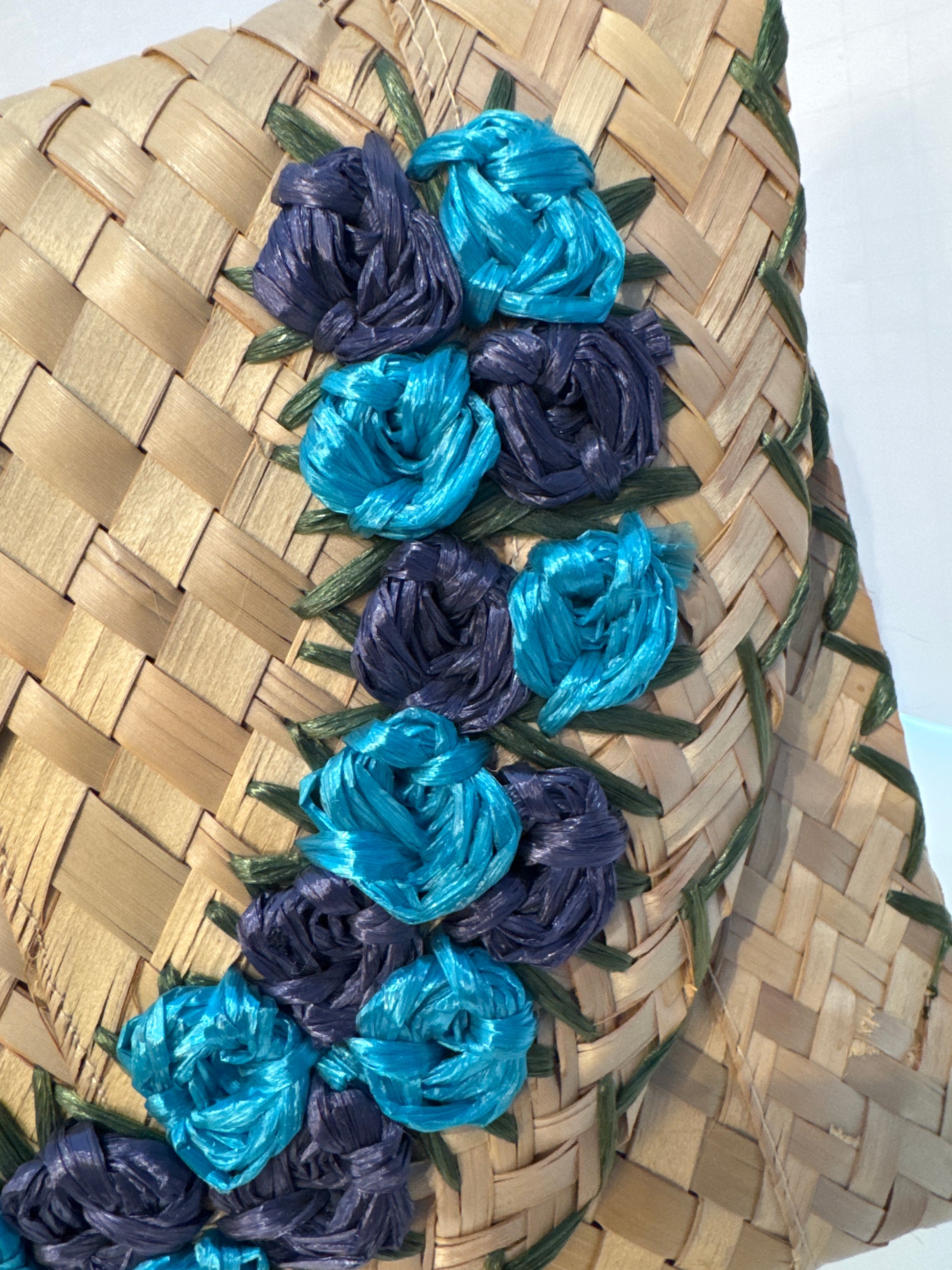 Adorable 1950s wicker envelope clutch with navy and turquoise flower embroidery