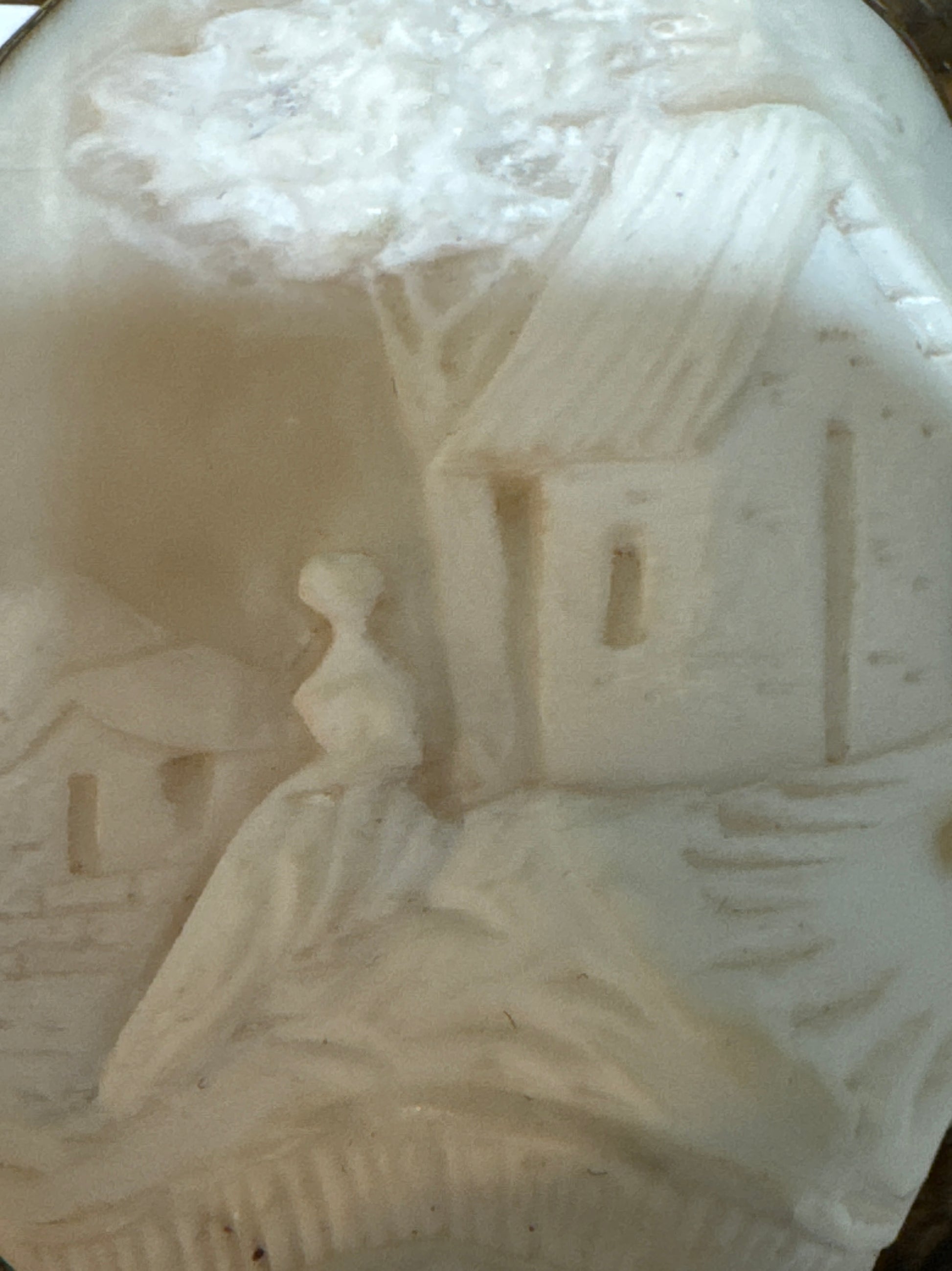 Landscape cameos such as this were far more difficult to carve than profile portraits, requiring the artisan to sculpt multiple layers of shell to create depth, perspective, and architectural detail. The soft gradations of white against the warm honey-colored ground give the scene a luminous, almost ethereal quality.