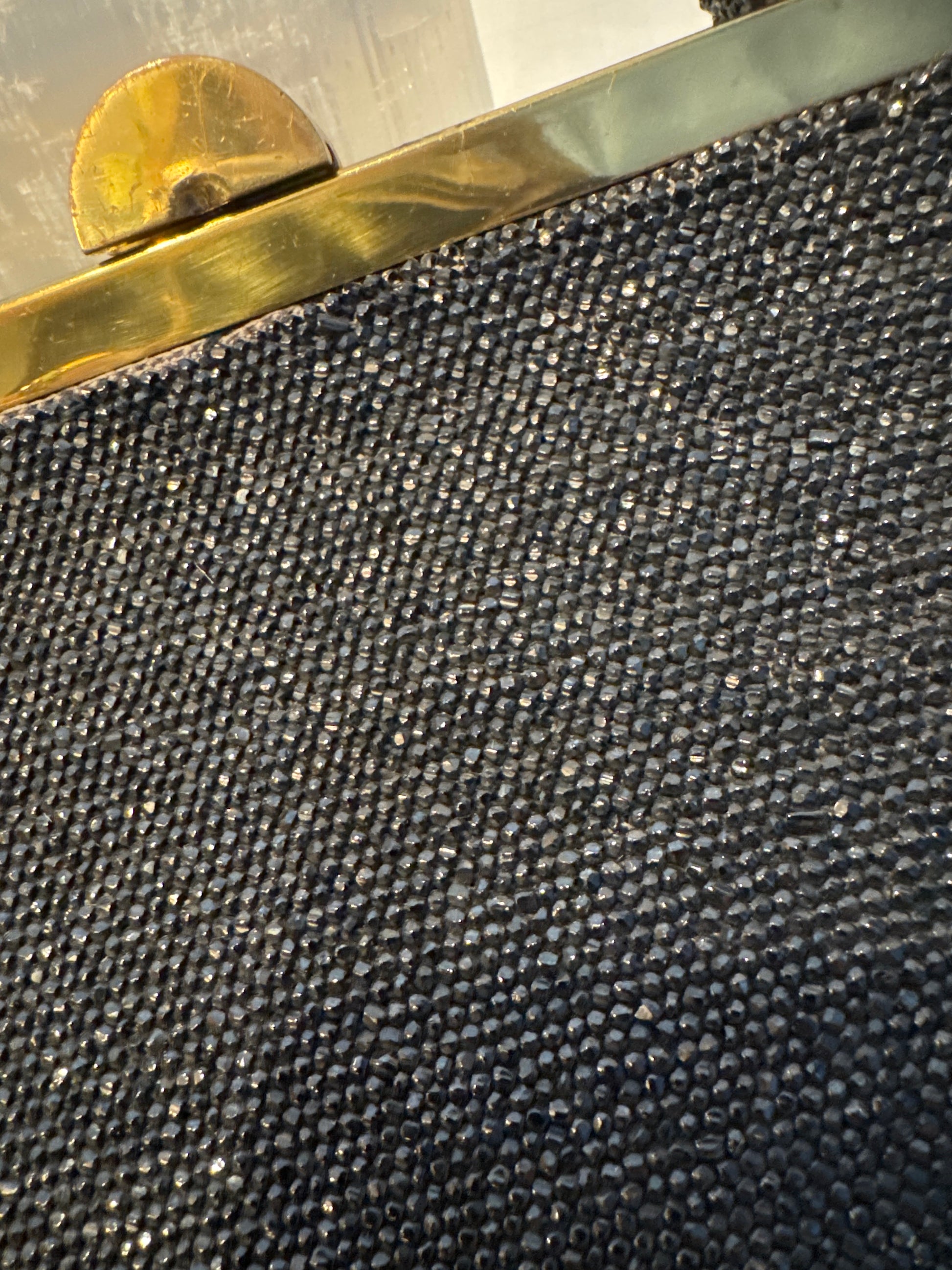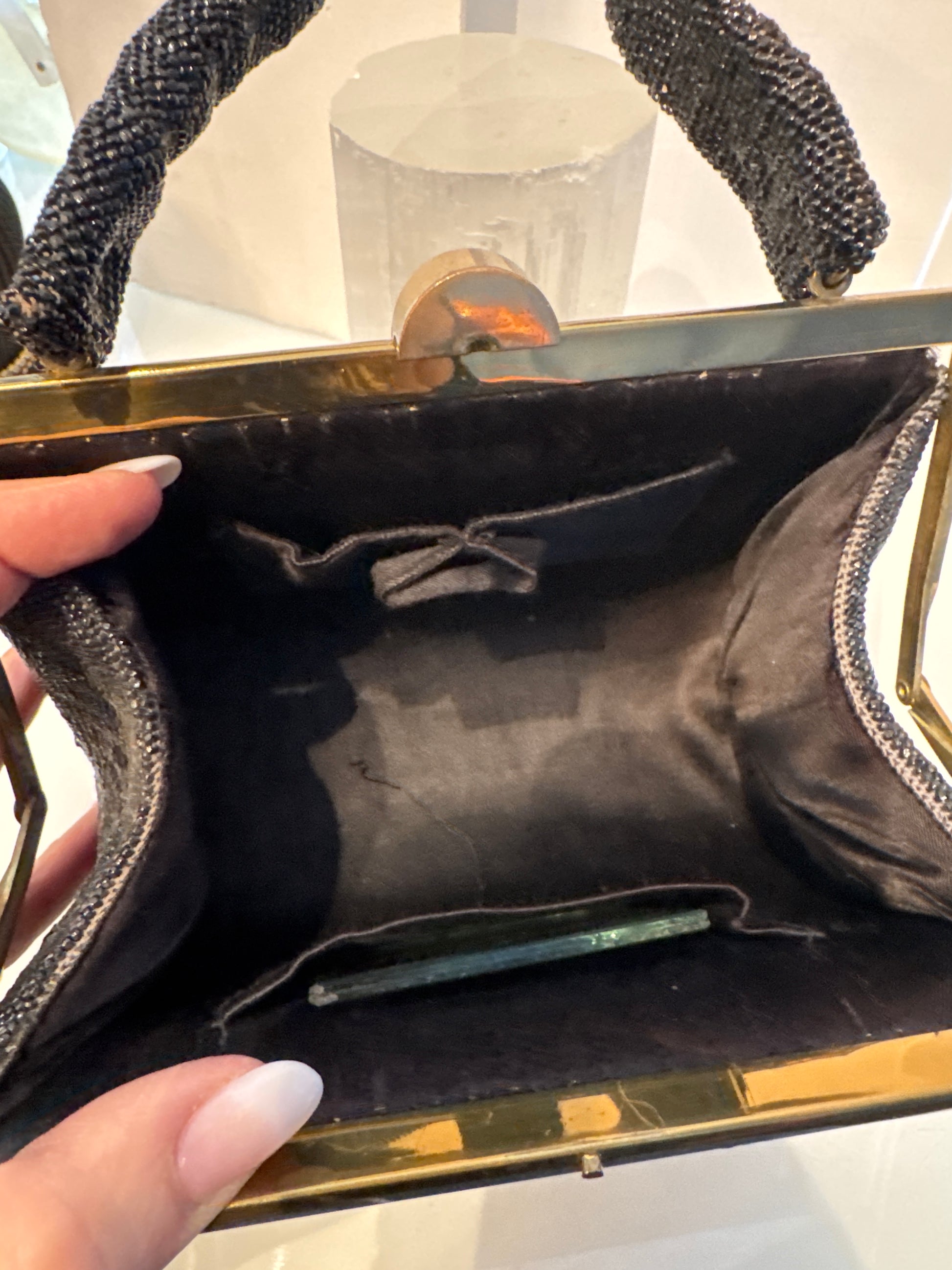 Beautiful 1940s black beaded top handle bag in mint condition with original mirror