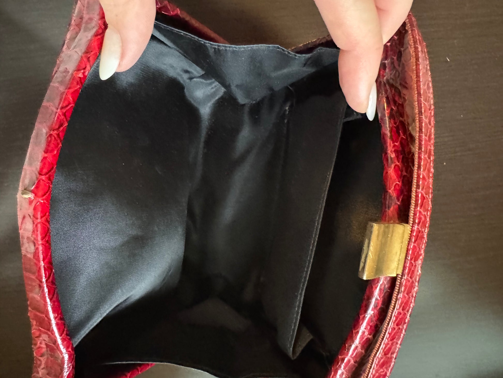 Beautiful 1940s burgundy, snake skin top handle handbag