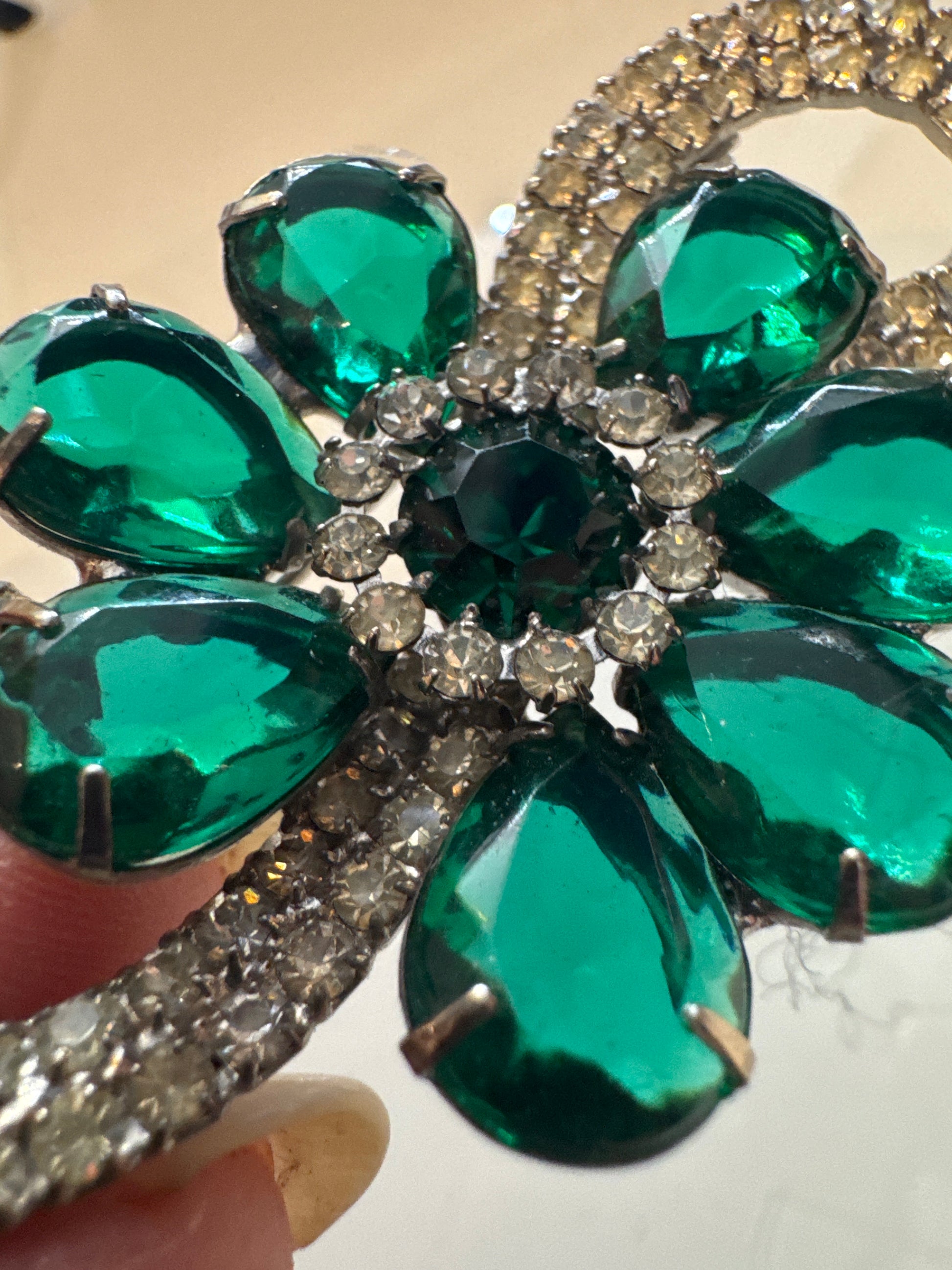 Beautiful 1940s swirl rhinestone brooch with emerald green colored rhinestones