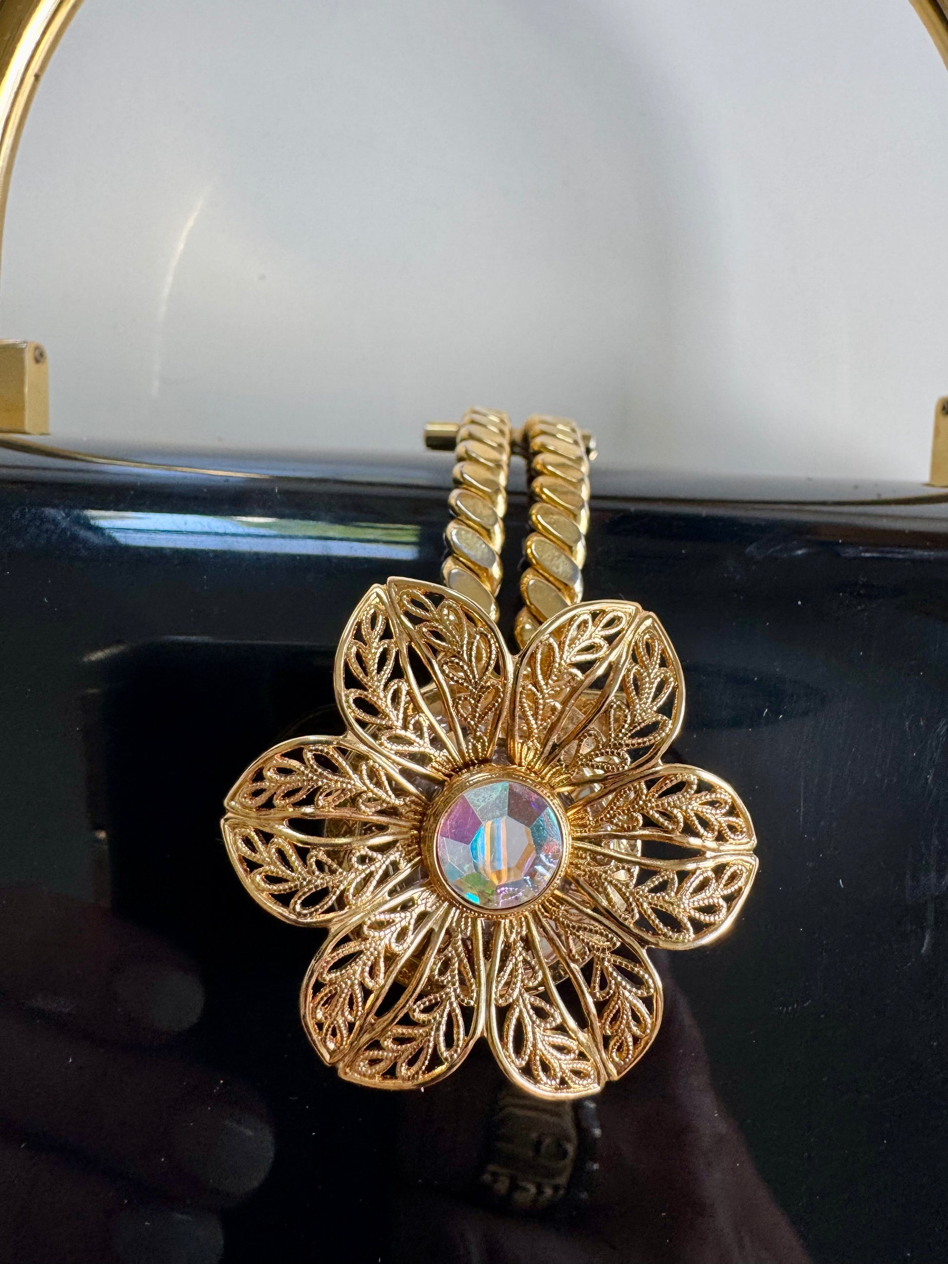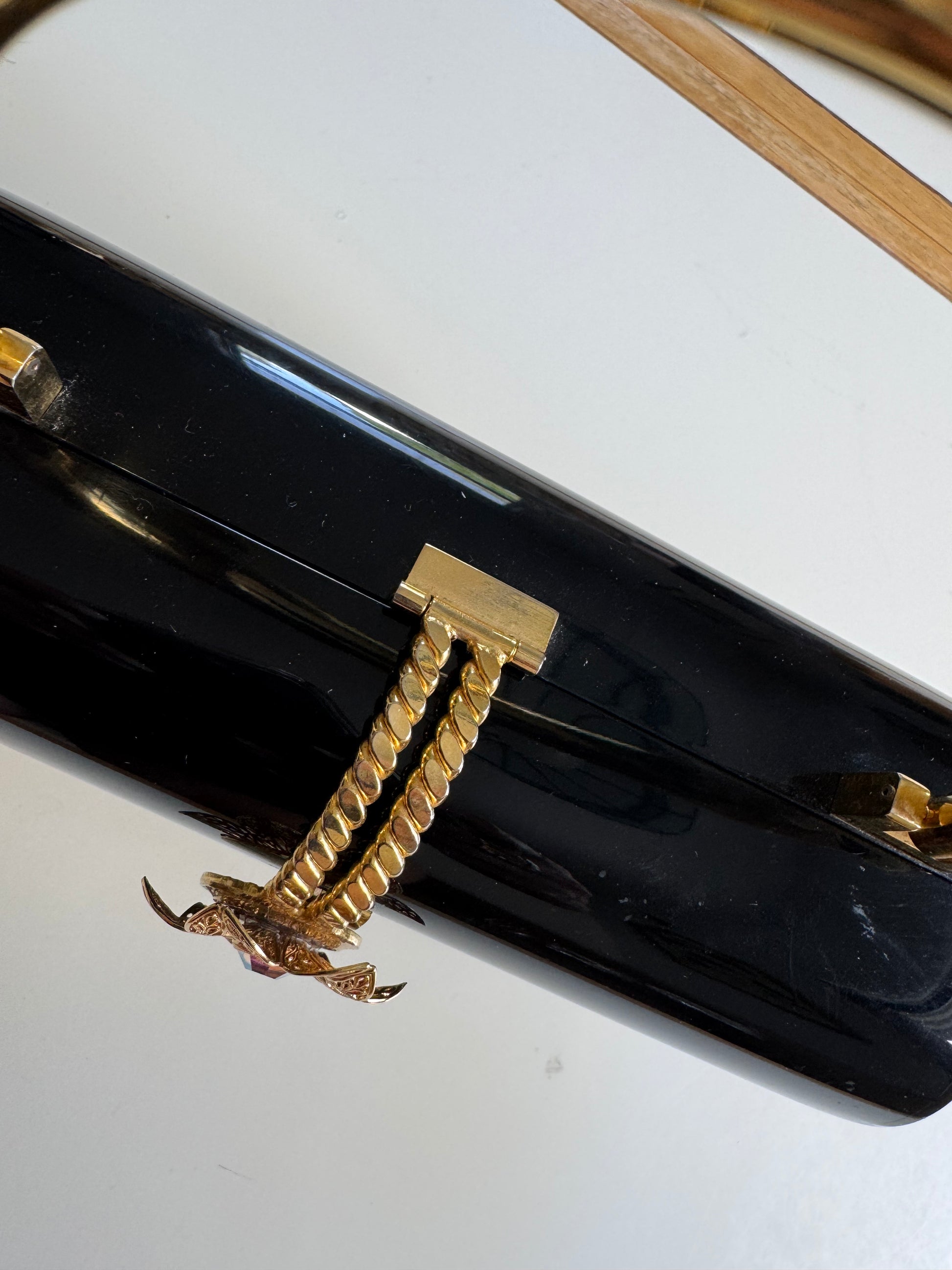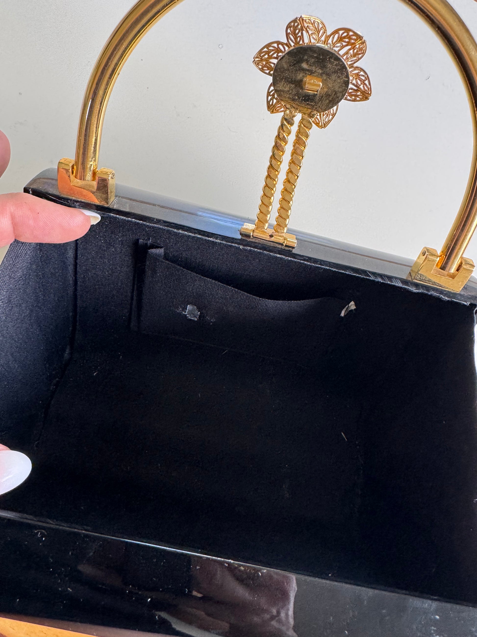 Beautiful 1960s black lucite handbag with gold top handle and decorative floral clasp