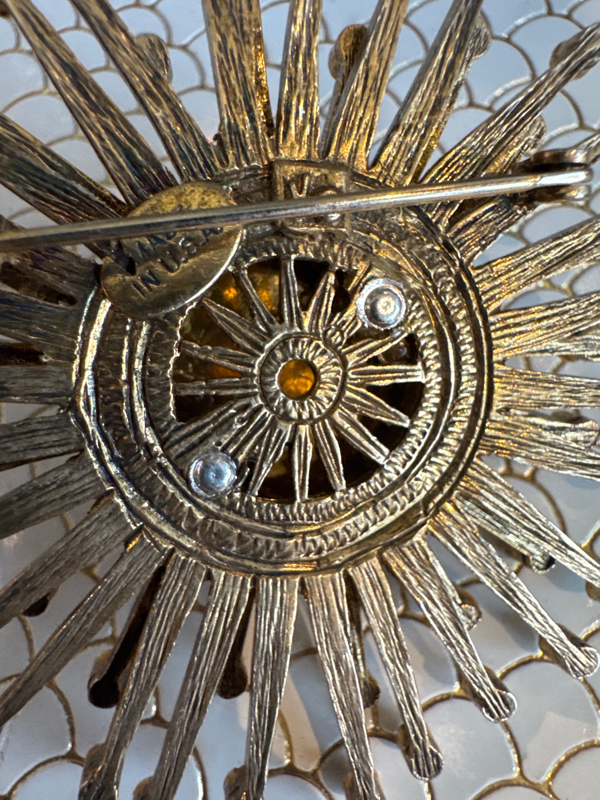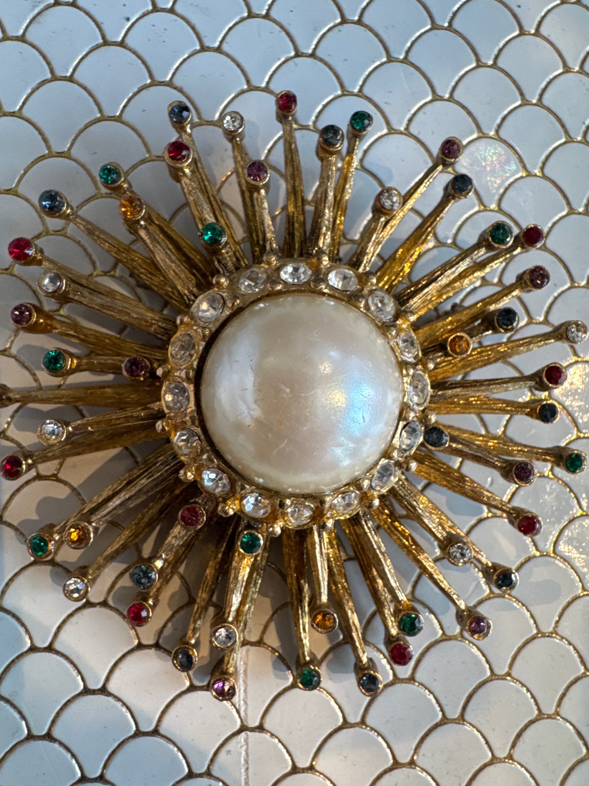 Beautiful 1960s Sputnick brooch with pearls and rhinestones. Marked made in USA.