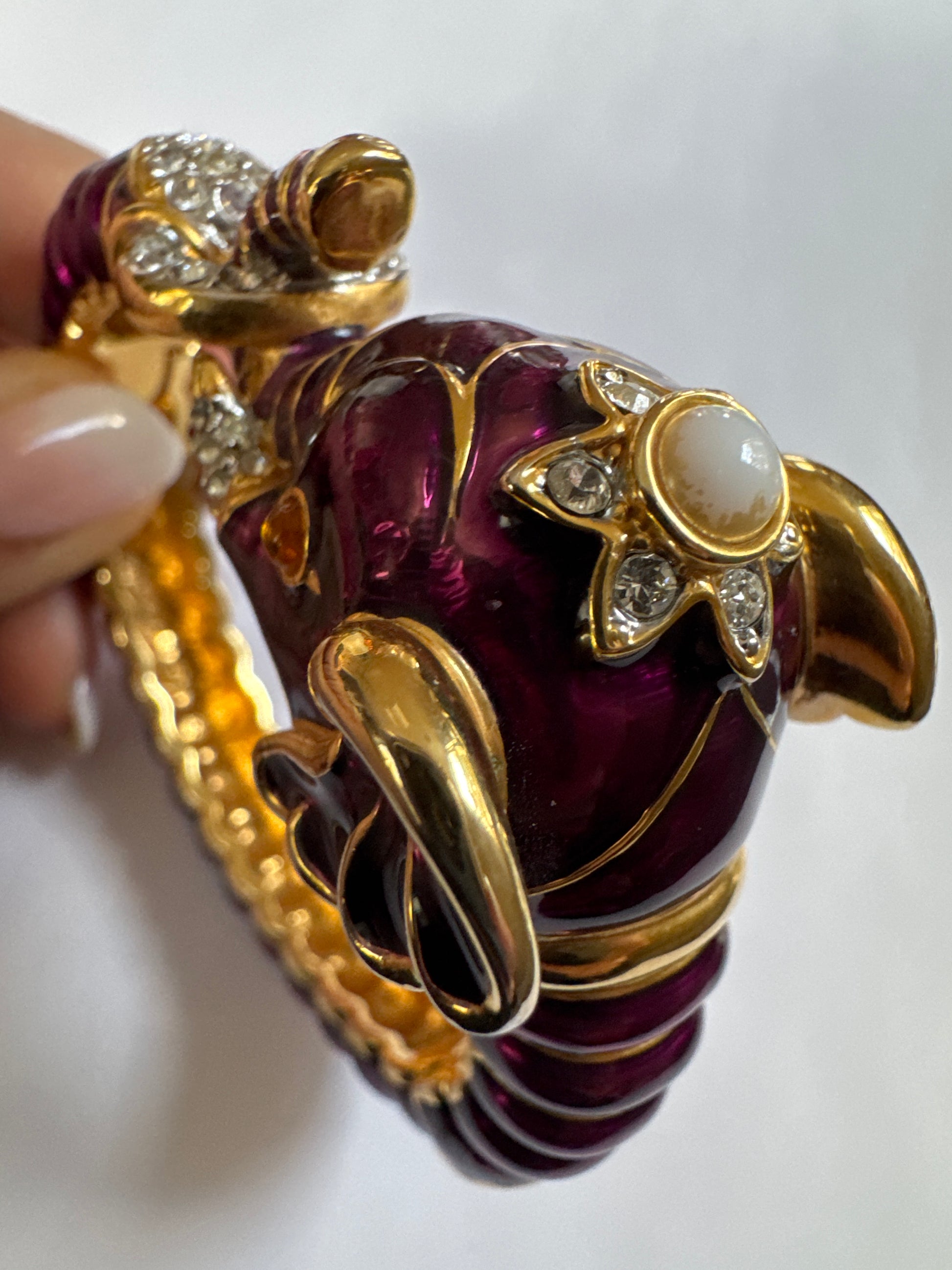 Beautiful 1990s signed Kenneth J Lane purple metallic enamel elephant clamper with rhinestones