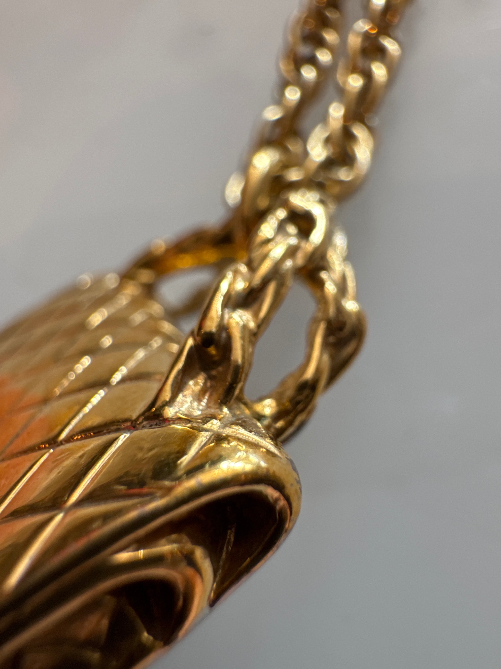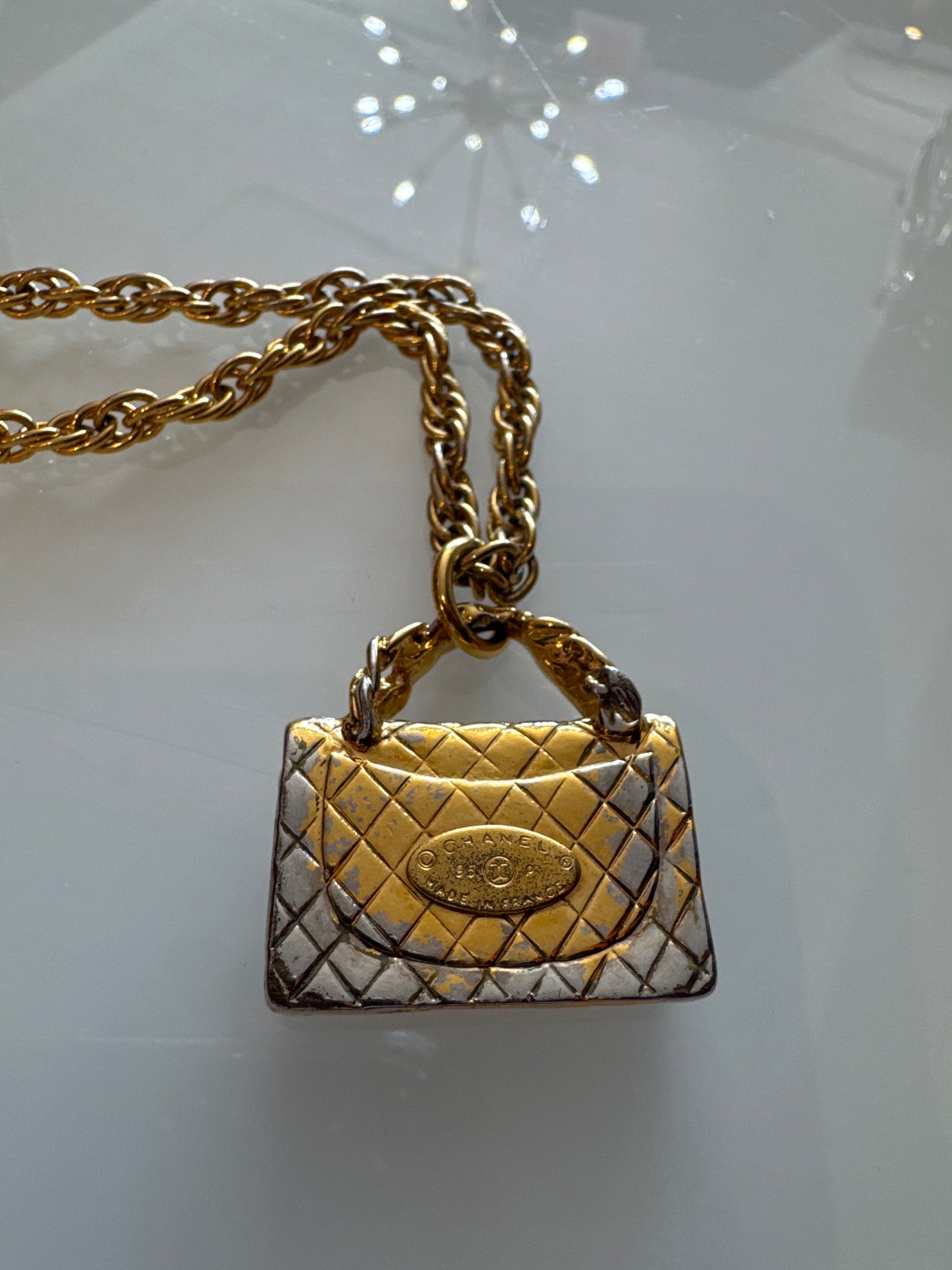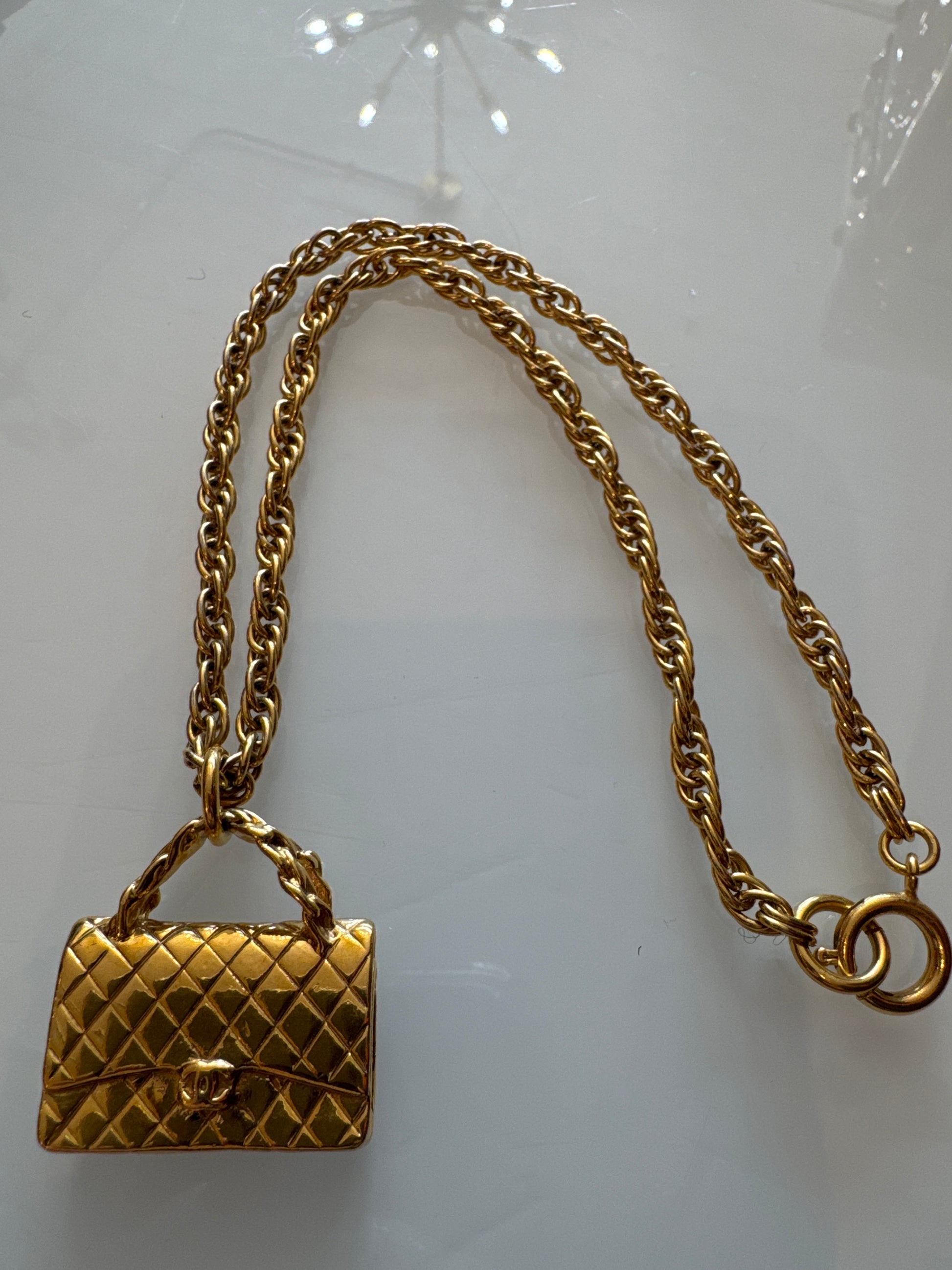 Beautiful gold tone, Chanel necklace with mini handbag pendant. Comes with box.
