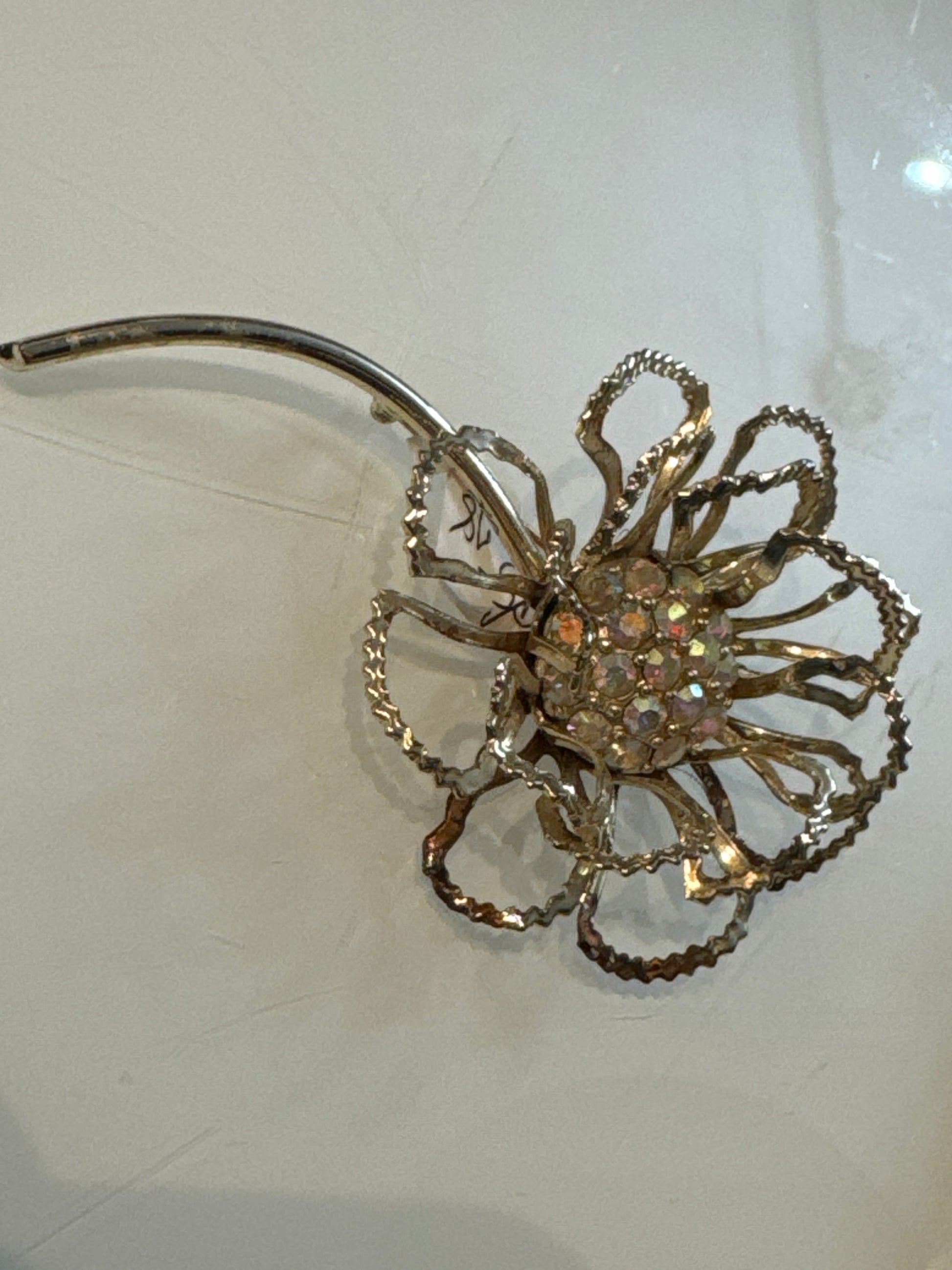 Beautiful jumbo sarah Coventry flower brooch in gold town with aurora borealis center