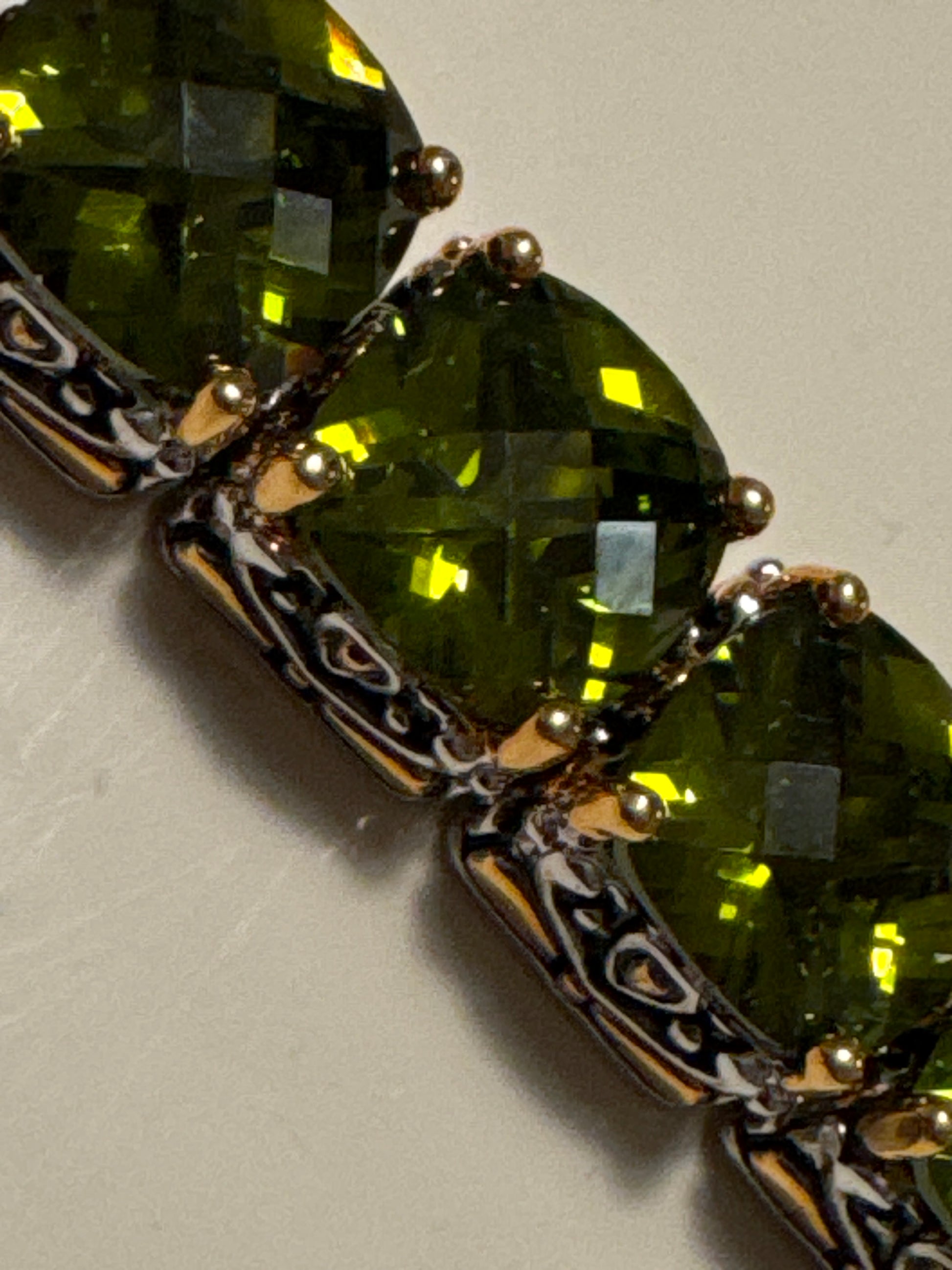 This stunning Park Lane bracelet features radiant cushion-cut olive color crystals set in an ornate two-tone setting. Gold and silver tones intertwine in intricate scrollwork, giving this piece an antique, heirloom feel. Secure box clasp with safety closure ensures a perfect fit. A timeless statement piece for weddings, evening wear, or everyday elegance.