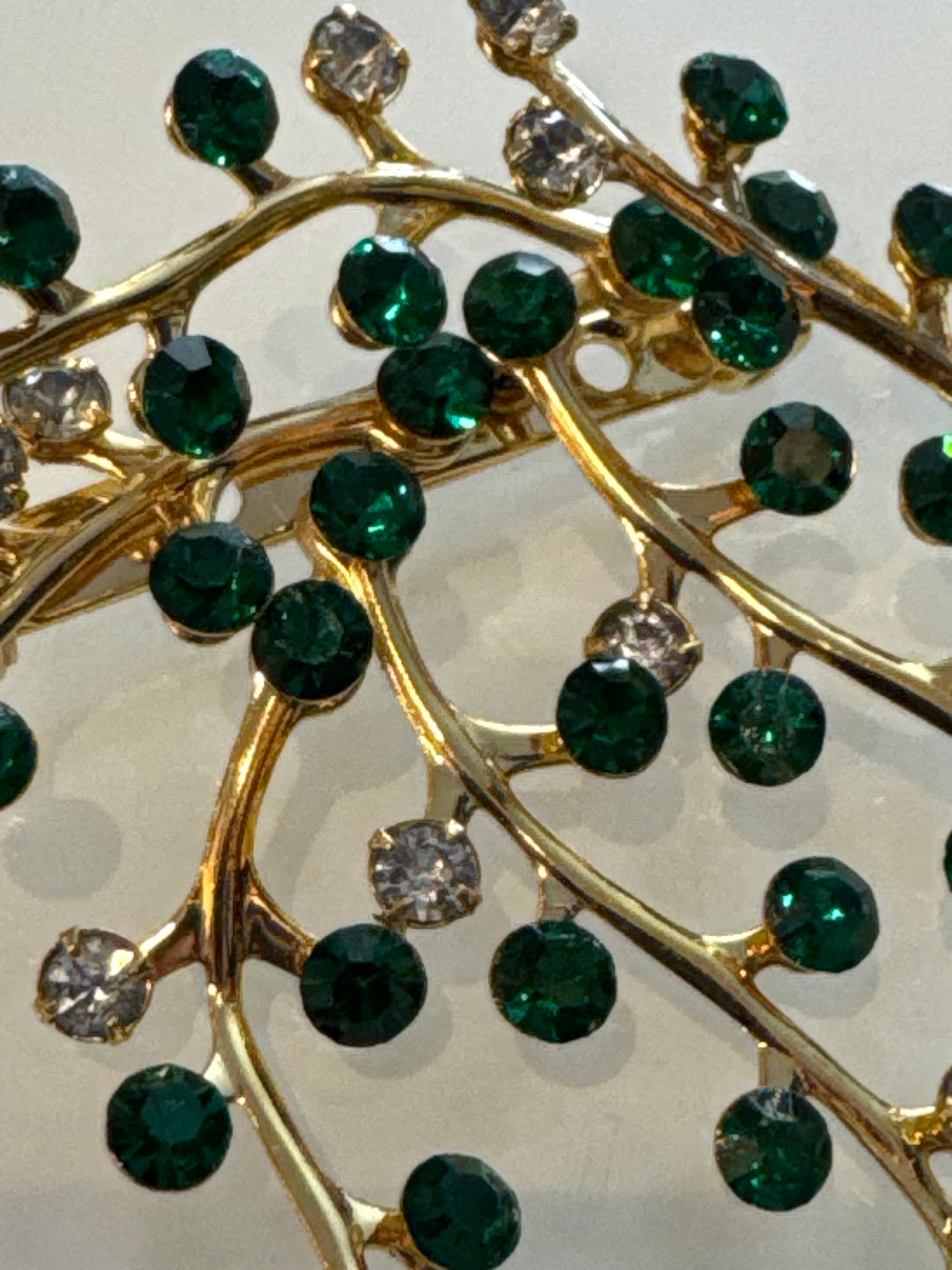 Beautiful unsigned, green and clear rhinestone branch brooch. Stones are super sparkly.