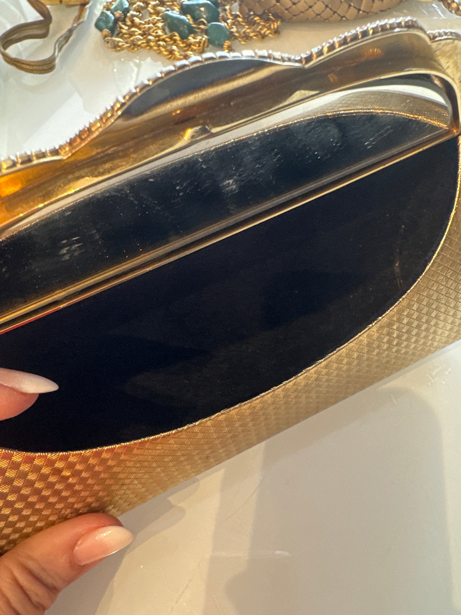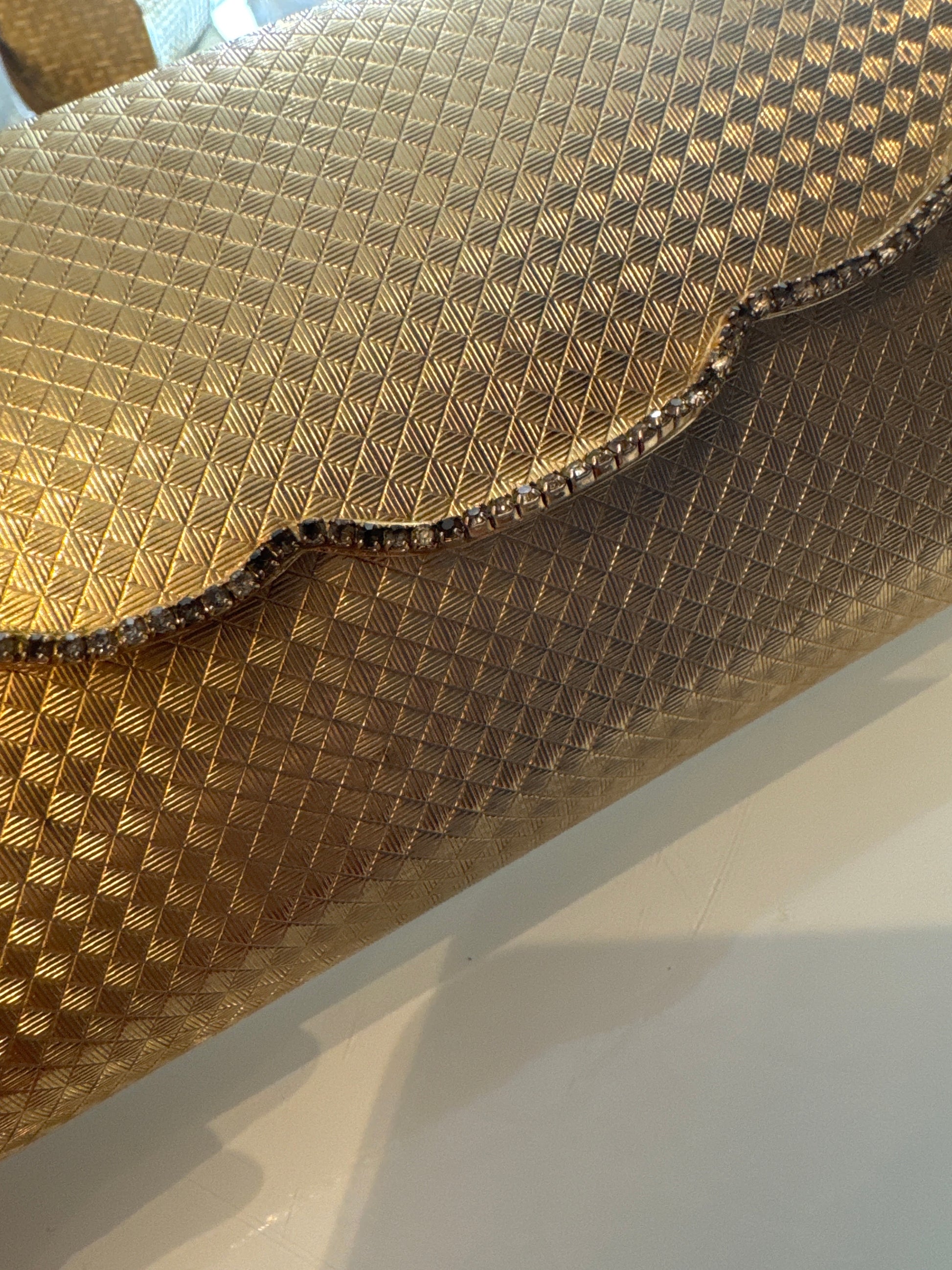 Beautiful vintage 1950s gold hardshell clutch with rhinestone detail, and mirror inside
