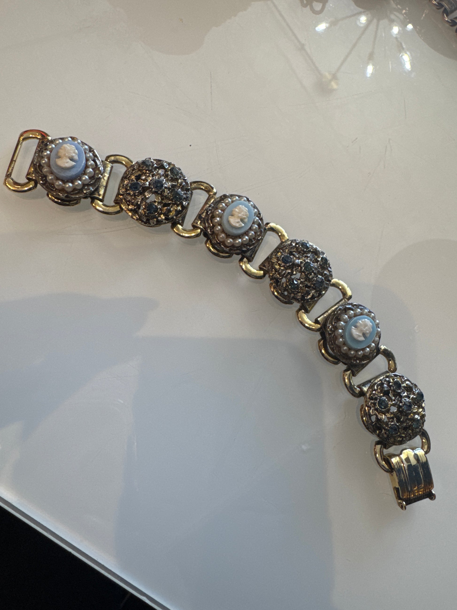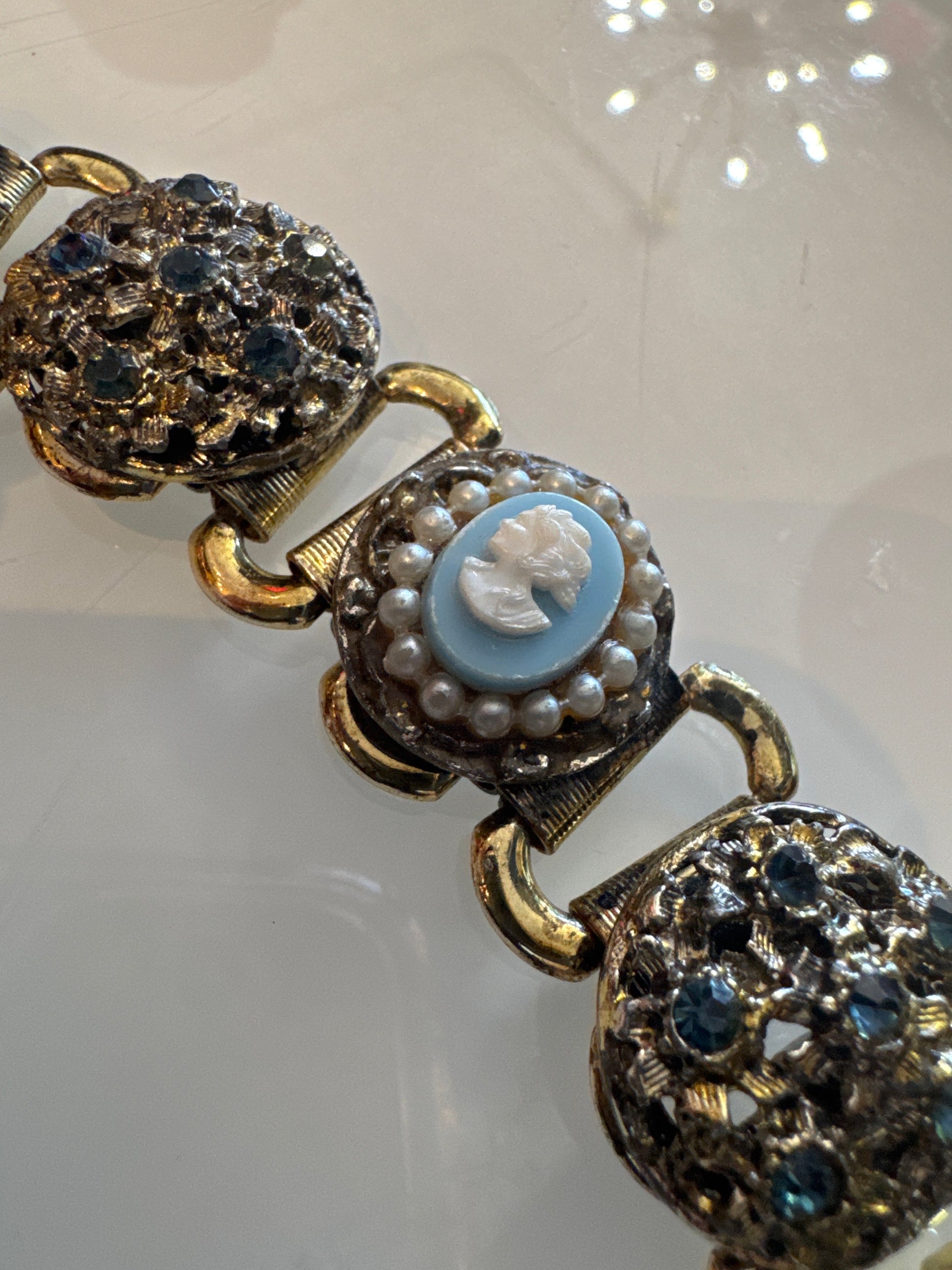 Beautiful vintage gold tone, rhinestone, and blue cameo link bracelet