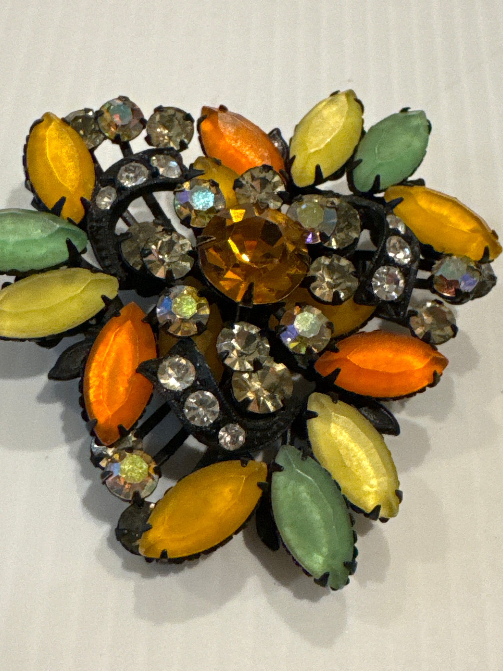 Beautiful vintage rhinestone brooch with pastel orange, green and yellow stones