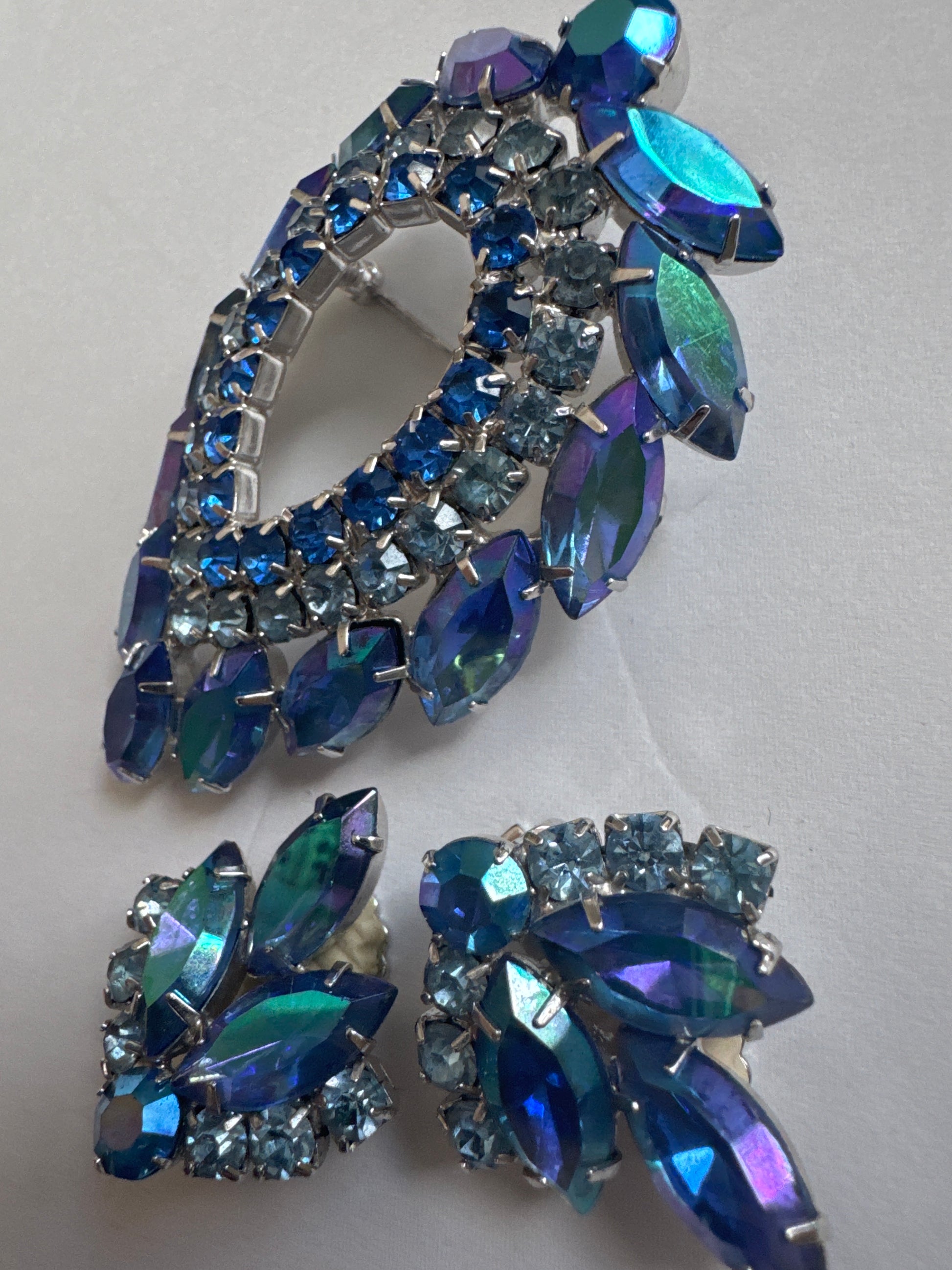 Beautiful vintage signed Sarah Coventry blue rhinestone brooch and earring set manufactured by D & E