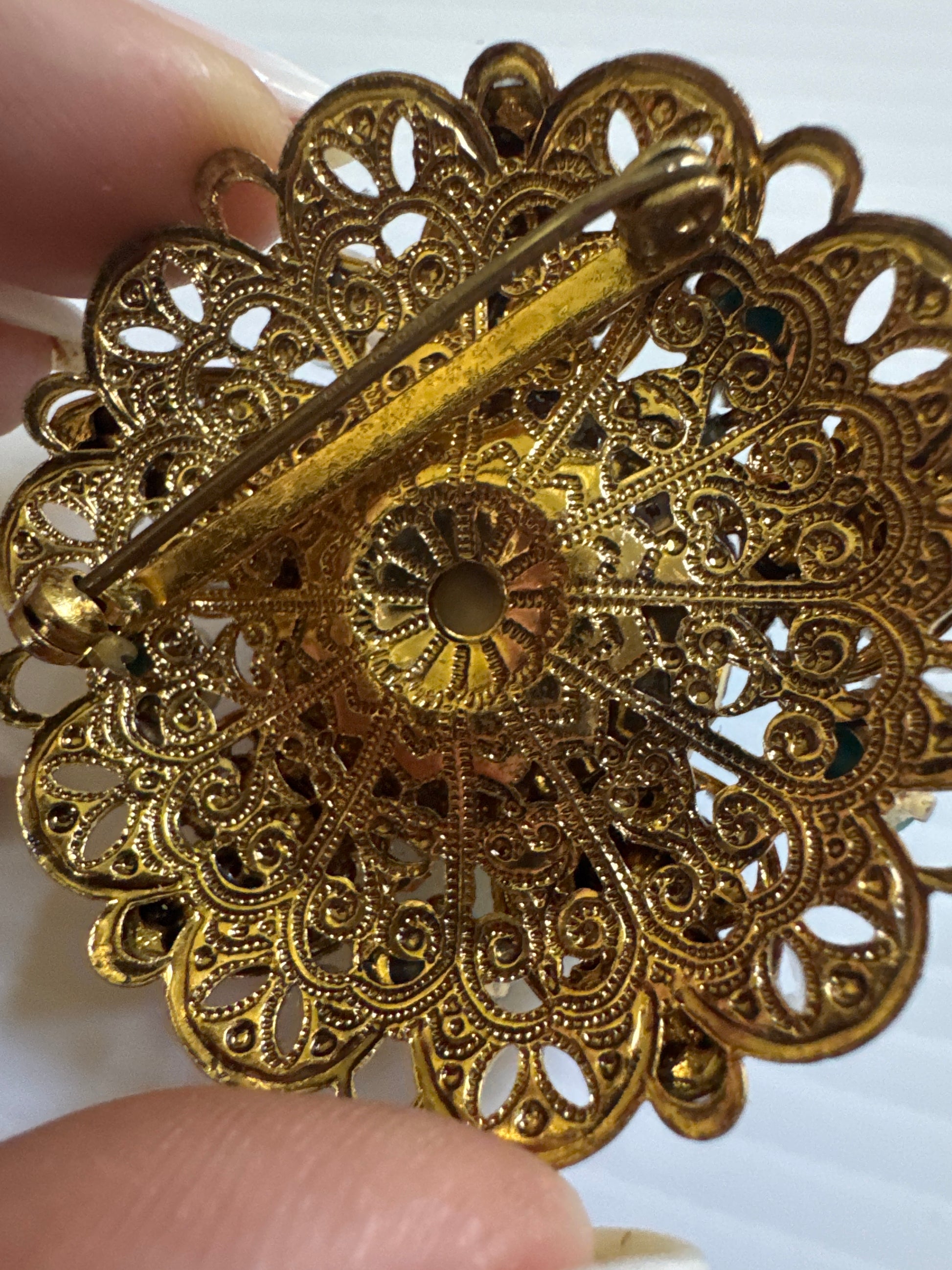 Beautiful vintage, signed West Germany, robin's egg blue cabachon filigree brooch with turquoise stones, rhinestones, and pearls