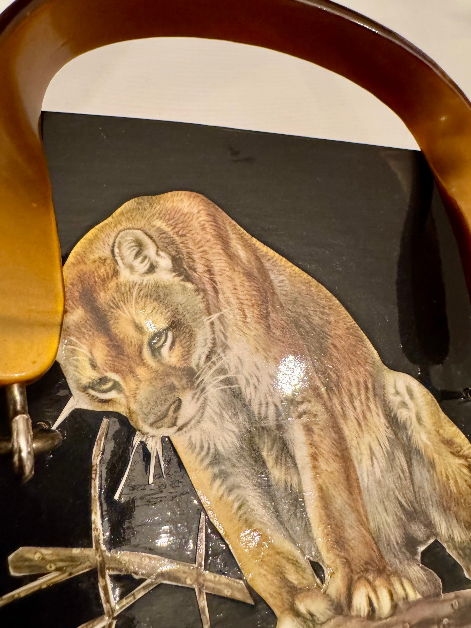Black wood decoupage tiger box bag with lucite handle and beautiful interior