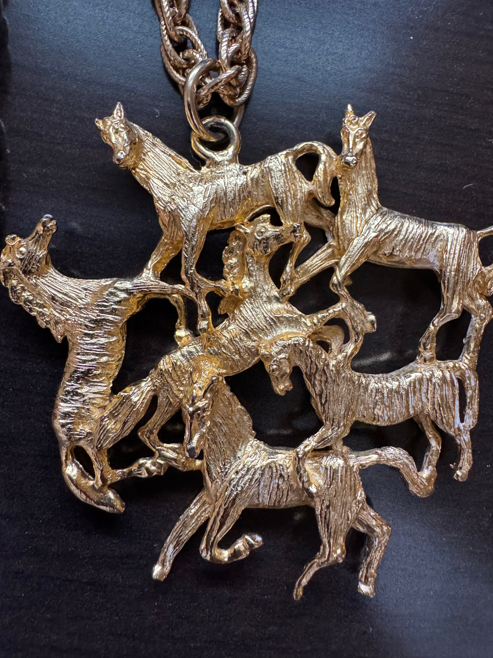 calling all horse lovers! This 1970s gold tone pendant necklace is a must have!