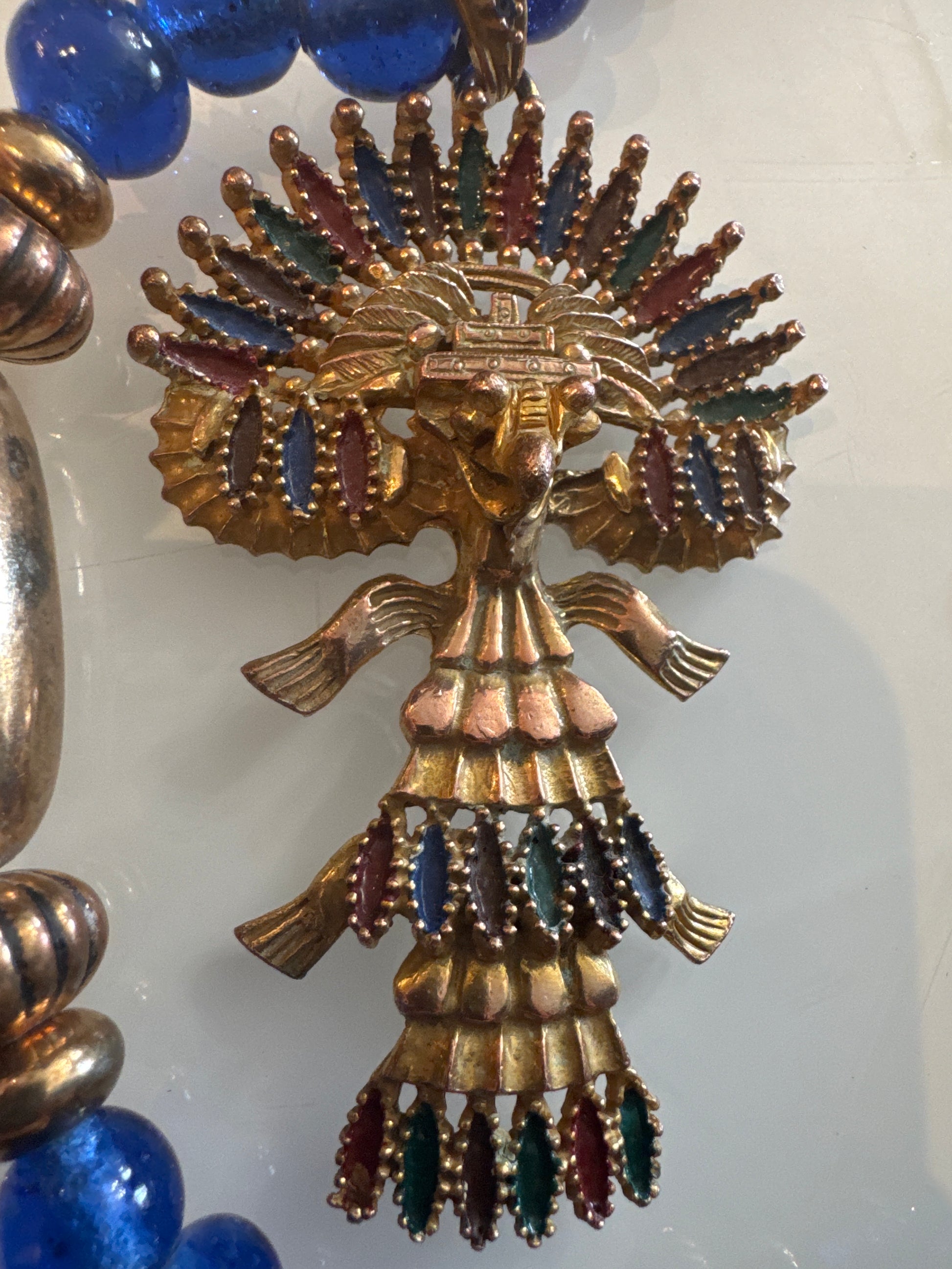 CASTLECLIFF 1970s Mayan/Aztec Pendant Necklace Larry Vrba, Cobalt Blue Glass, Multi Color enamel