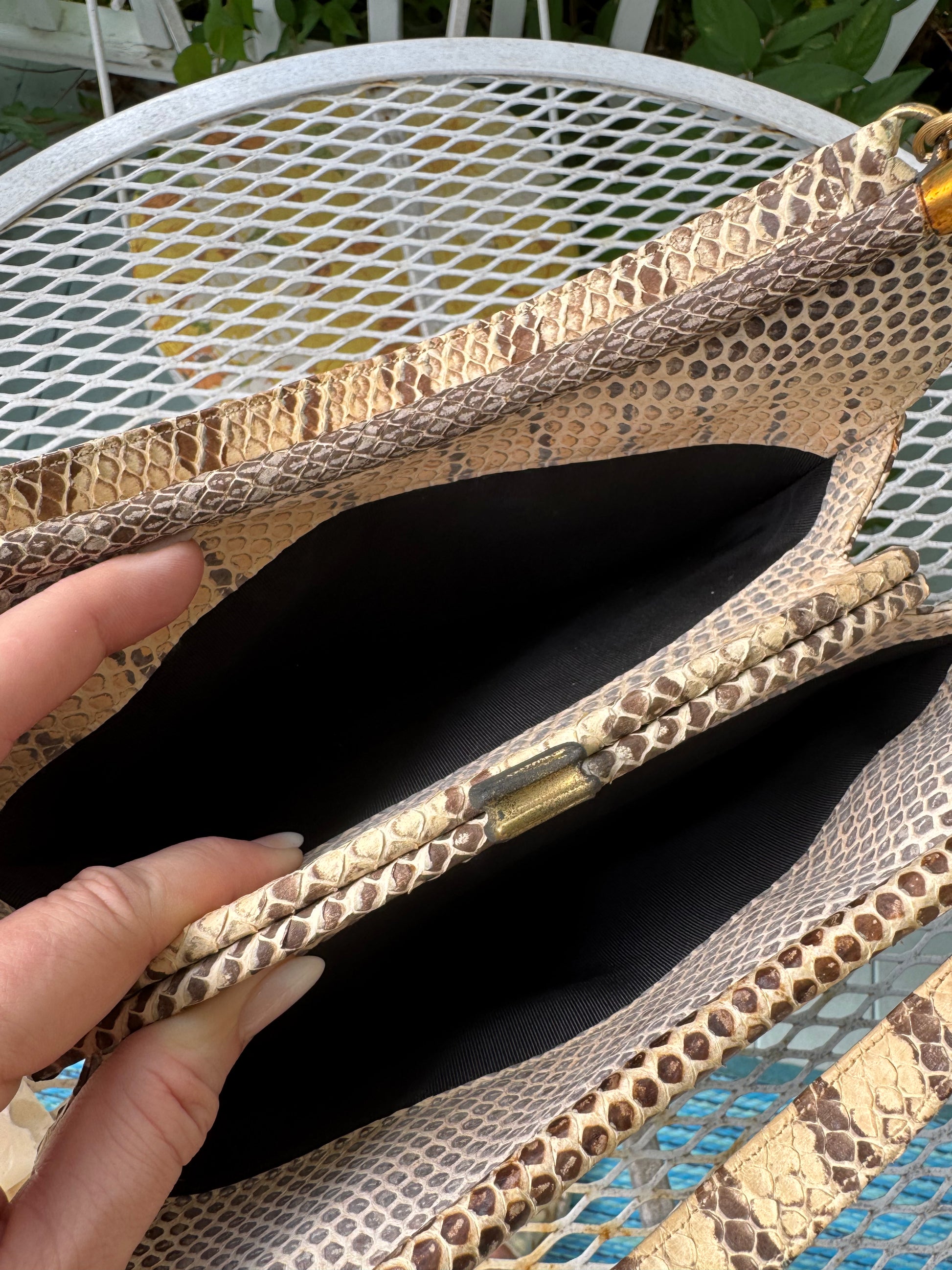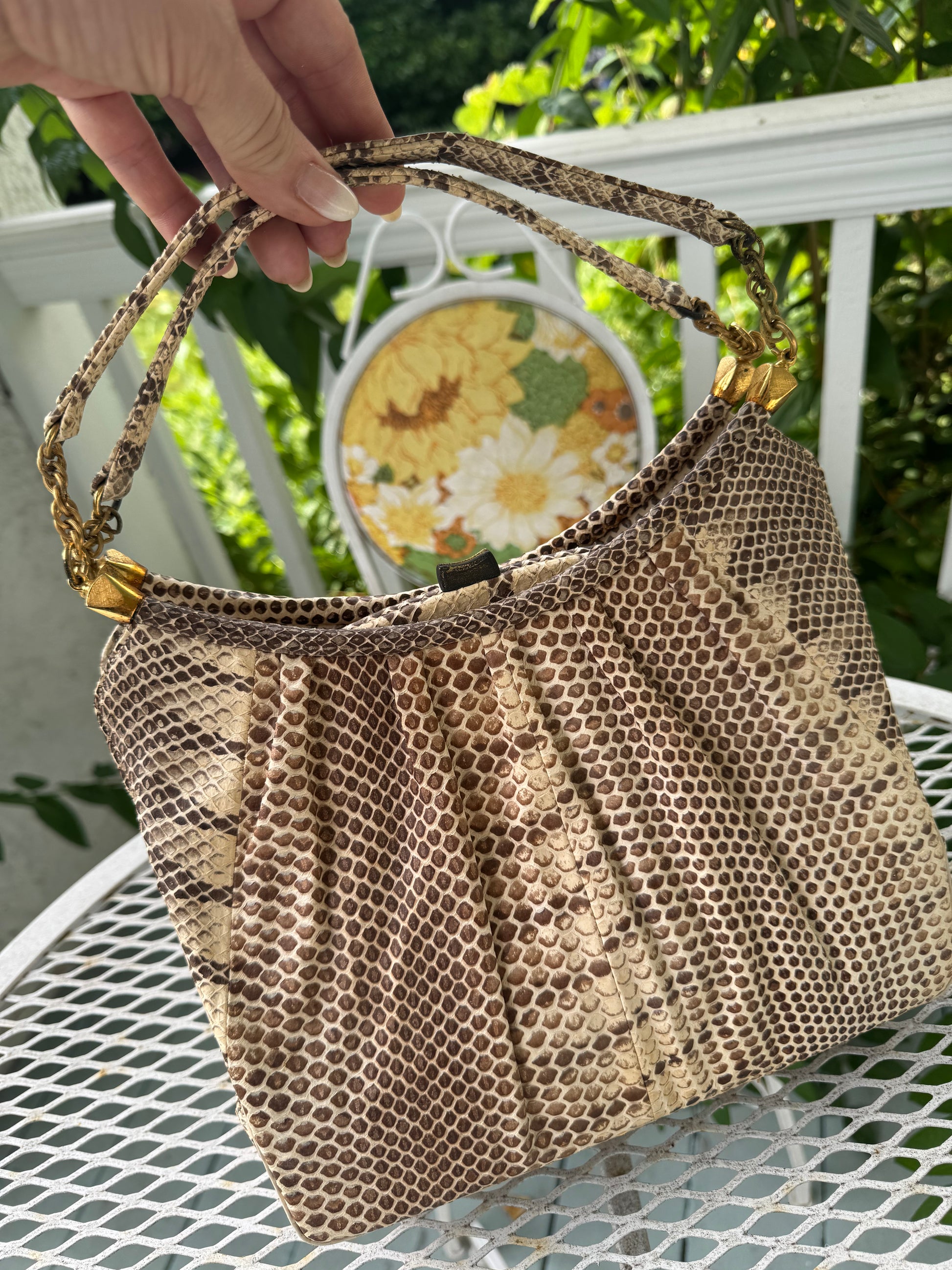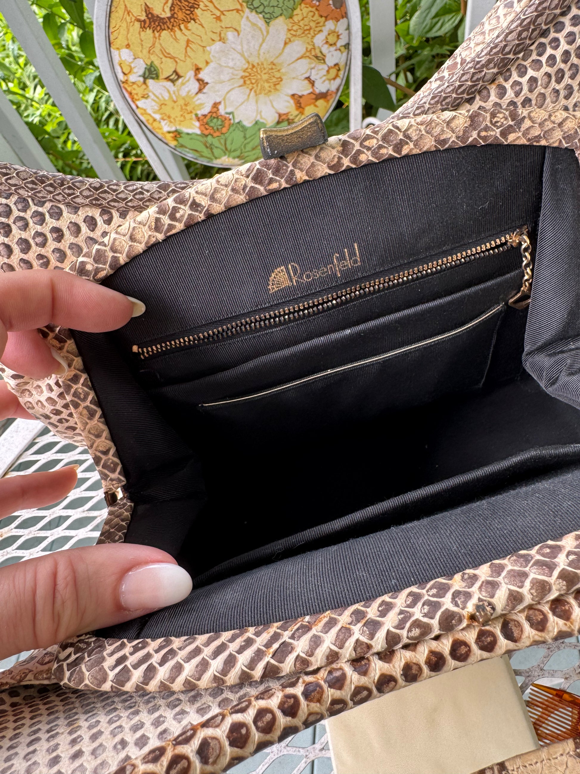 An exquisite vintage handbag by renowned designer Rosenfeld, crafted from genuine python in a sophisticated palette of taupe and ivory. Featuring soft pleating, gold-tone hardware, and the original black faille lining stamped “Rosenfeld,” this mid-century gem also includes its rare, matching coin purse. A true statement piece from the golden age of American handbag design, perfect for collectors and lovers of timeless luxury.