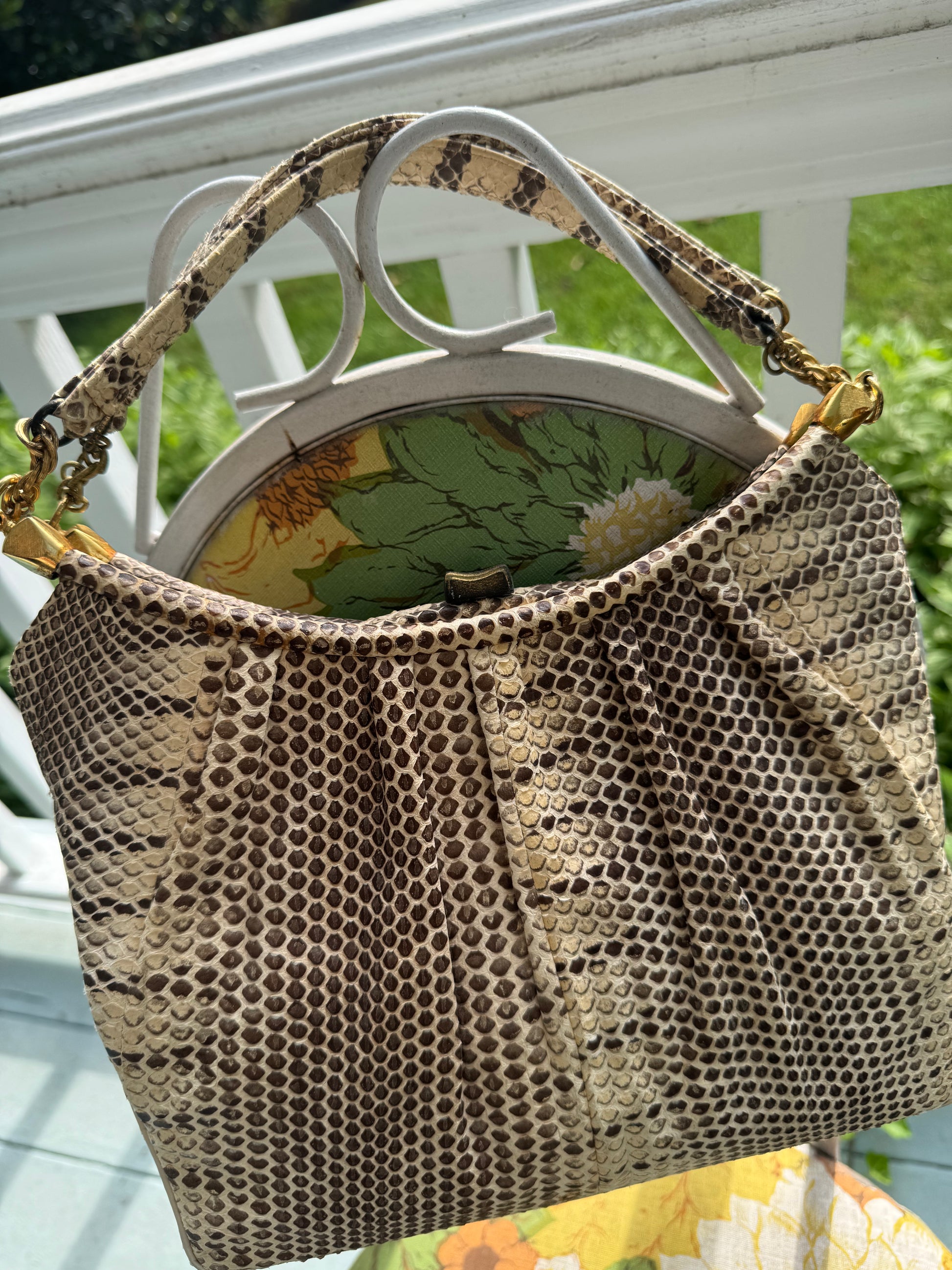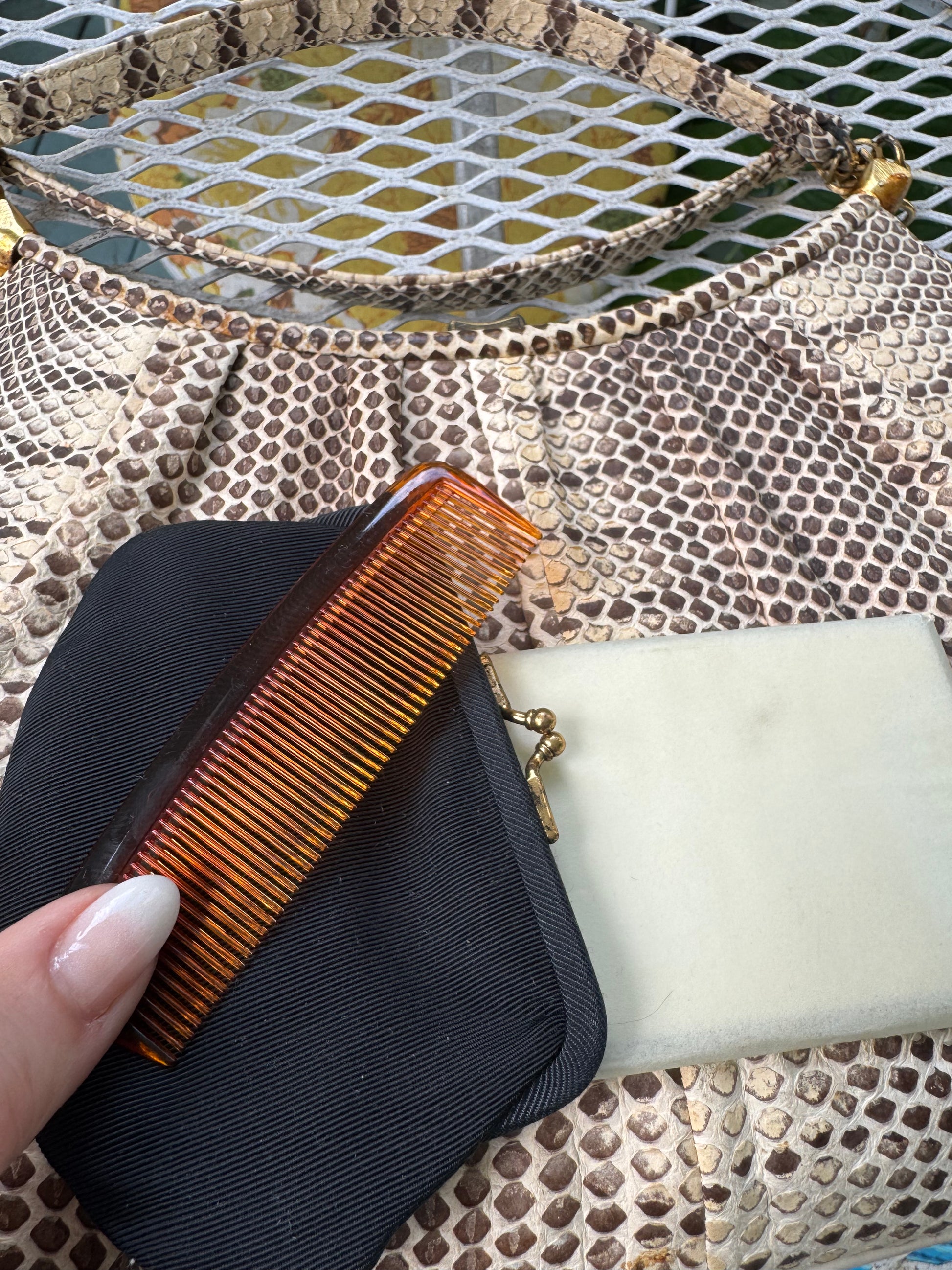 Fabulous 1960s beige colored python top handle purse with two Outside pockets, original comb mirror and coin purse by Rosenfeld
