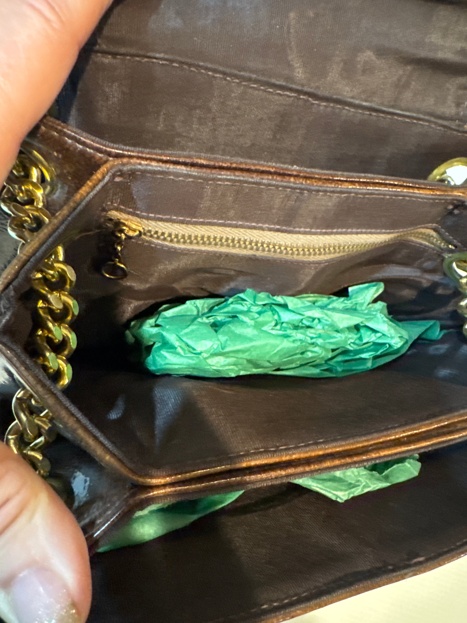fabulous 1960s brown vinyl triple compartment handbag with chains and decorative closure