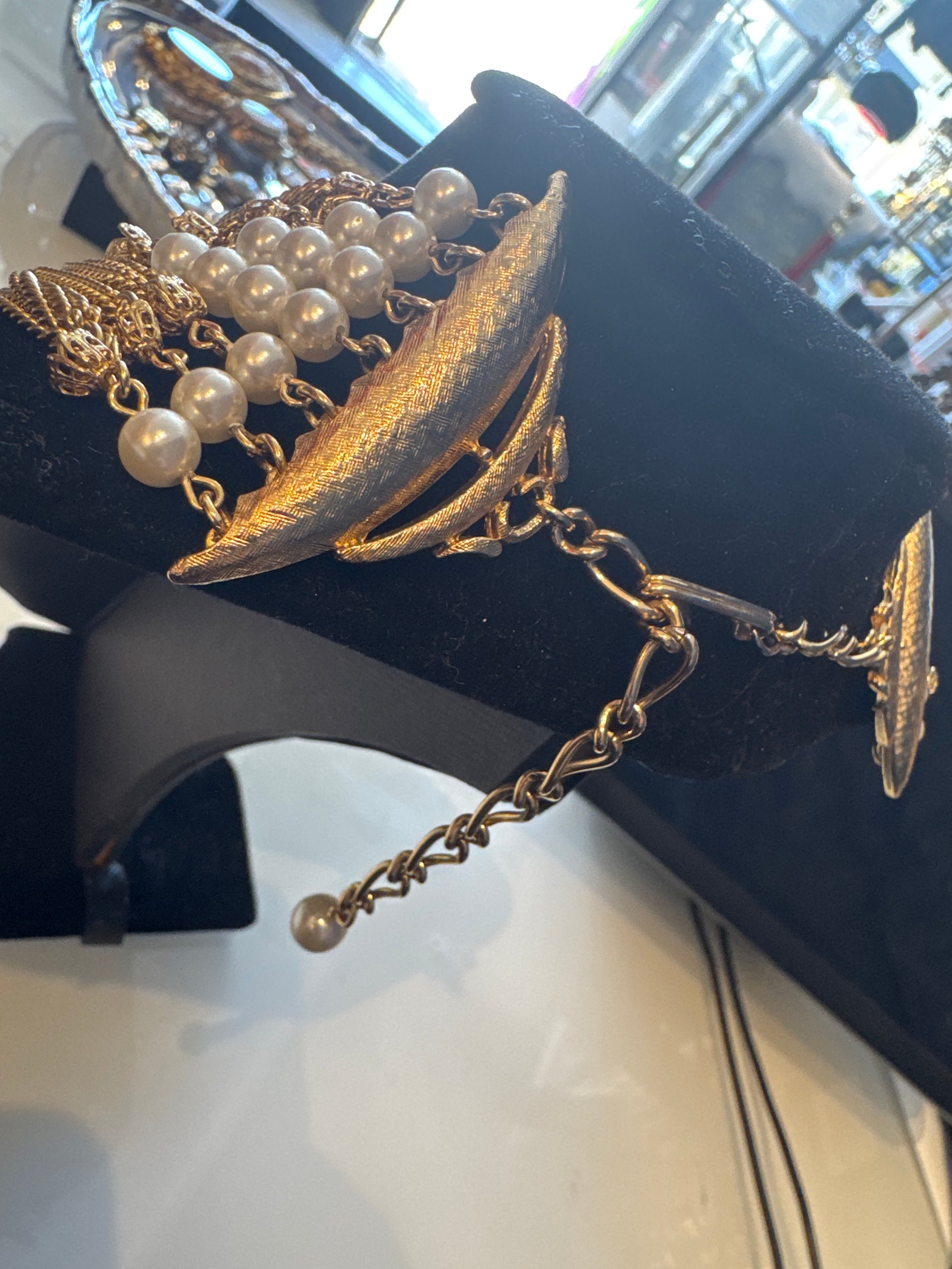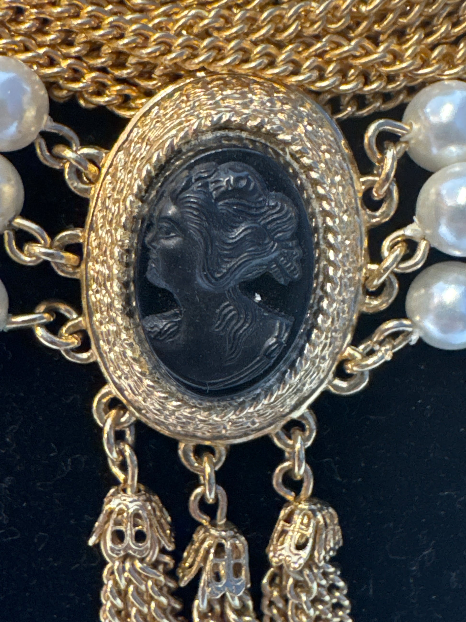 Fabulous vintage multi strand, gold tone, cameo necklace with pearls and tassel