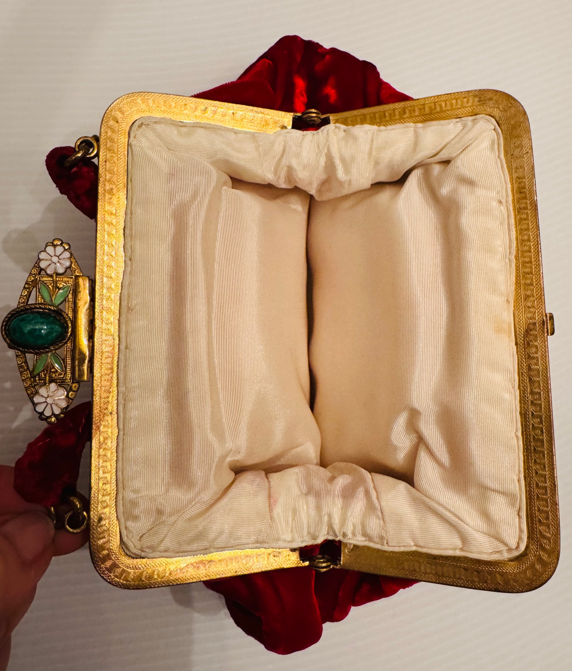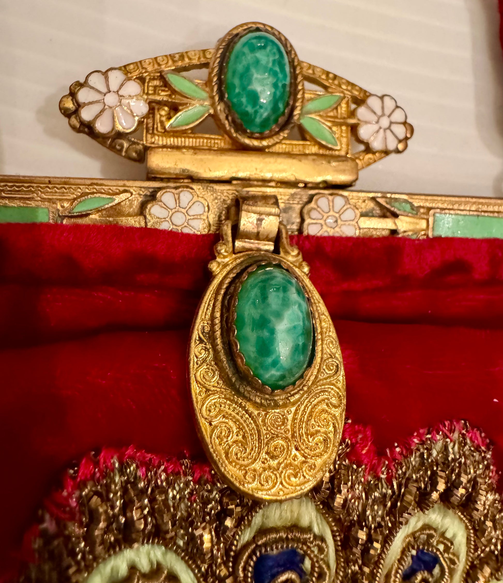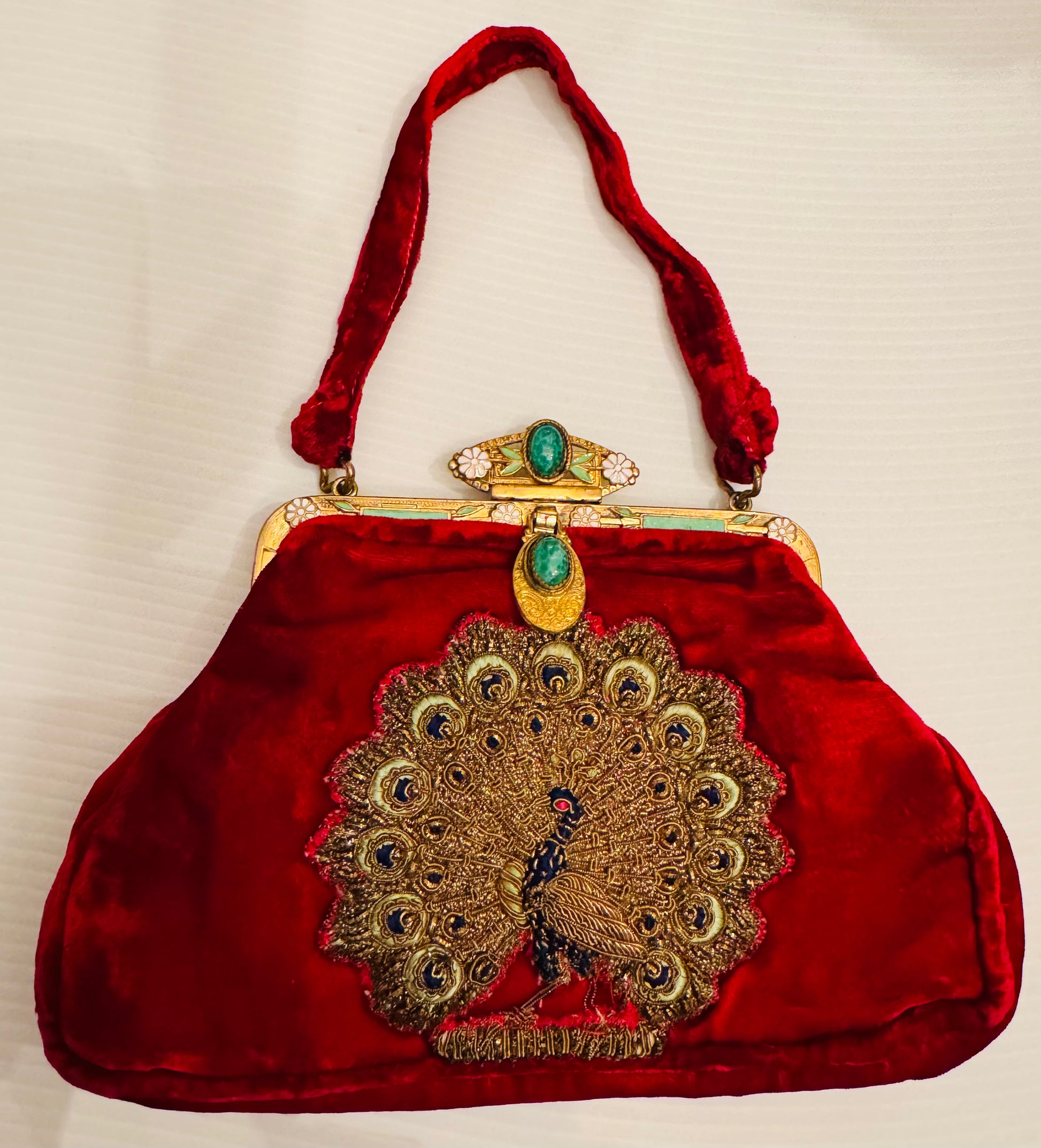 Gorgeous 1920's red velvet peacock bag with enamel decorative closure