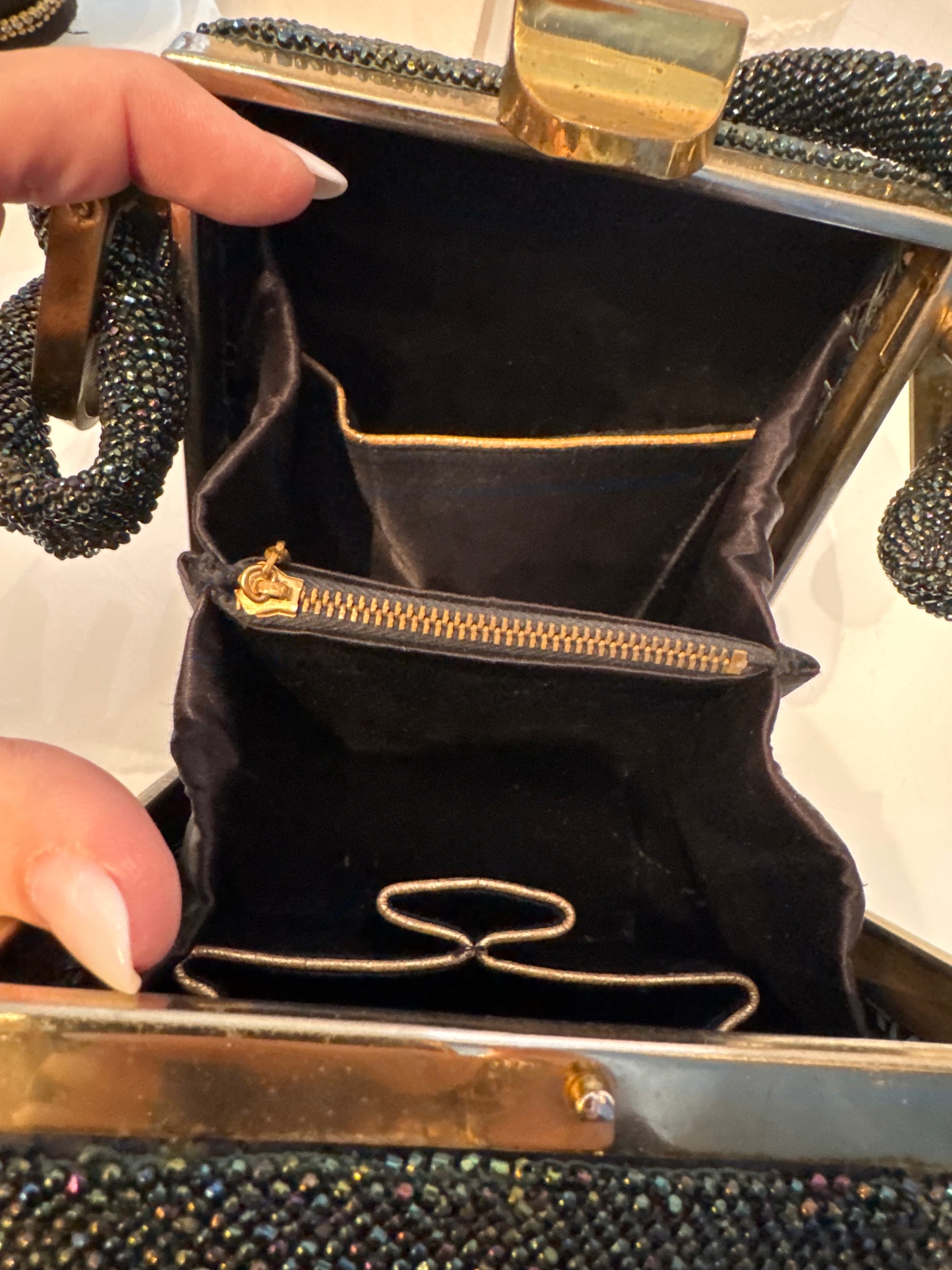 gorgeous 1940s beaded bag with dark green blue and bronze beading. Extra thick handle in mint condition.