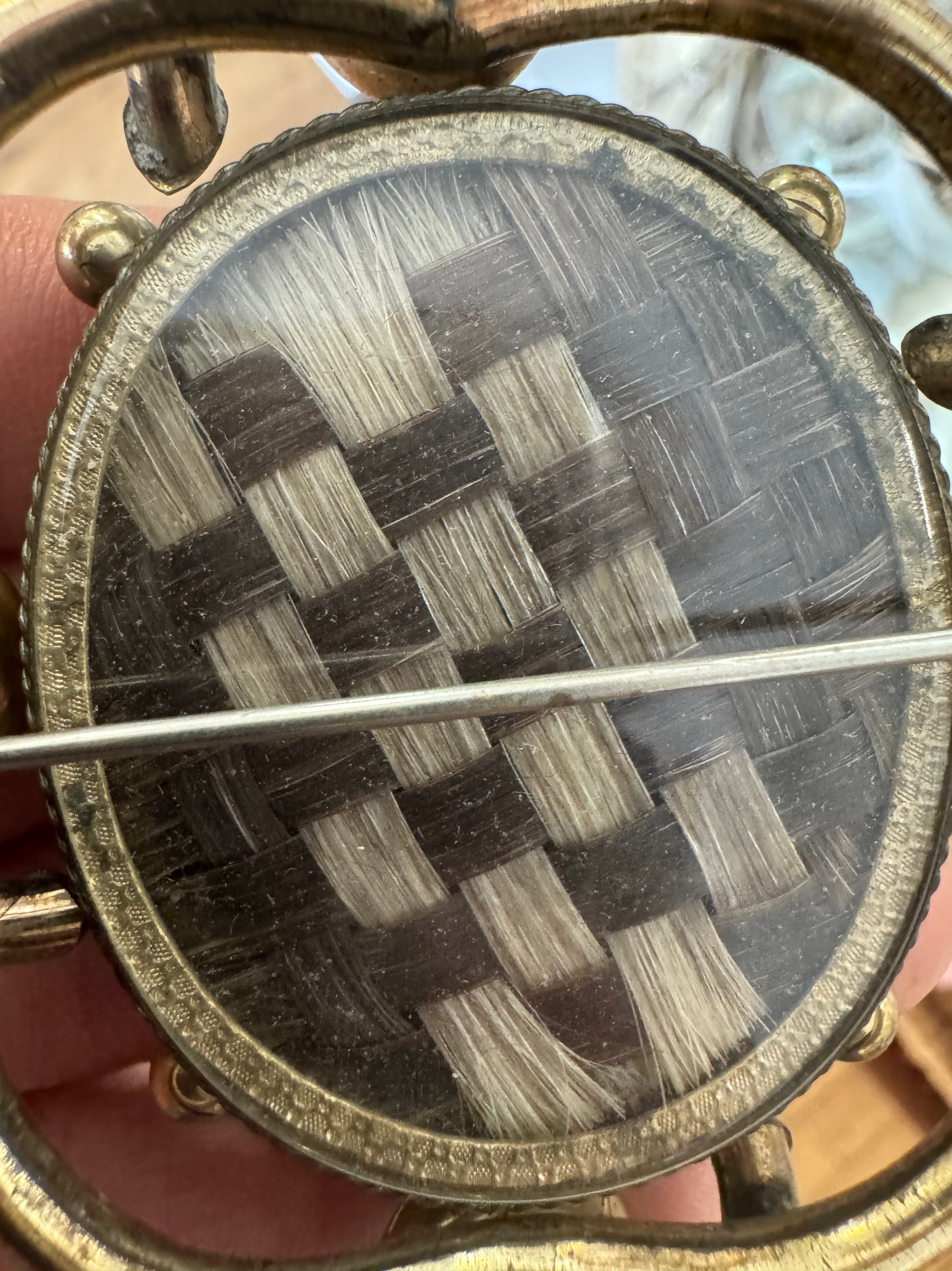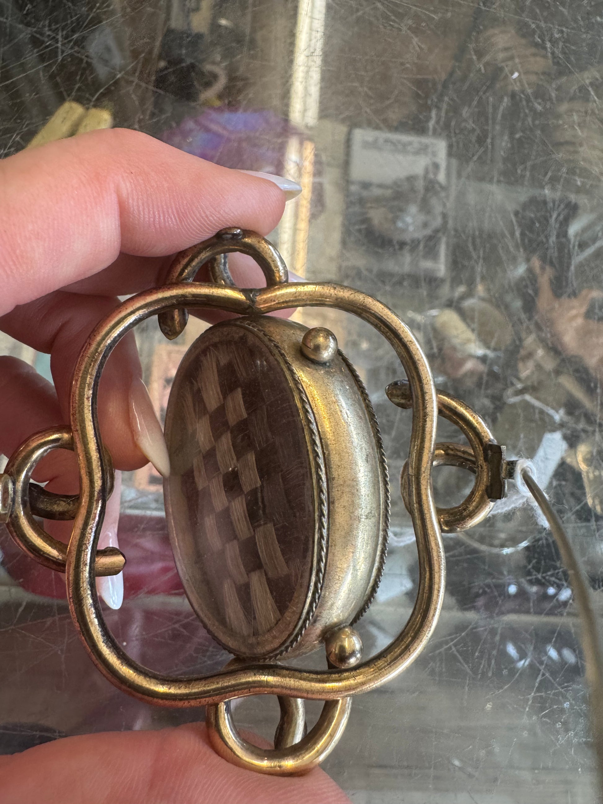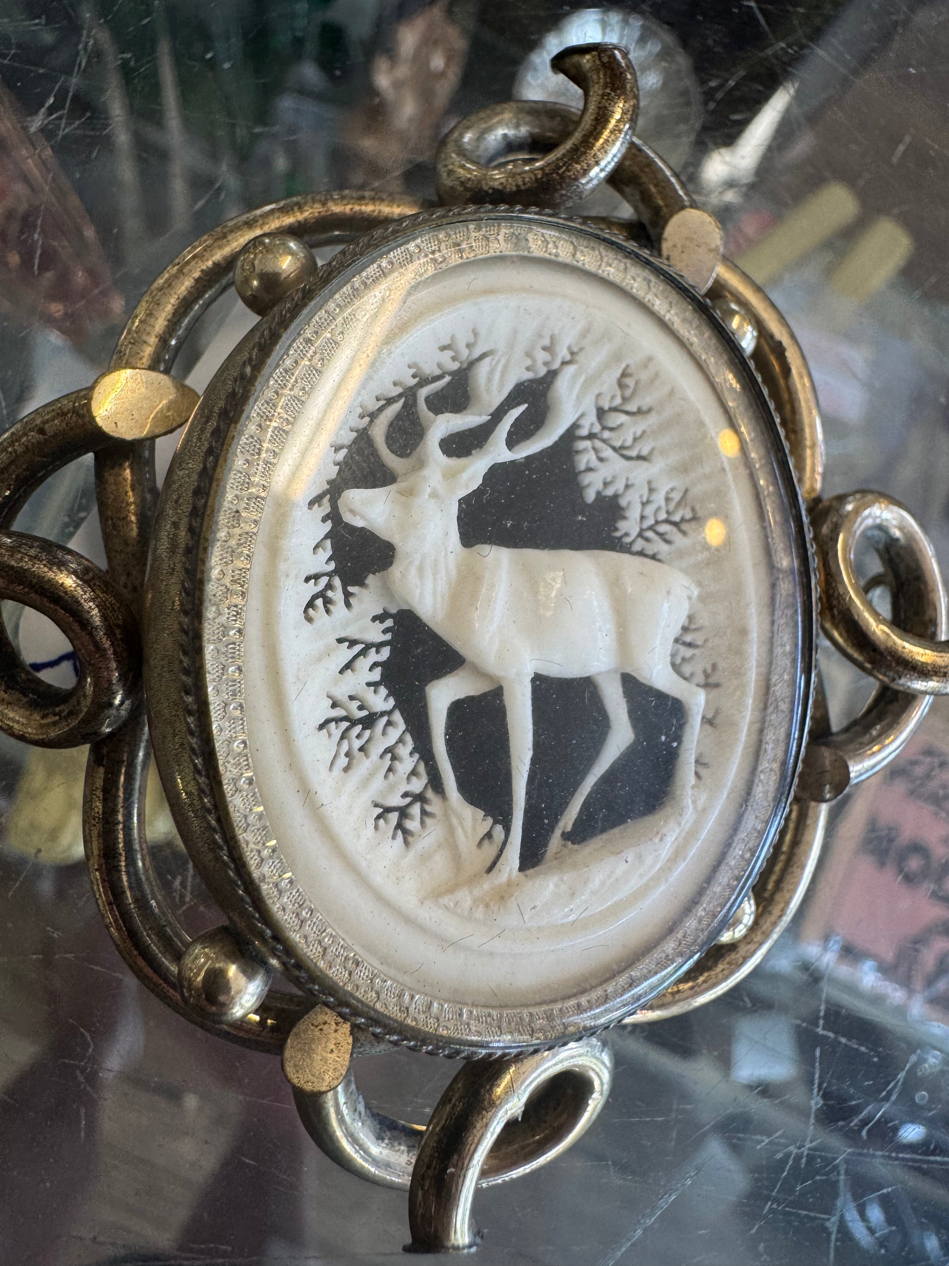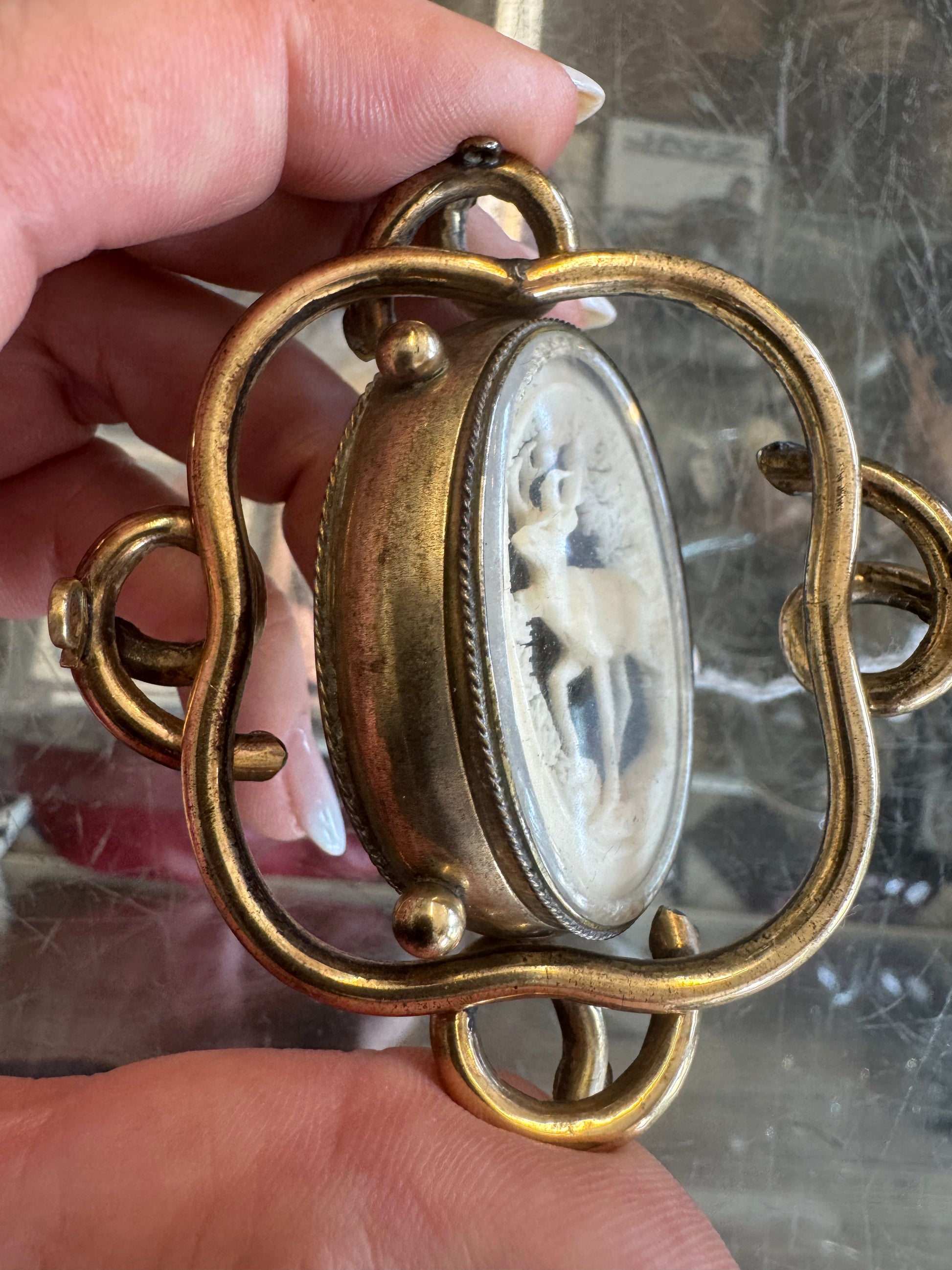 WOW!! A poignant and rare example of 19th-century sentimentality, this antique swivel brooch features a finely molded stag cameo on one side and intricately woven hair on the reverse — both protected under domed glass. Set in a gold-tone scrollwork frame,