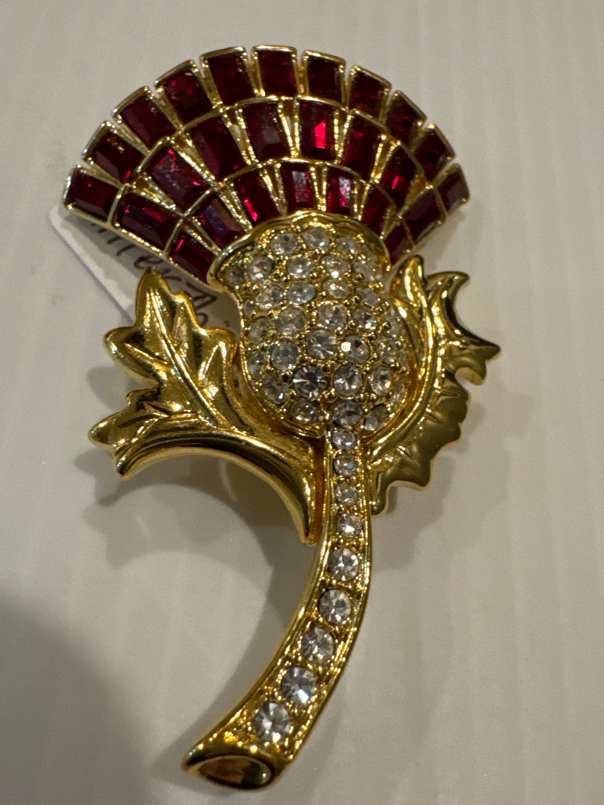 Gorgeous vintage signed Nolan Miller with red and clear rhinestones flower brooch