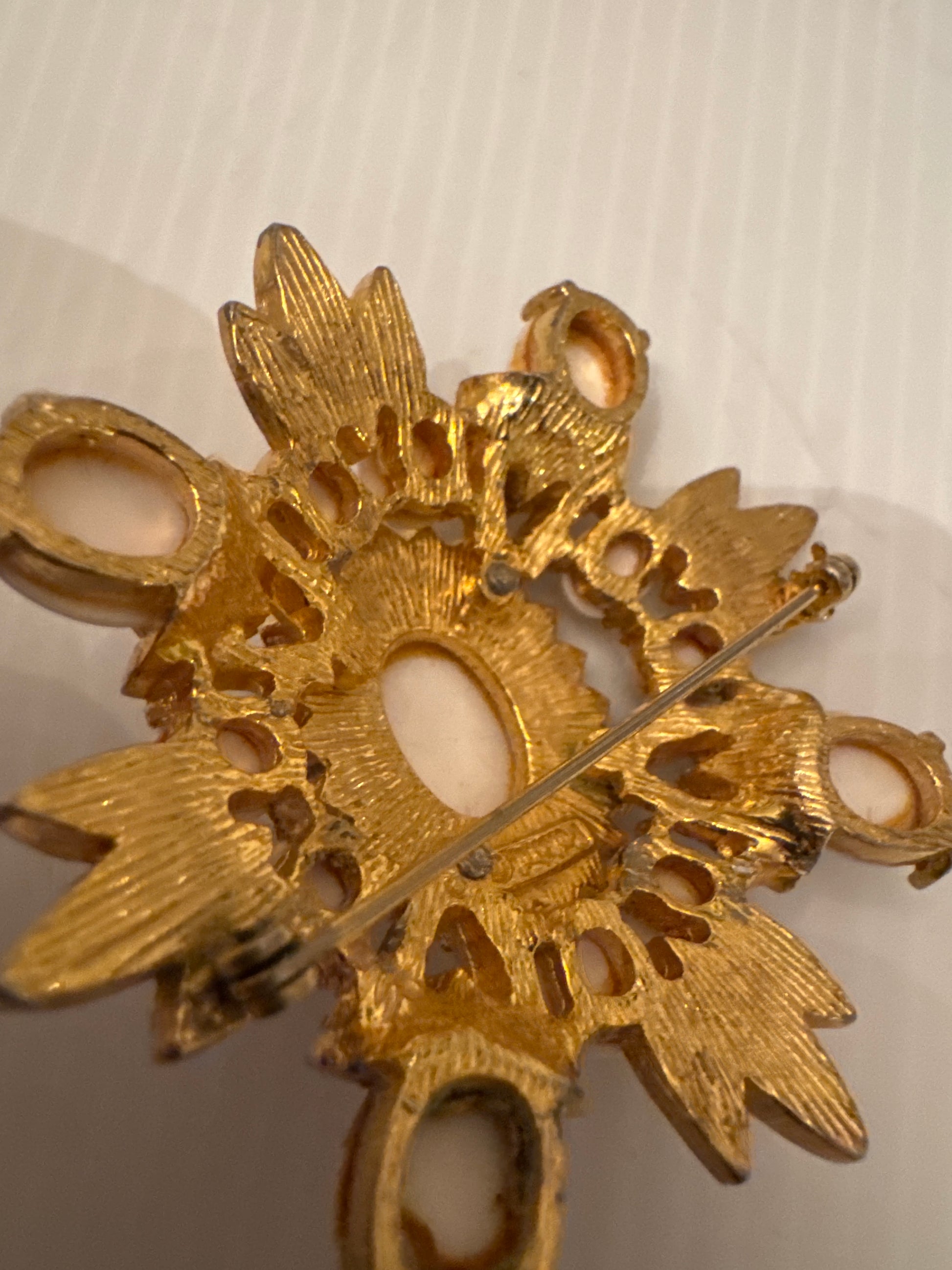 Polcini is one of those mid-century makers that collectors love once they discover them — heavy, beautifully cast, incredible stones, and that lush 1960s glamour. It’s the kind of brooch that looks like it belongs on couture. Measures 2"