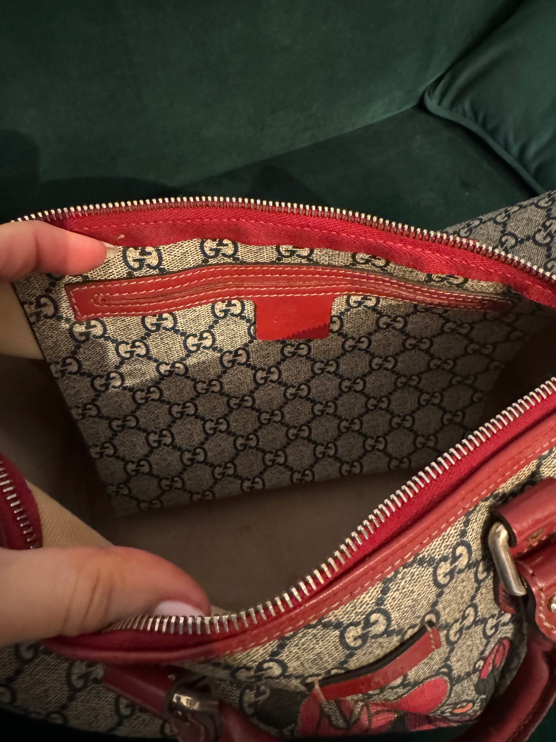 Pre-loved Gucci Boston Joy Tattoo Heart canvas with red leather top handle handbag. Comes with dust bag. Interior needs a little cleaning.