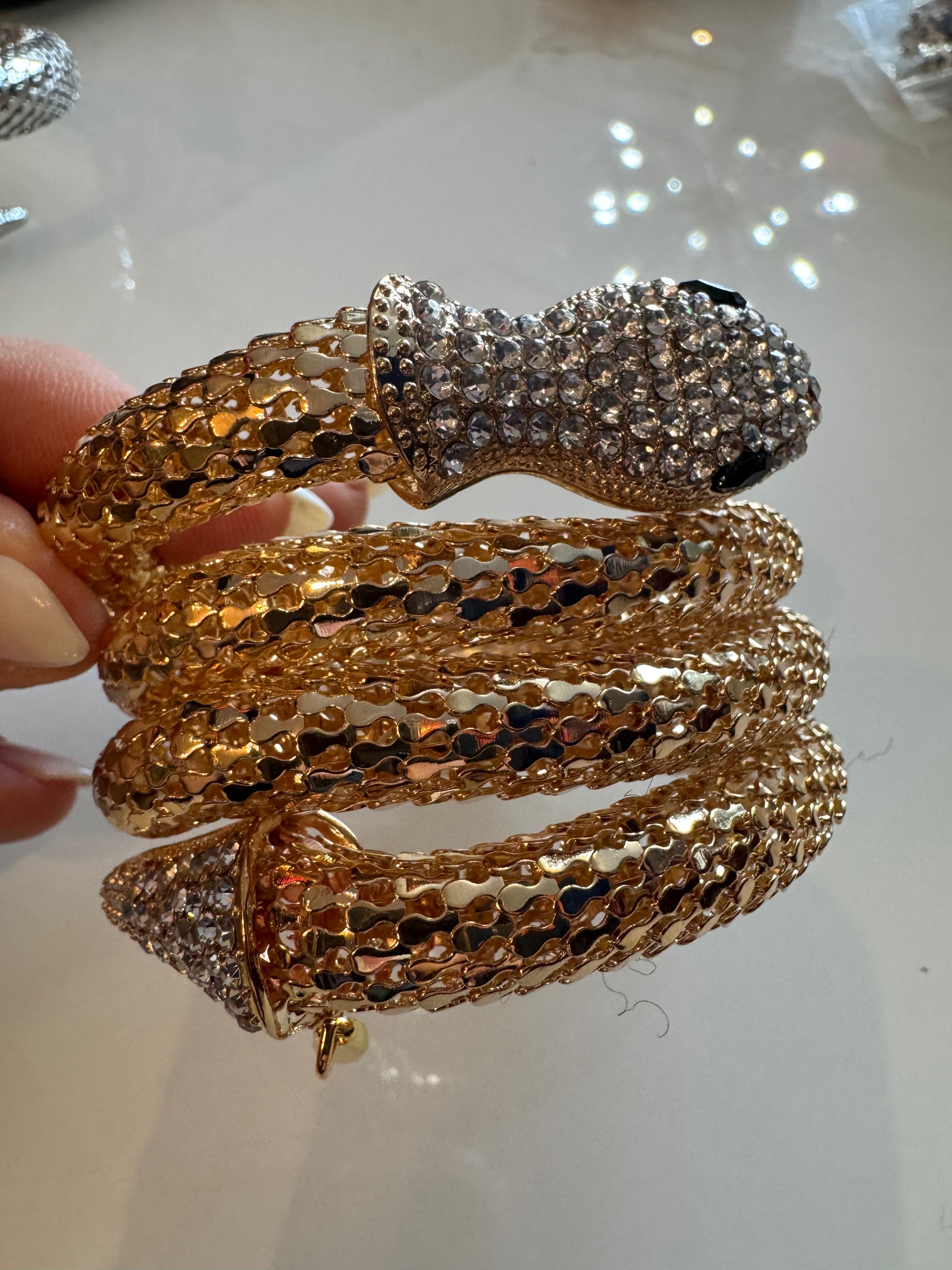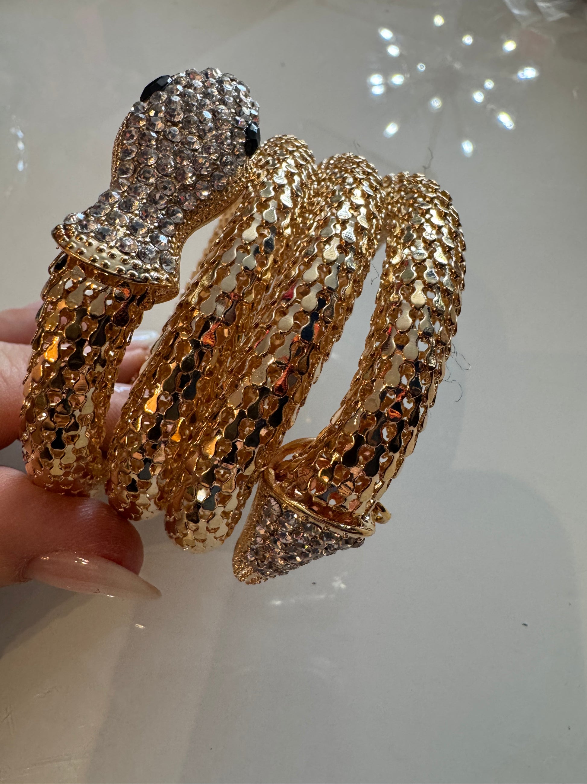 signed 1980s KJL Kenneth J Lane multi wrap, snake bracelet in gold tone with rhinestones