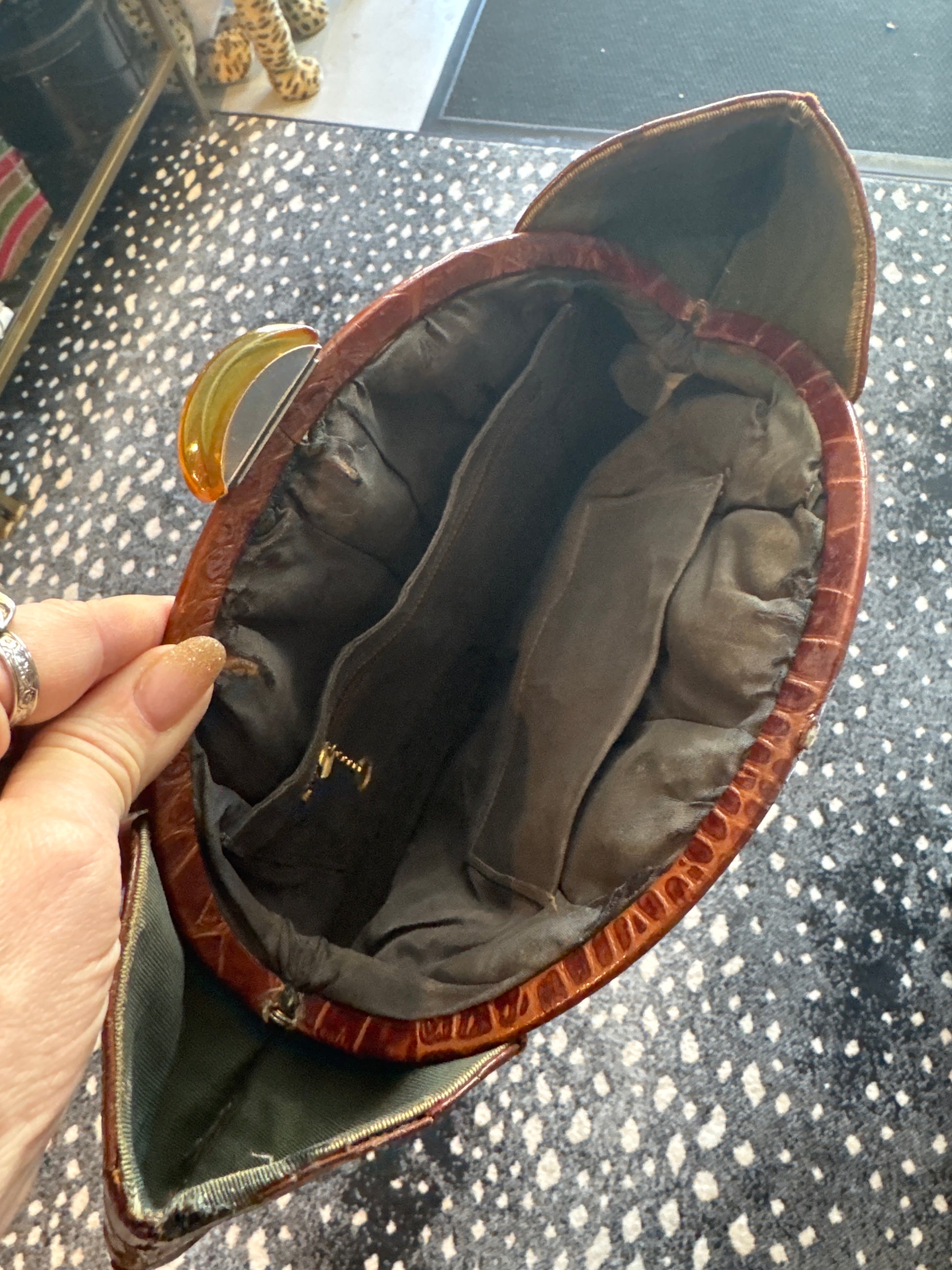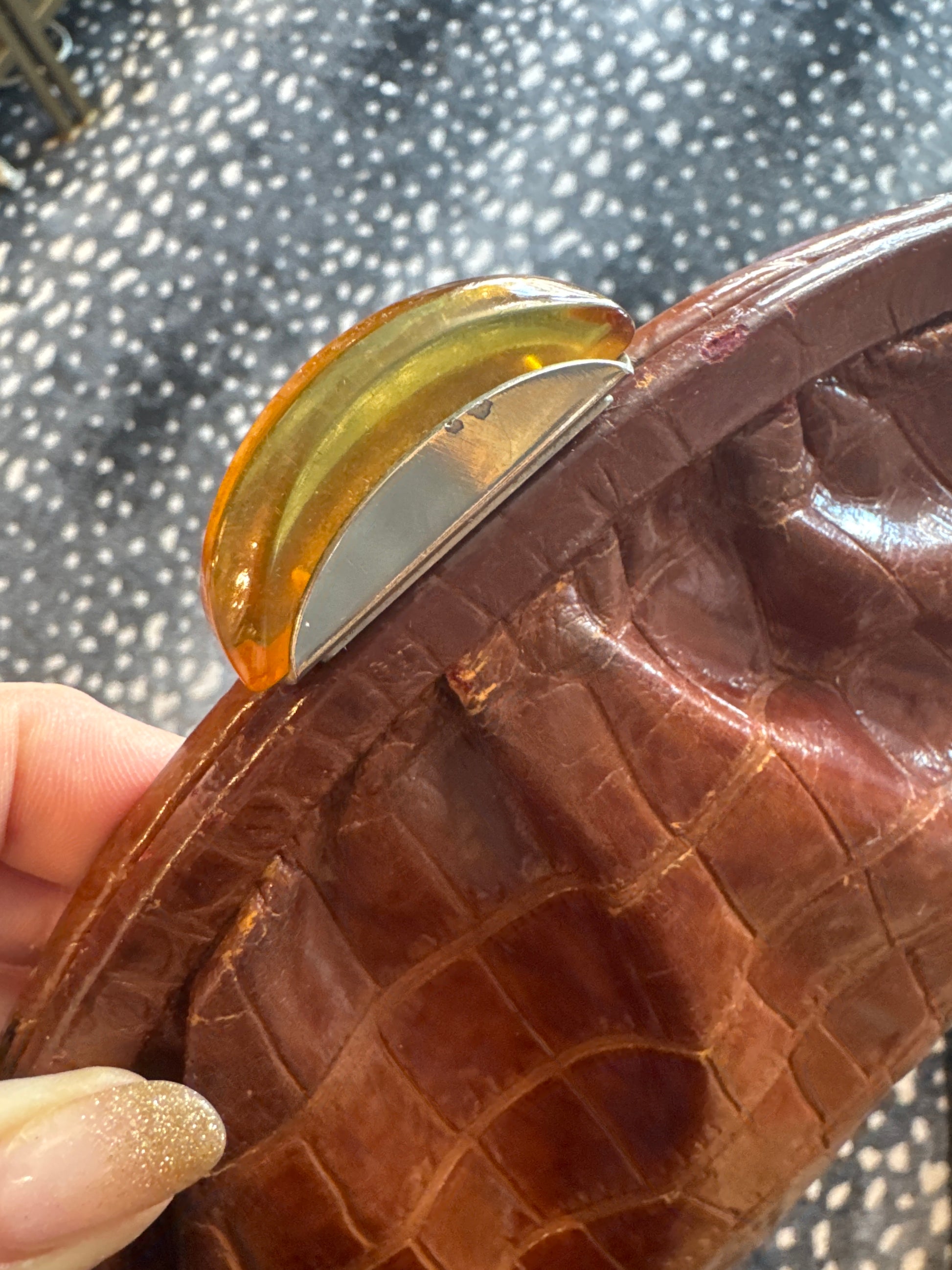 Stunning 1940s brown alligator extra long clutch with lucite clasp