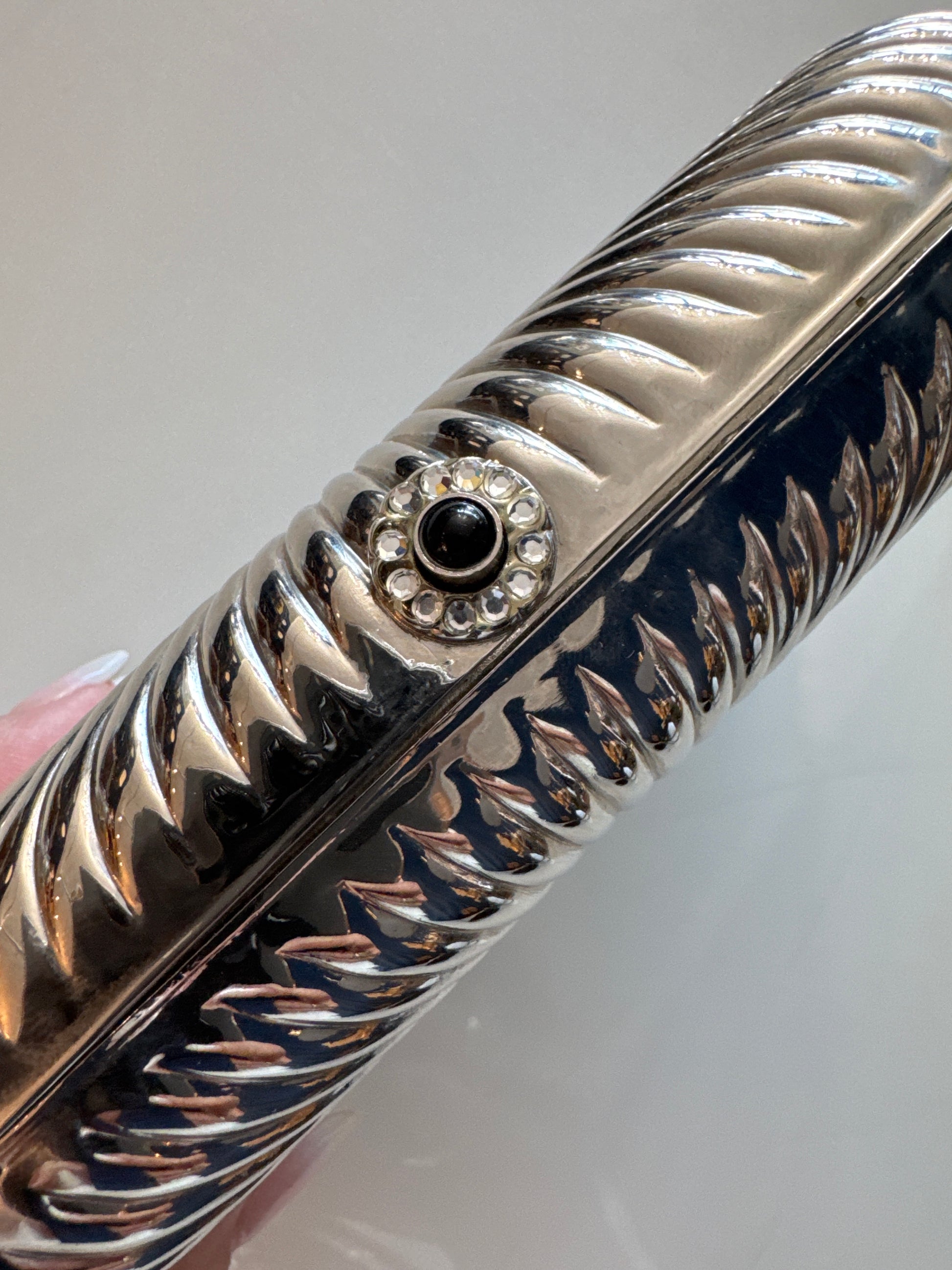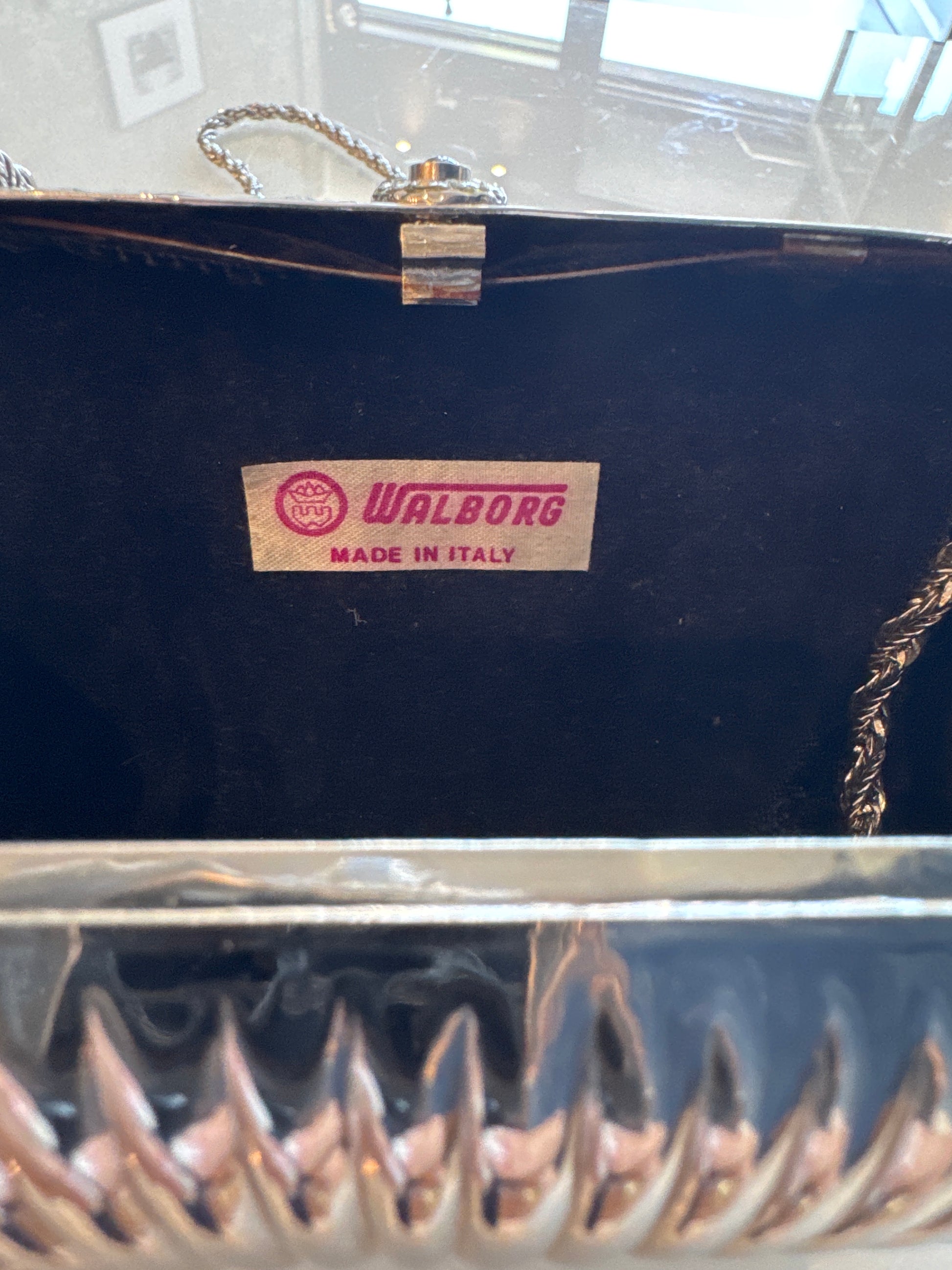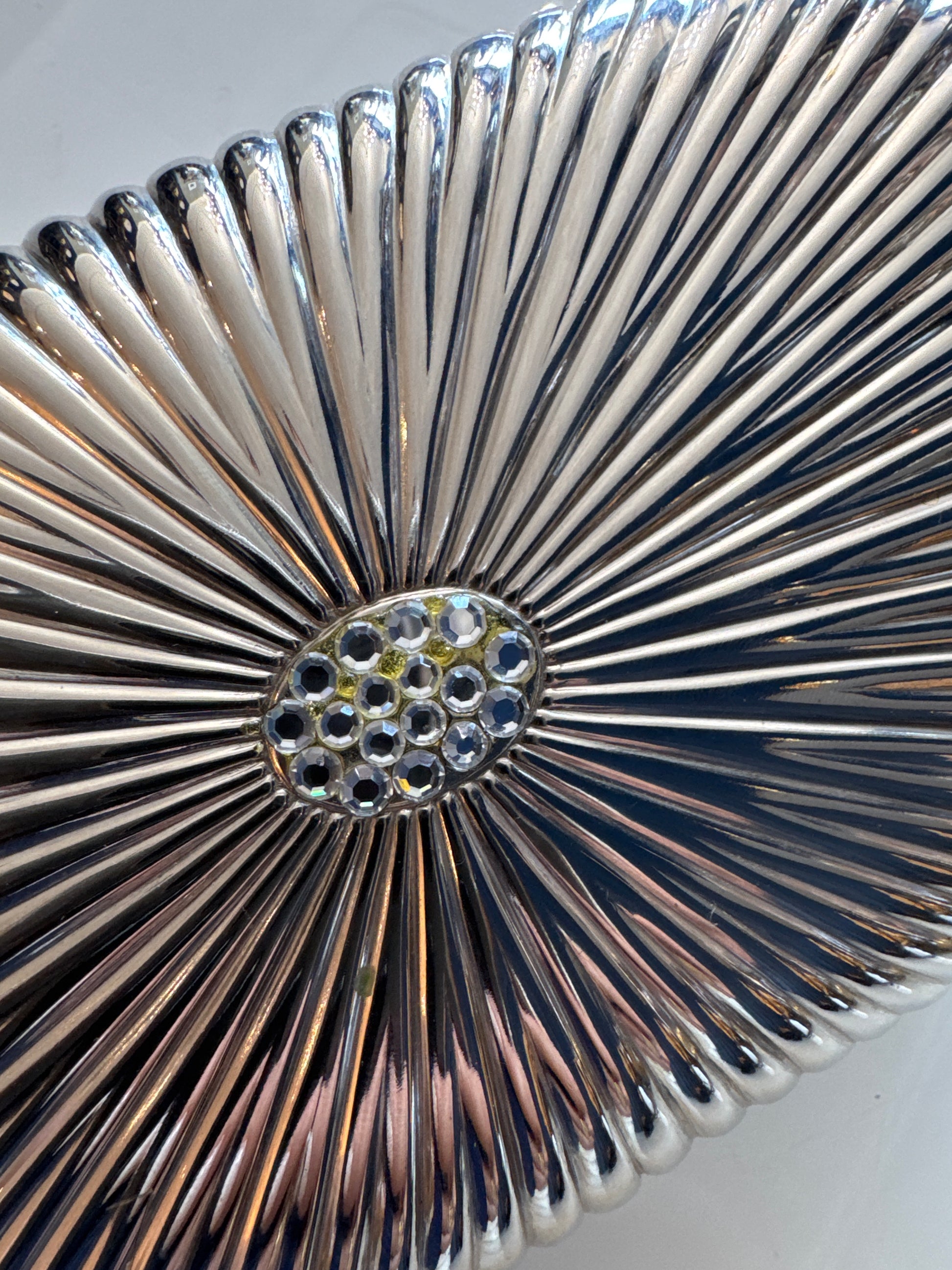 Stunning 1940s Walborg silver hardtop clutch with optional chain. Clear rhinestones in center - black on push top