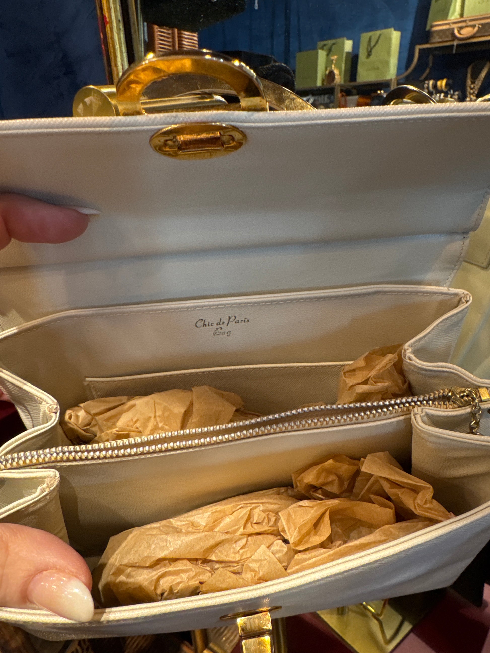 Stunning 1960s ivory and gold top handle handbag. designed by Chic de Paris