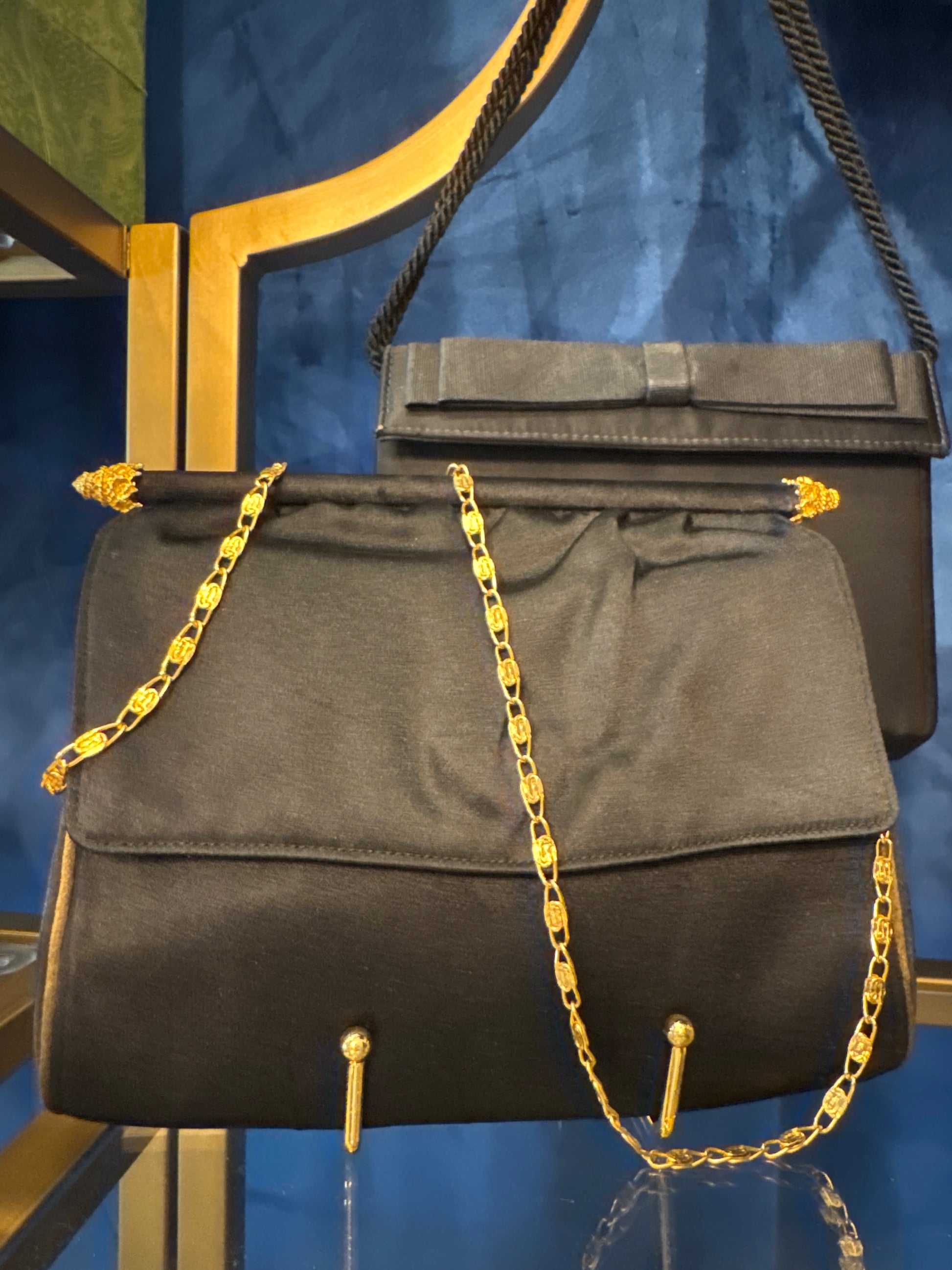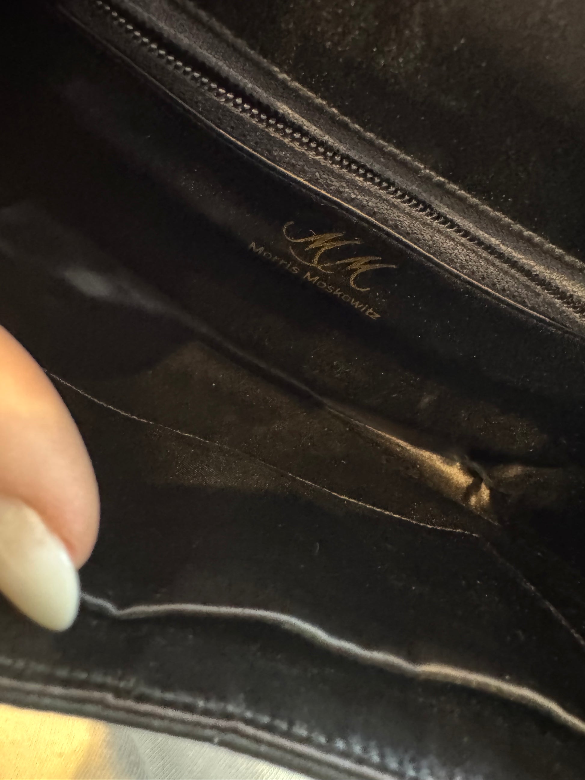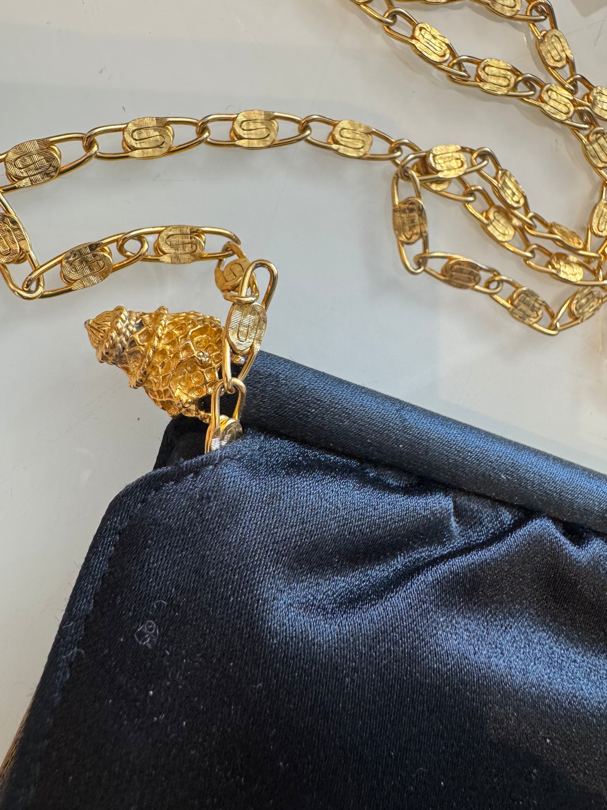 Stunning black satin 1950s Morris Moskowitz handbag with beautiful gold hardware and gold chain