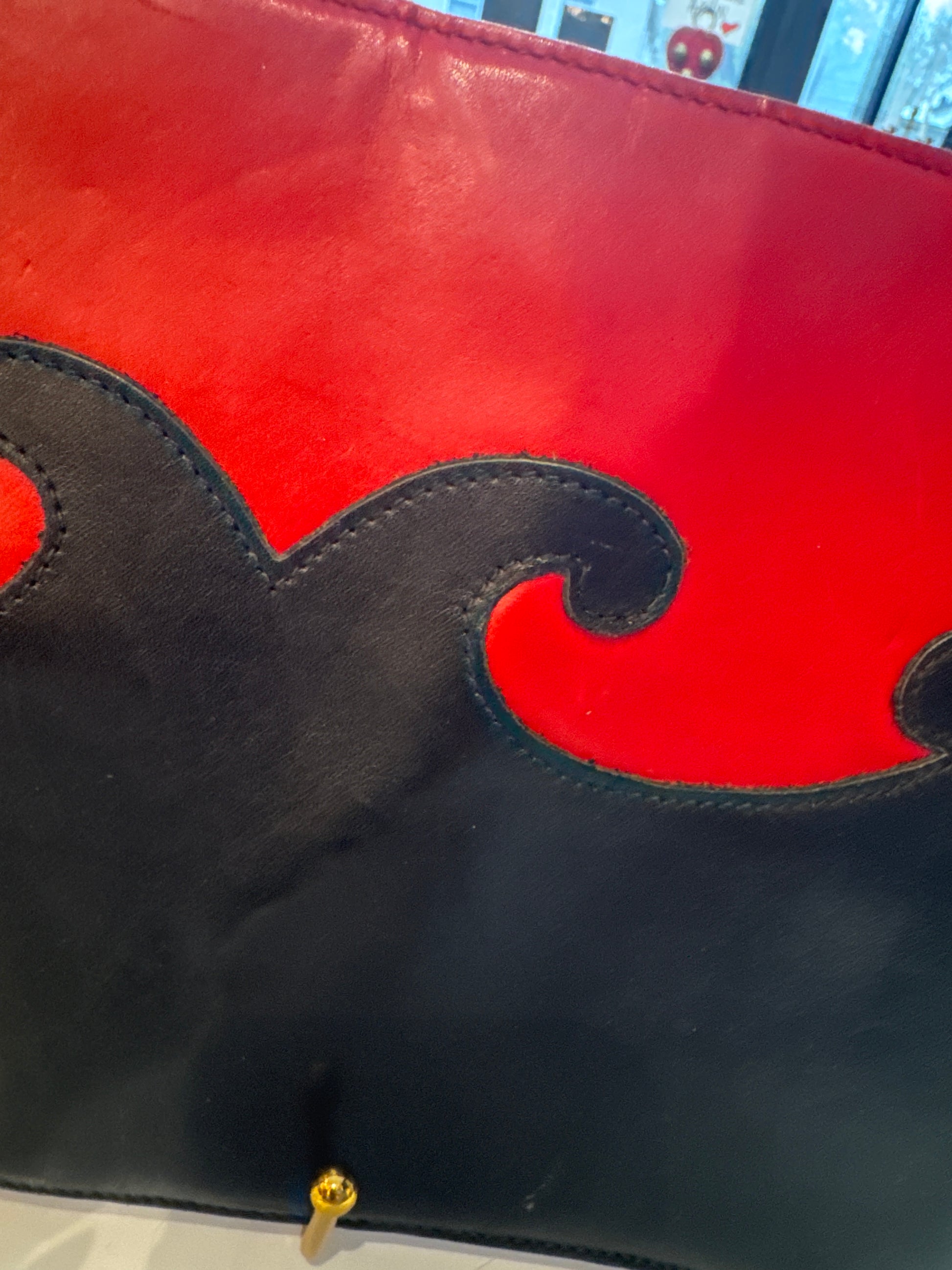 stunning vintage 1980s buttery leather CHRISTIAN LACROIX clutch bag in red and black with jewel zipper pull