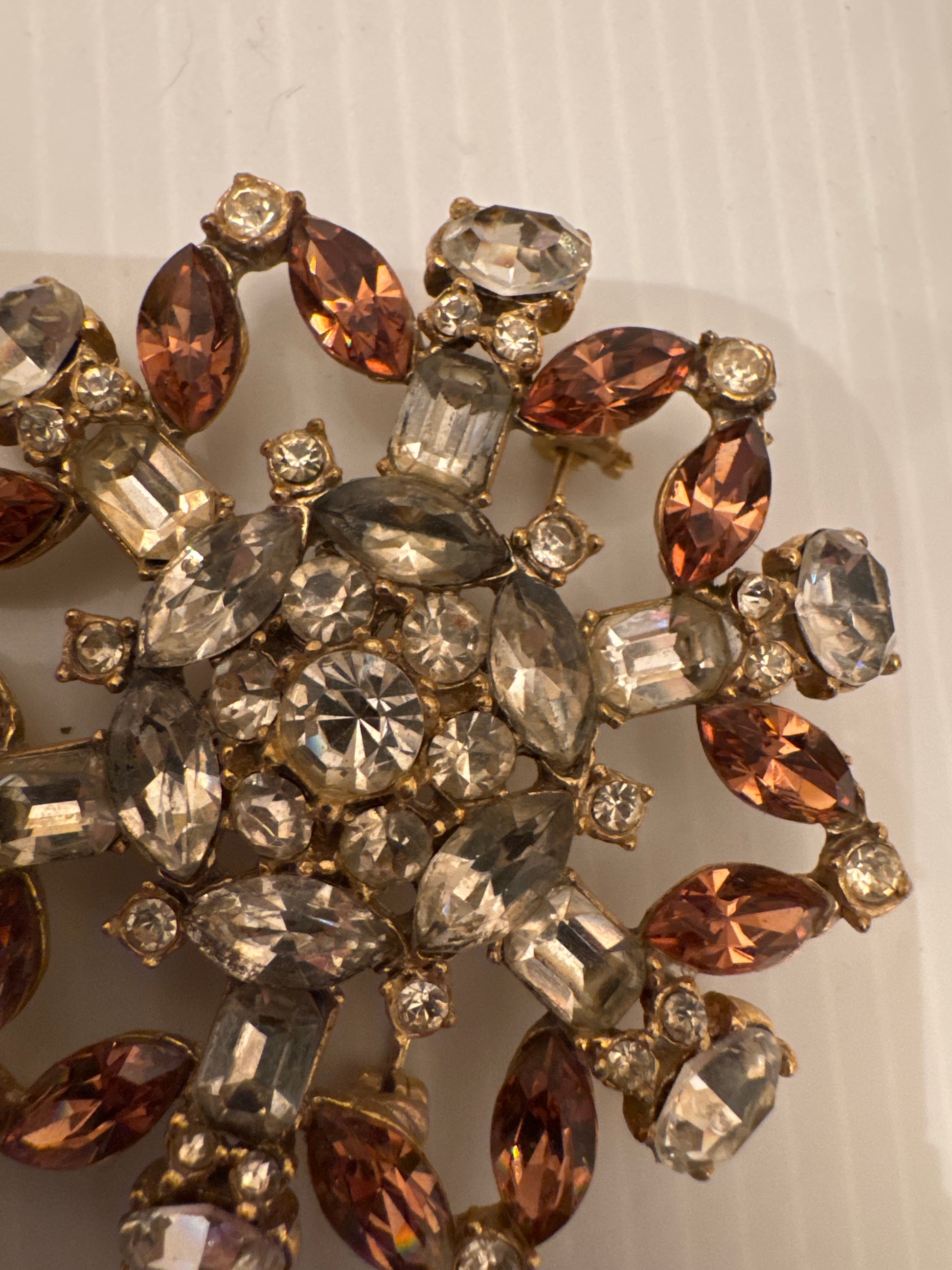 Unsigned brooch attributed to Schreiner New York, circa late 1950s. Identified by its unfoiled stones (creating a glow instead of a sparkle) dramatic mixed cuts, sculptural gold-tone casting, and signature dimensional construction